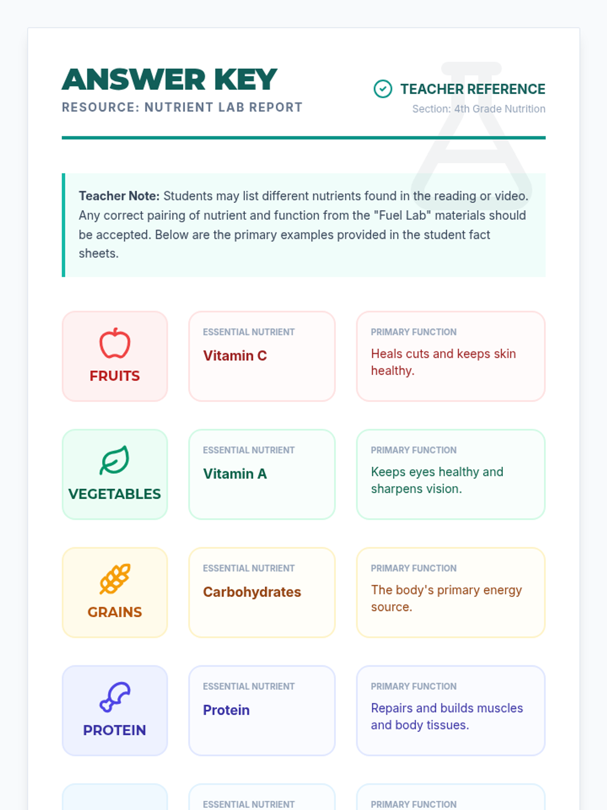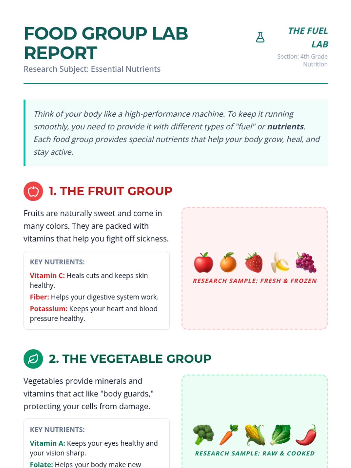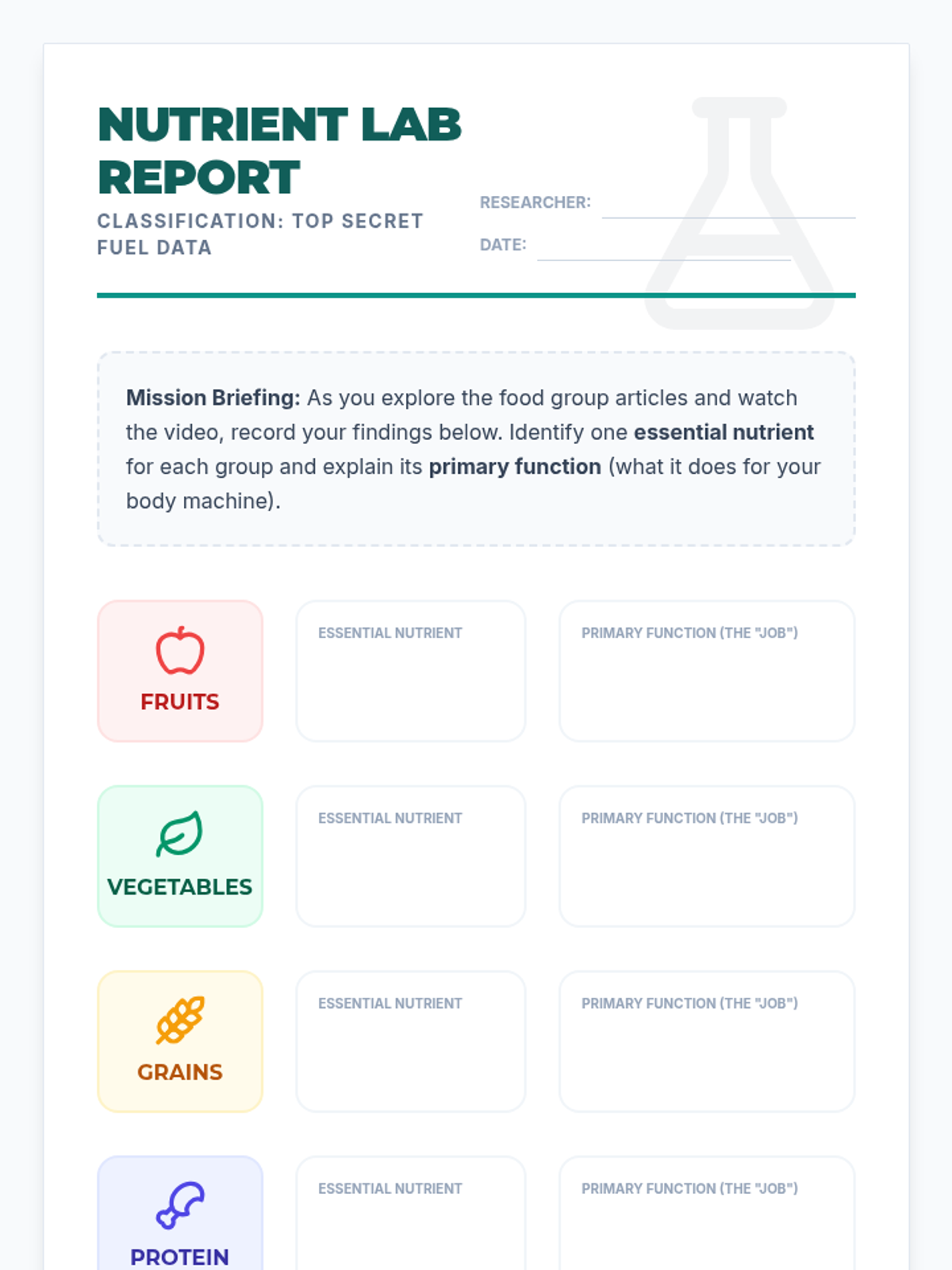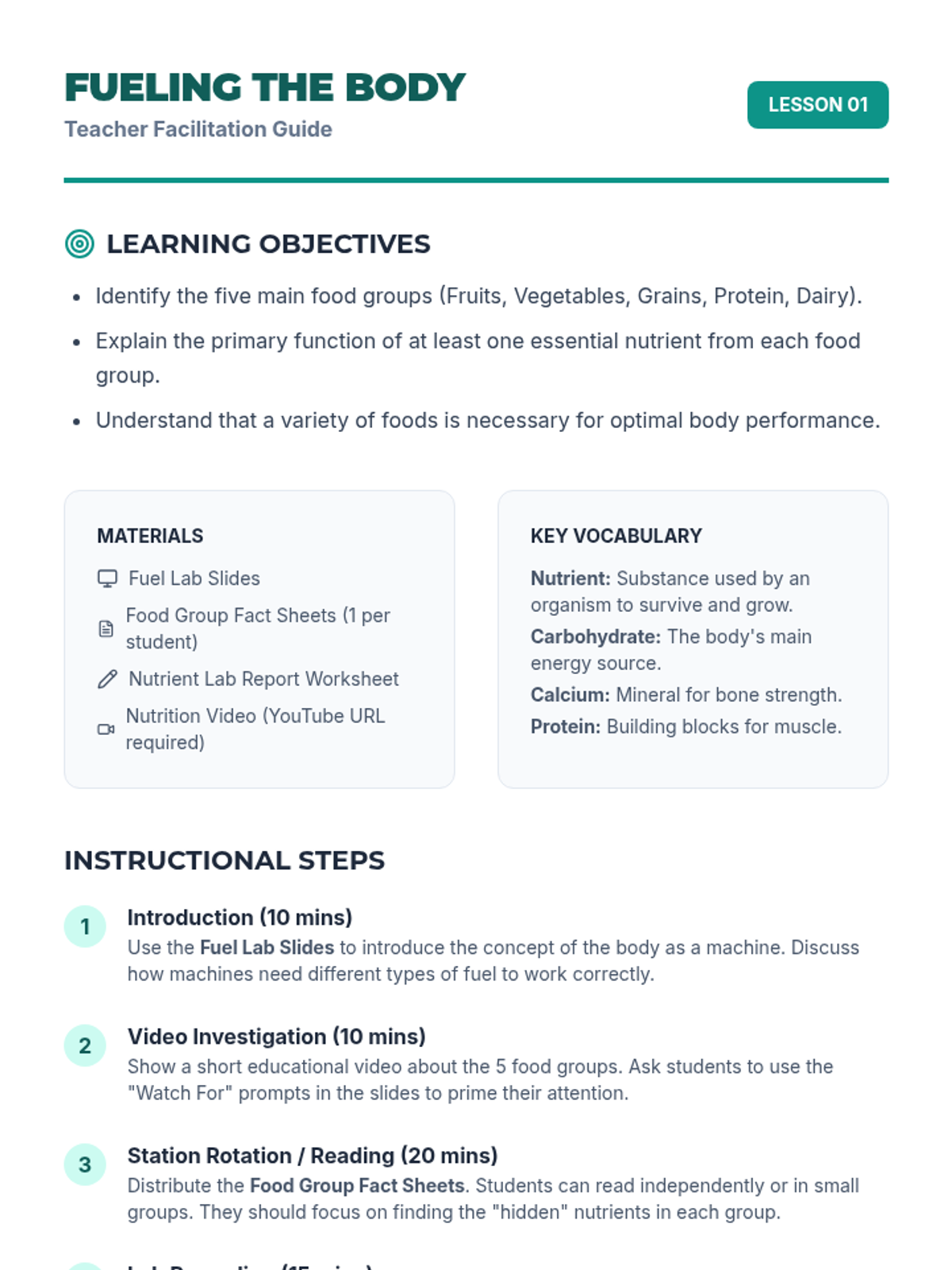 Students explore the five main food groups and the specific nutrients each provides to help the body function at its best. This lesson includes reading materials, a hands-on worksheet, and a visual presentation.
