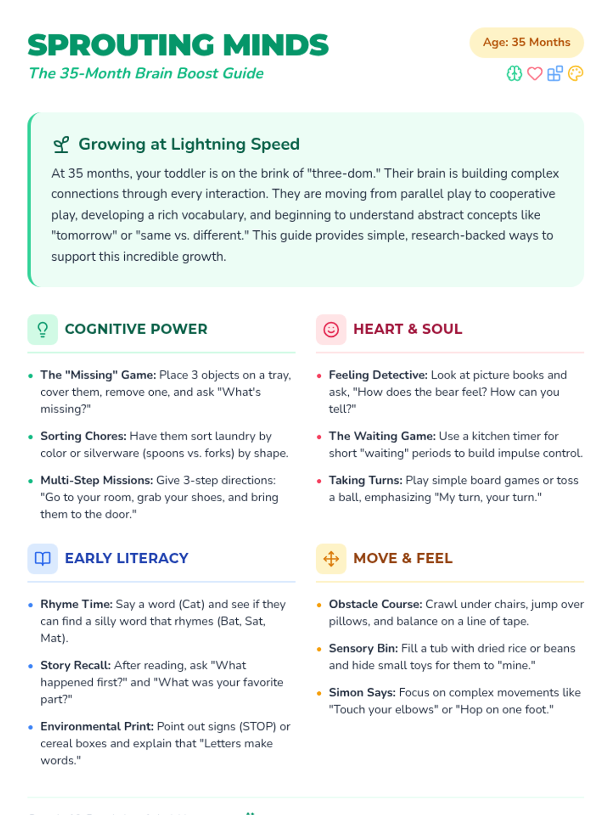 A comprehensive resource set for parents of 35-month-olds, focusing on cognitive, social-emotional, and physical milestones through play-based learning.