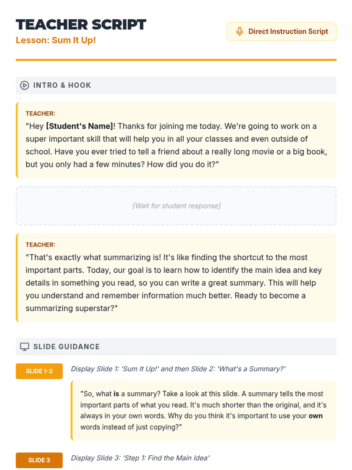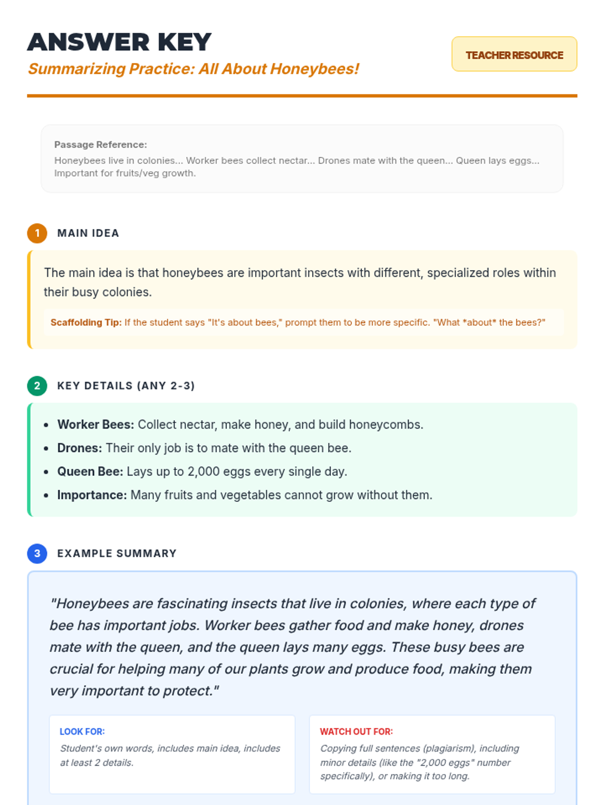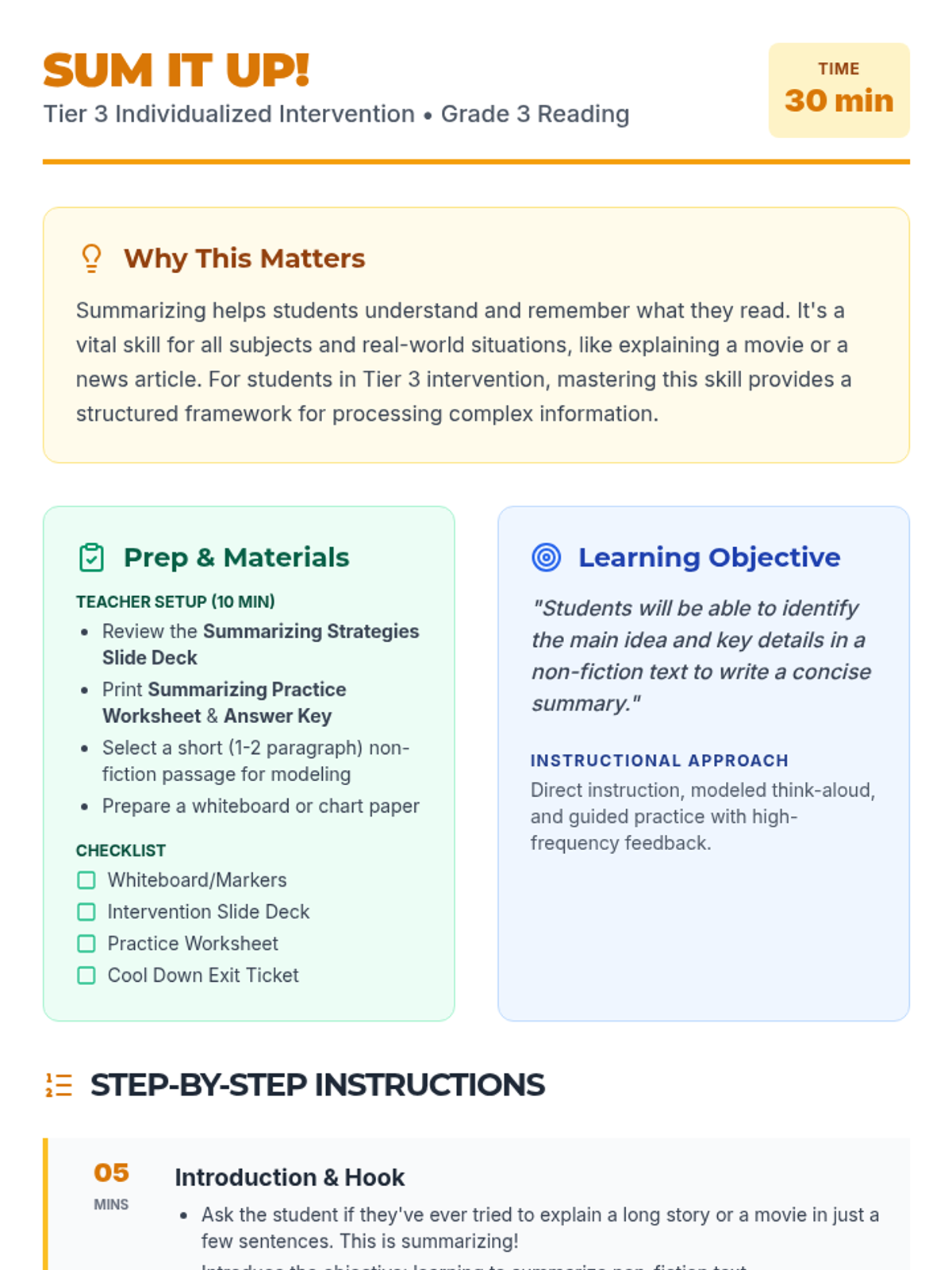 An individualized Tier 3 lesson for 3rd-grade students to master summarizing non-fiction texts by identifying the main idea and key details.