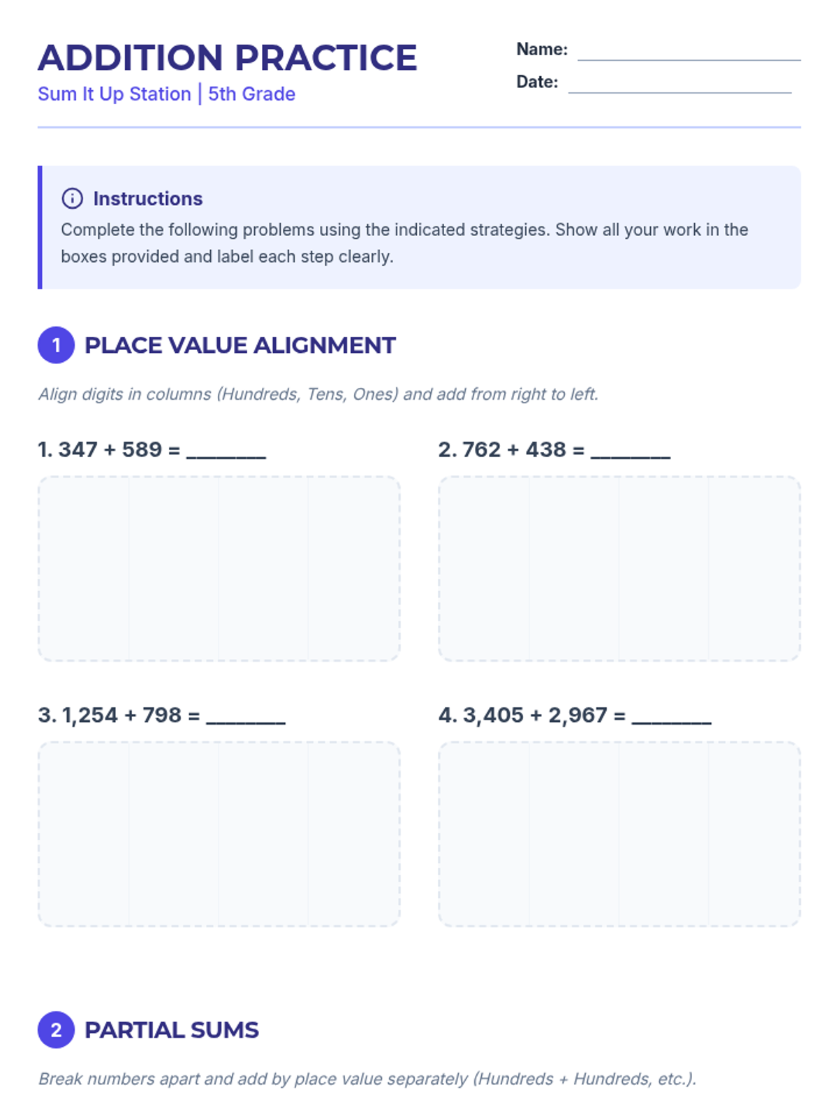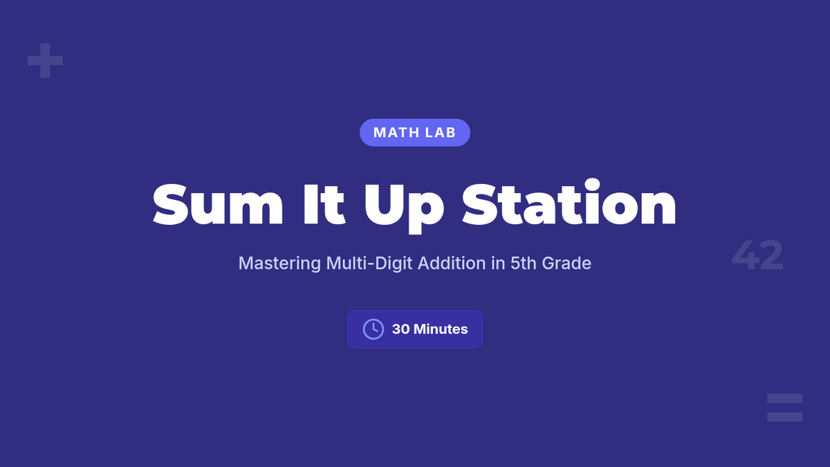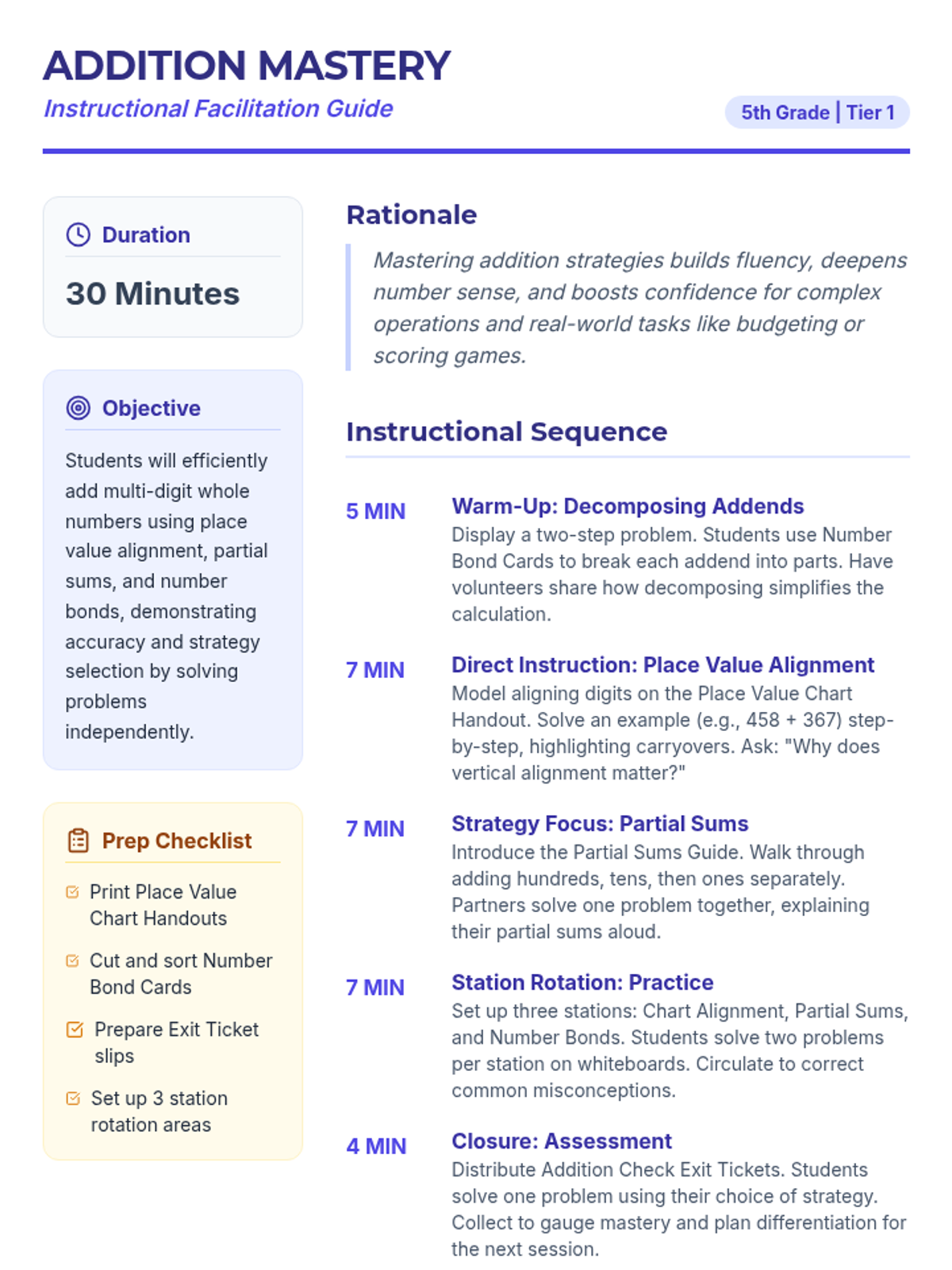 A 30-minute Tier 1 lesson for 5th graders to master multi-digit addition using place value alignment, partial sums, and number bonds. Students move through stations to build fluency and confidence in mathematical operations.
