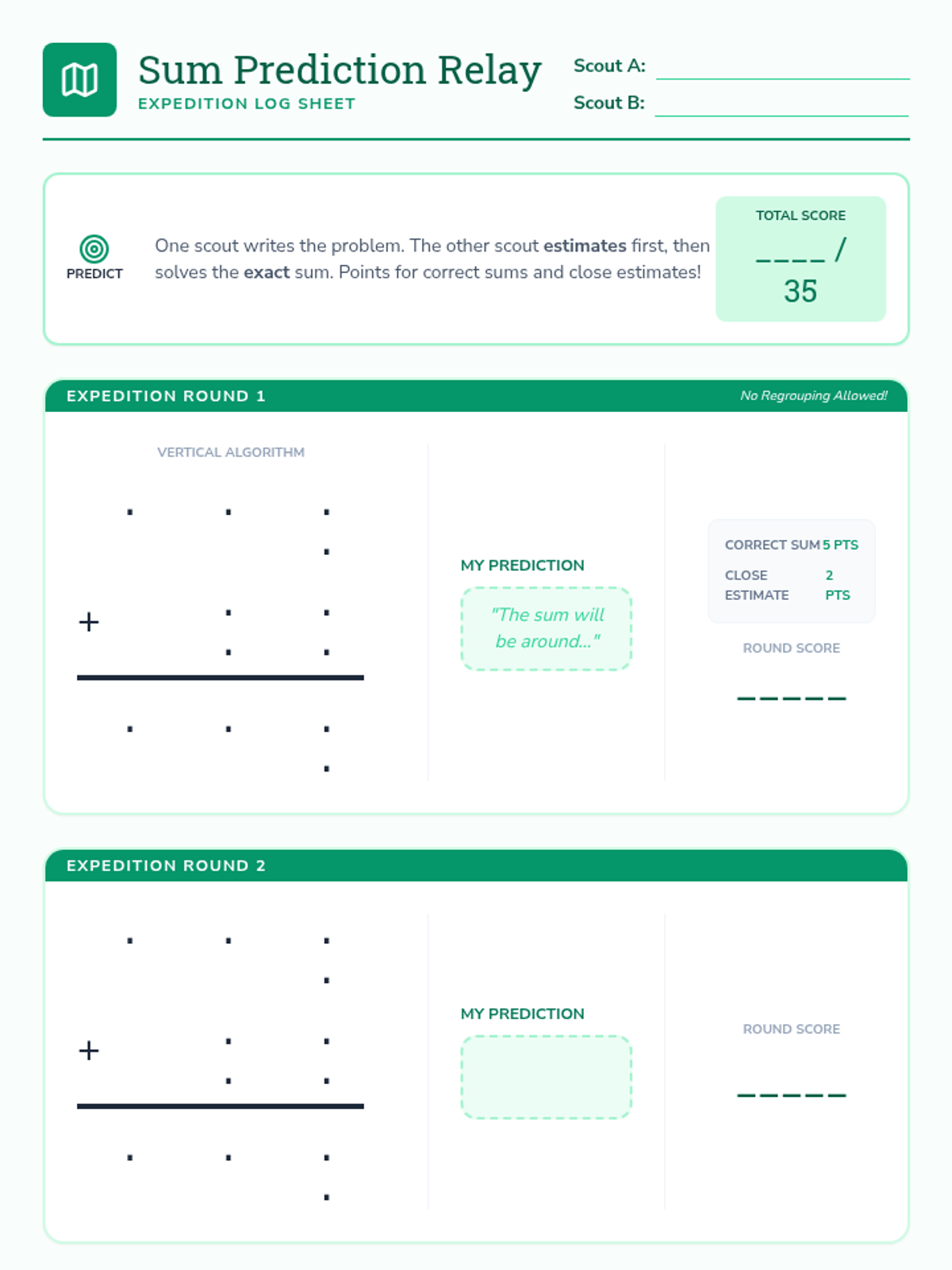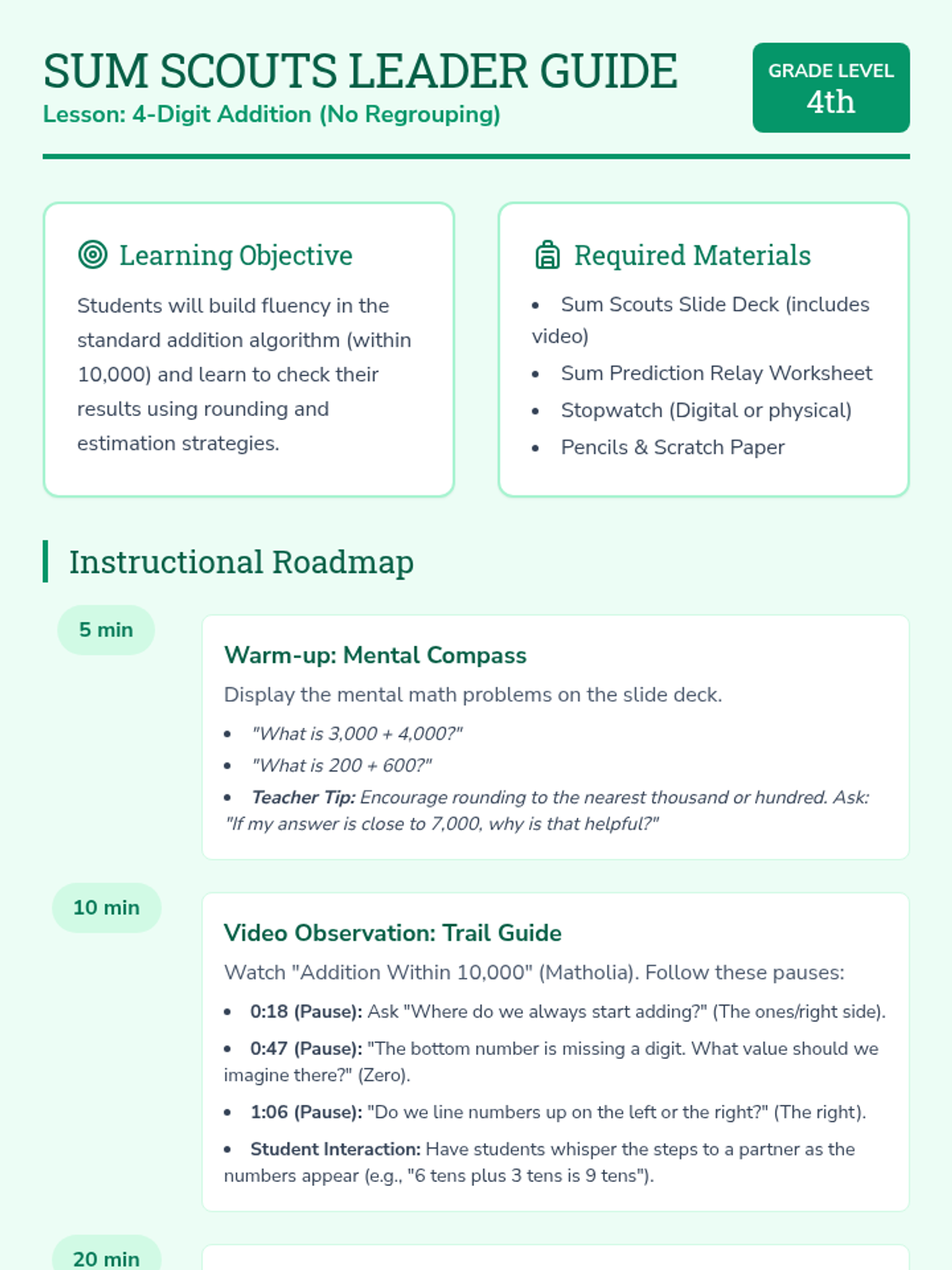 A 4th-grade math lesson focused on 4-digit addition without regrouping, featuring estimation as a verification tool. Students use a "Sum Prediction Relay" activity to build fluency and accuracy.
