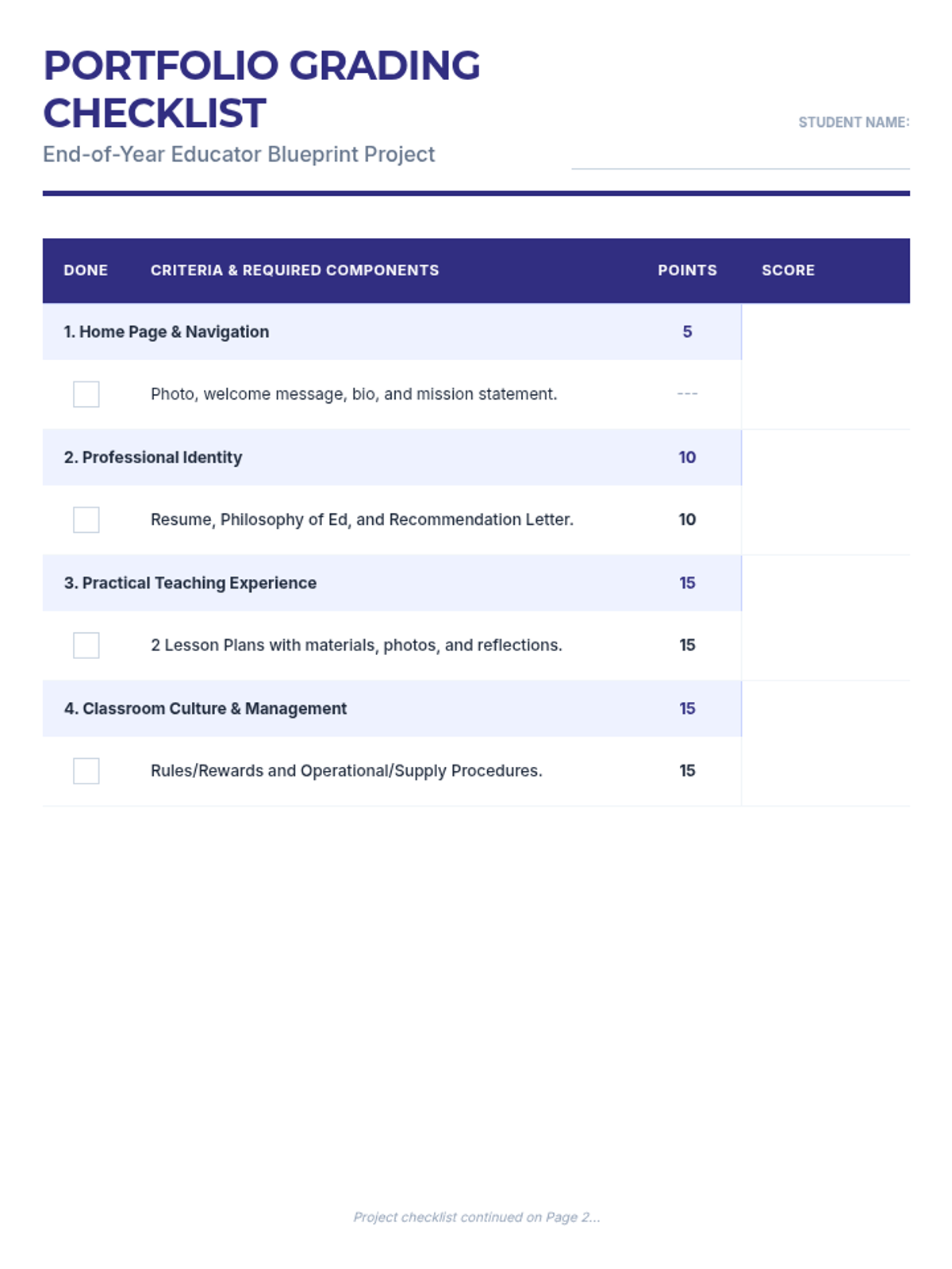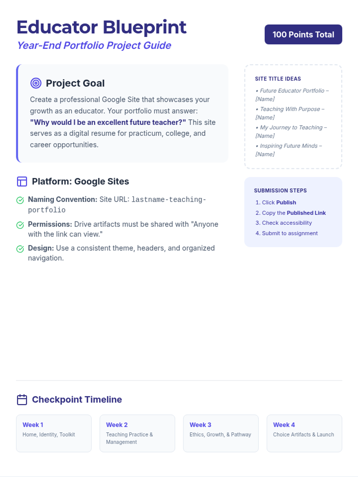 A comprehensive end-of-year portfolio project for Instructional Practices students, combining professional documentation, practical teaching evidence, and reflections on educational ethics and pathways. Students create a professional Google Site that showcases their journey and readiness for a career in education.