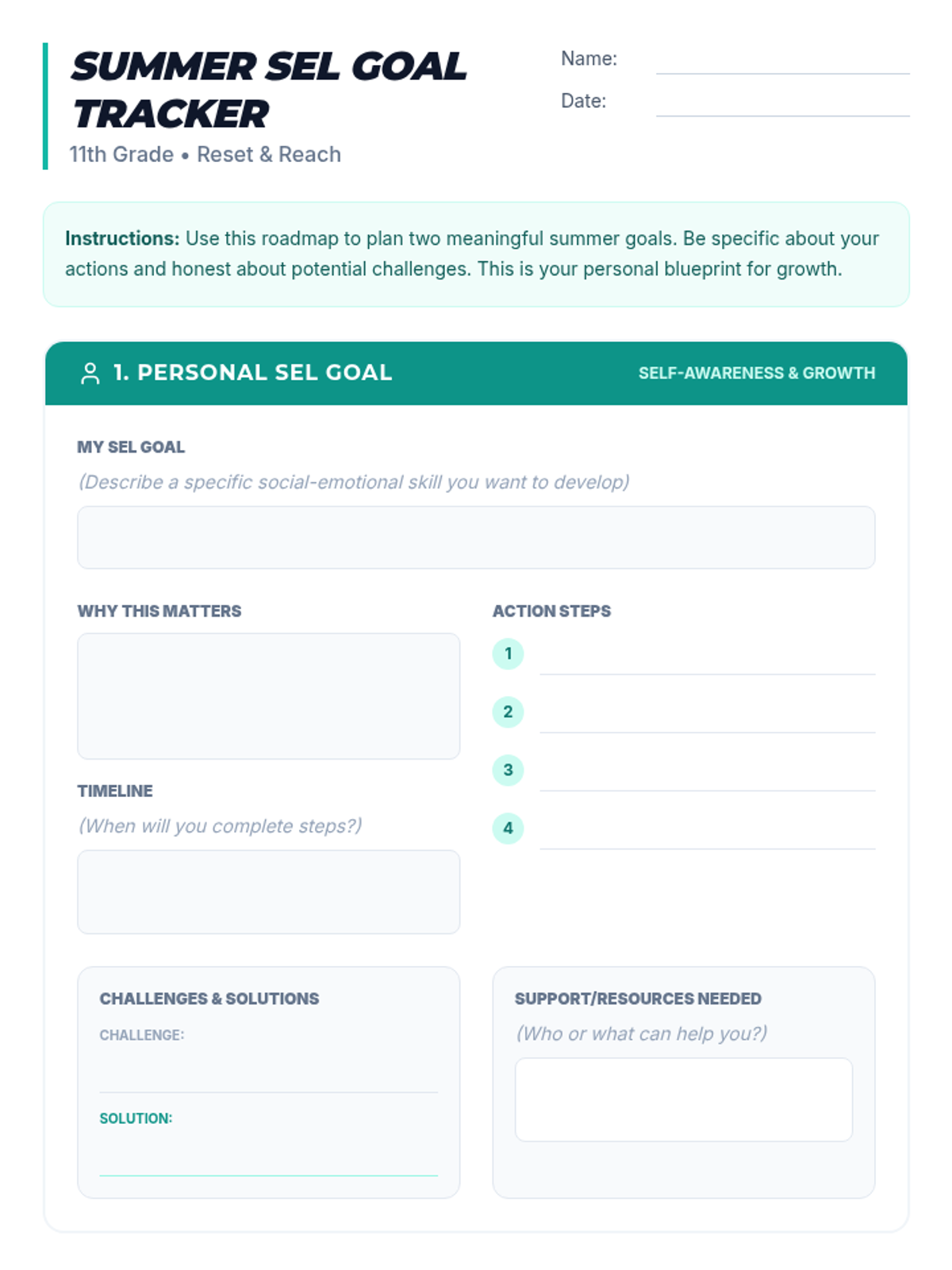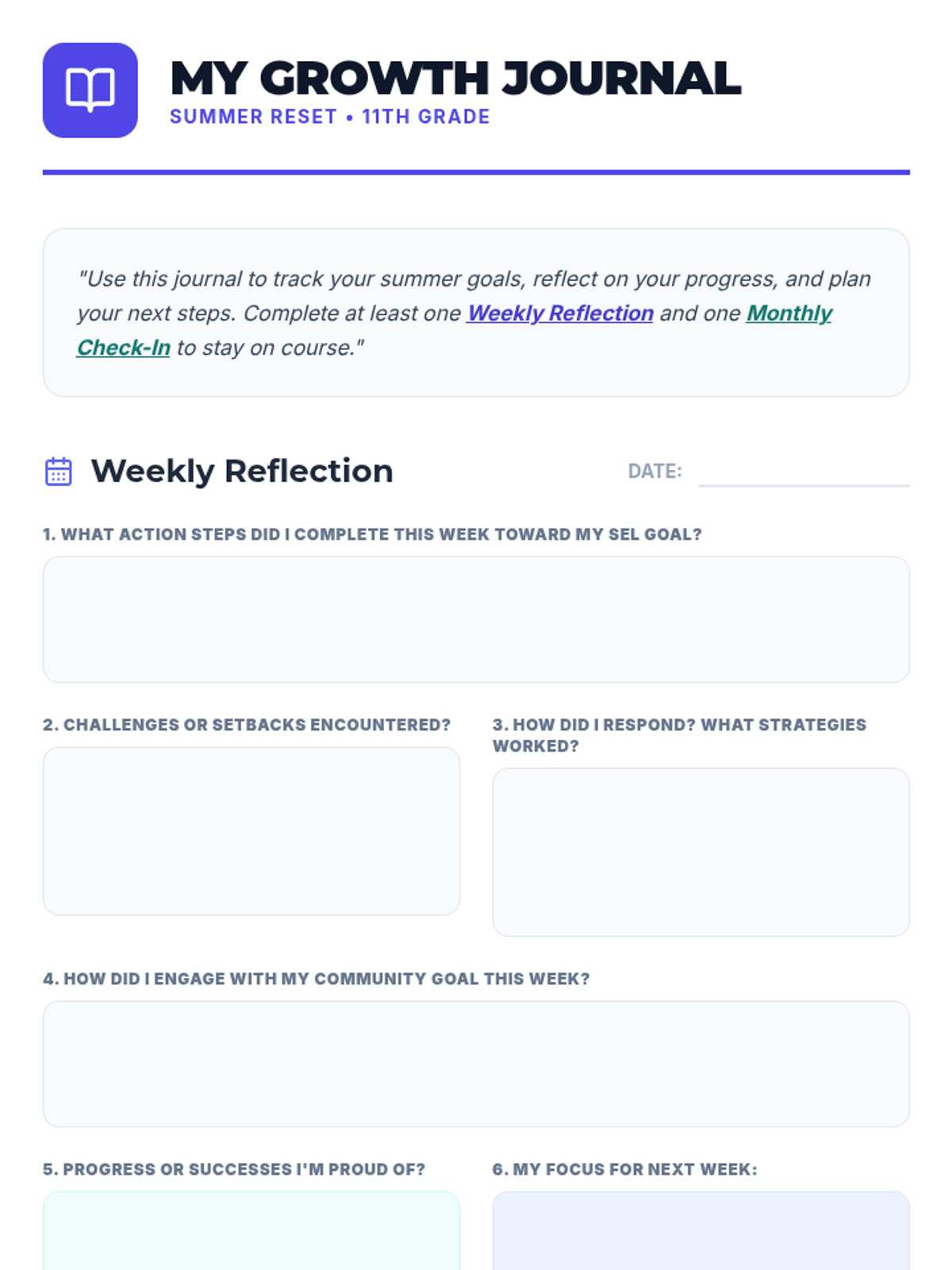 A 30-minute small-group session where 11th graders reflect on SEL strengths and set actionable summer goals for personal growth and community engagement.