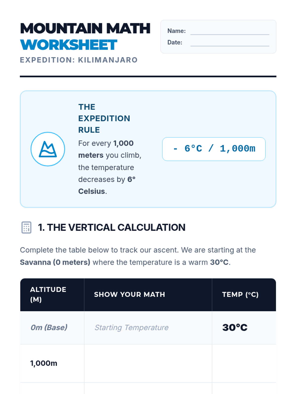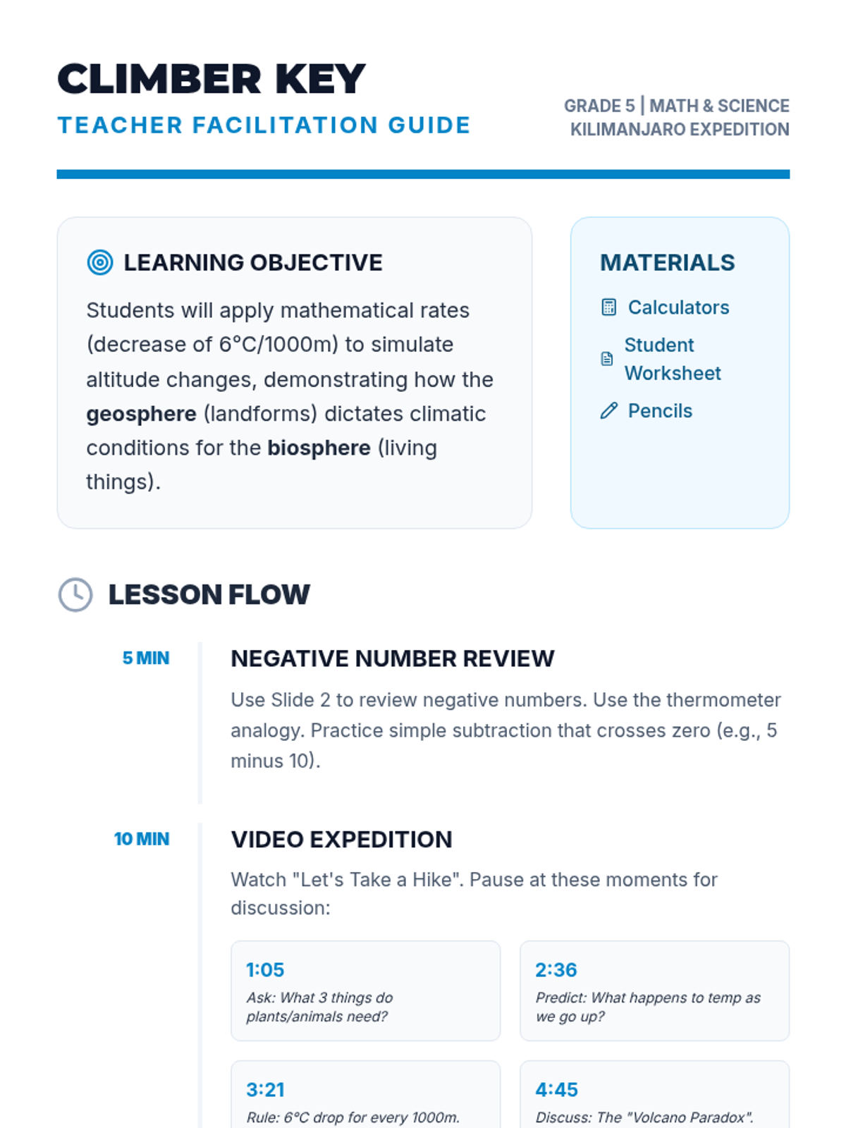 Students explore the interaction between the geosphere and biosphere by calculating temperature drops at various altitudes on Mount Kilimanjaro, linking mathematics (rates and negative numbers) with atmospheric science.