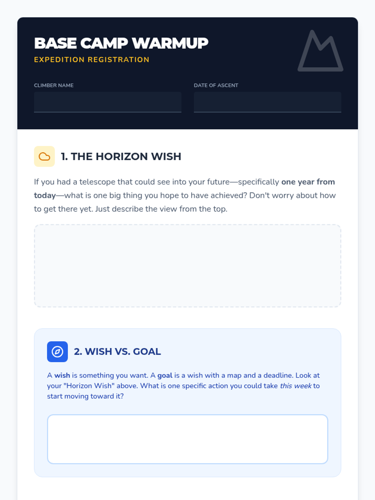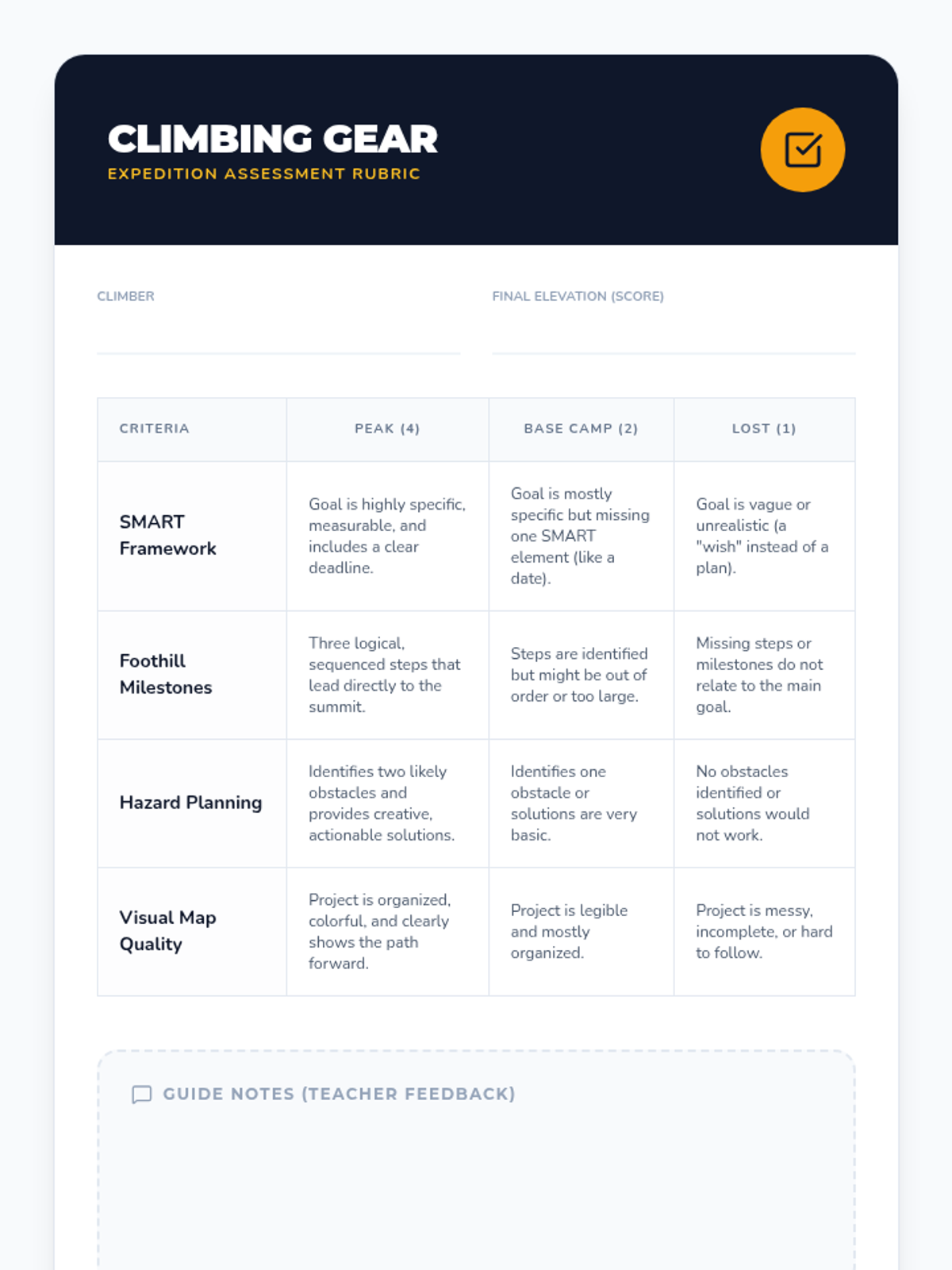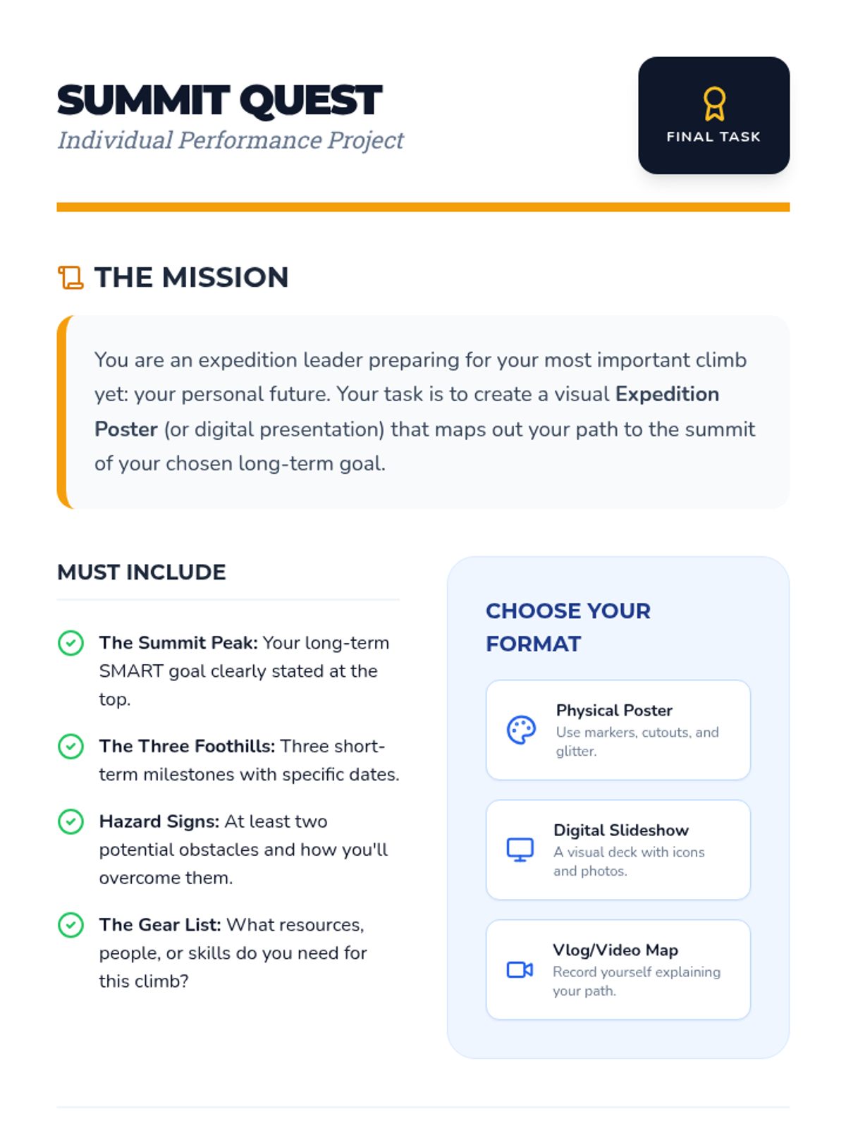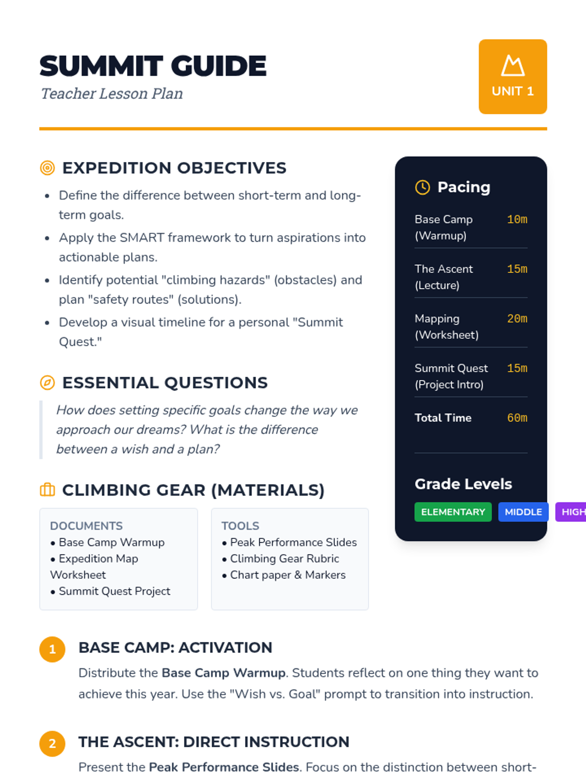 Students embark on a mountain-climbing themed journey to master goal setting. They will learn to distinguish between short-term and long-term goals, apply the SMART framework, and create a comprehensive expedition plan for their personal aspirations.