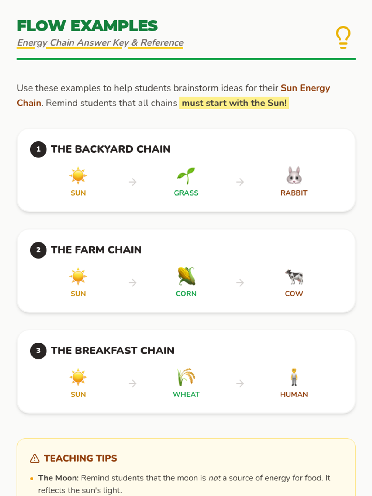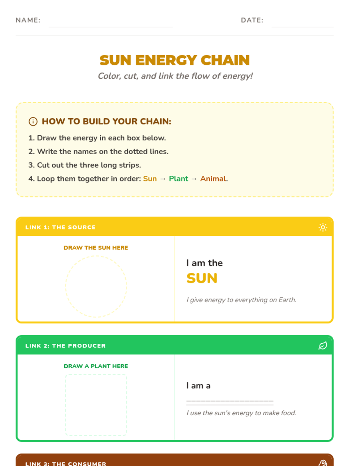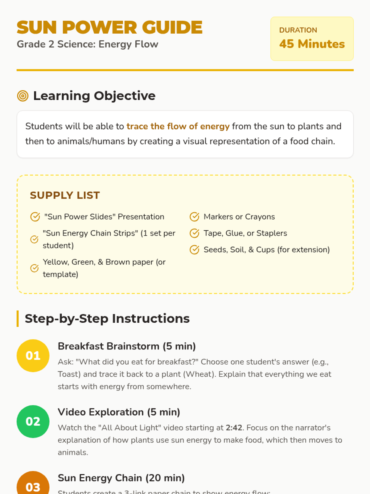 A 2nd-grade science lesson exploring how energy flows from the sun to plants and eventually to animals and humans, featuring a hands-on paper chain activity and a video exploration.