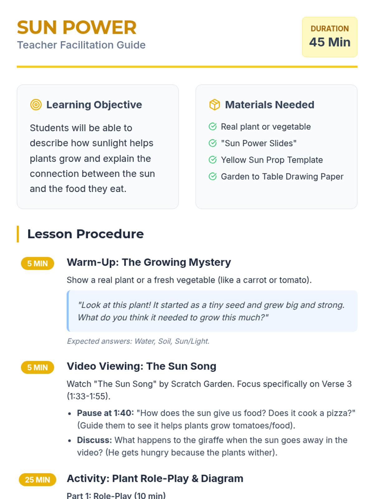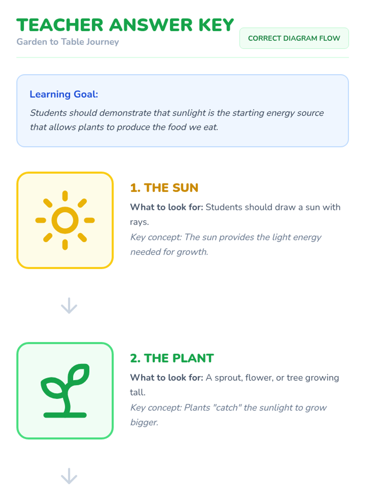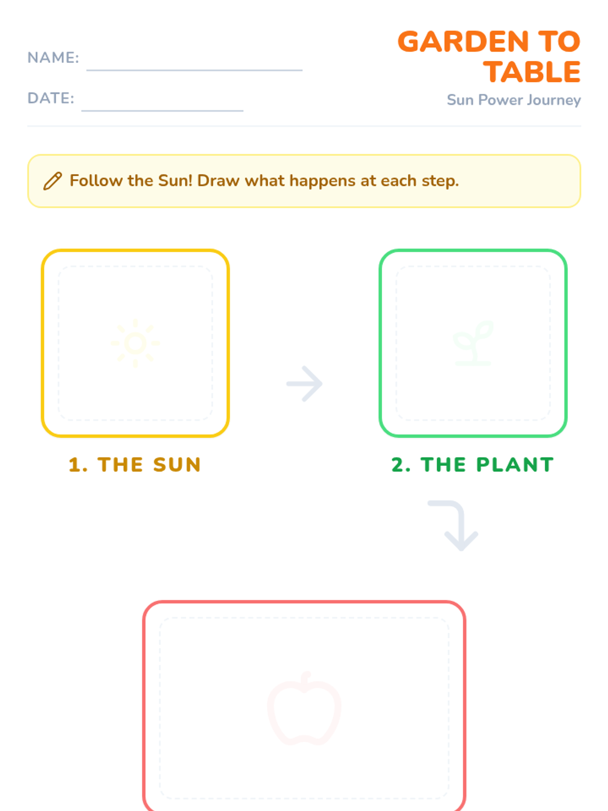 A 1st Grade science lesson exploring the vital connection between sunlight, plant growth, and the food we eat. Includes a video study, role-play activity, and diagram creation.