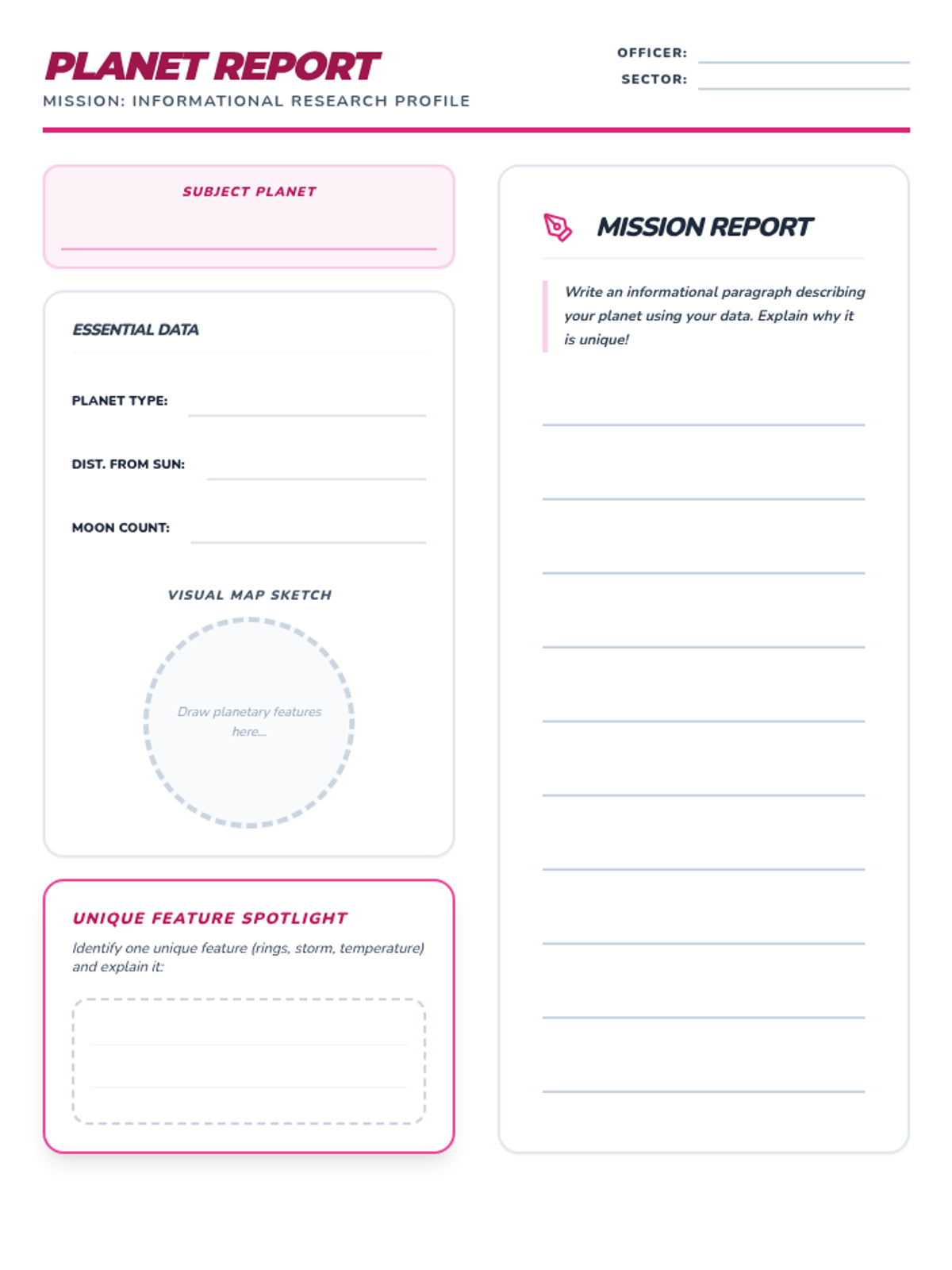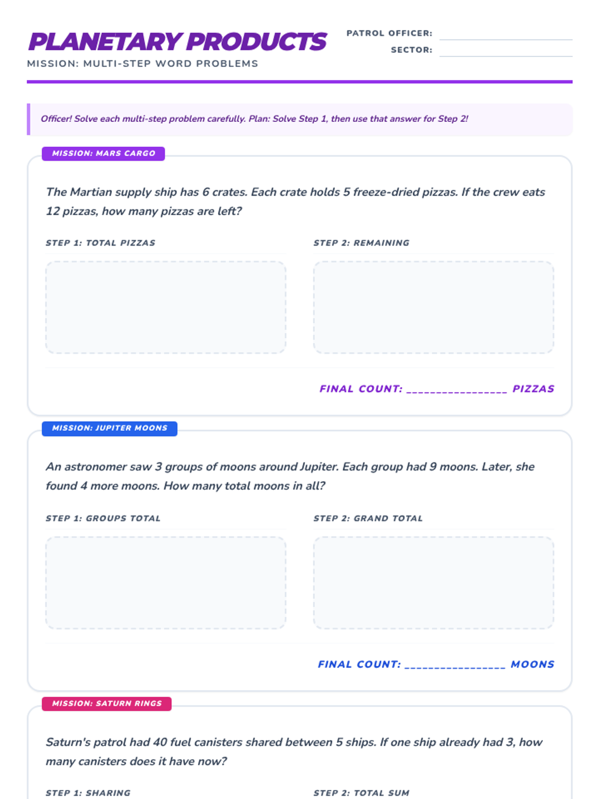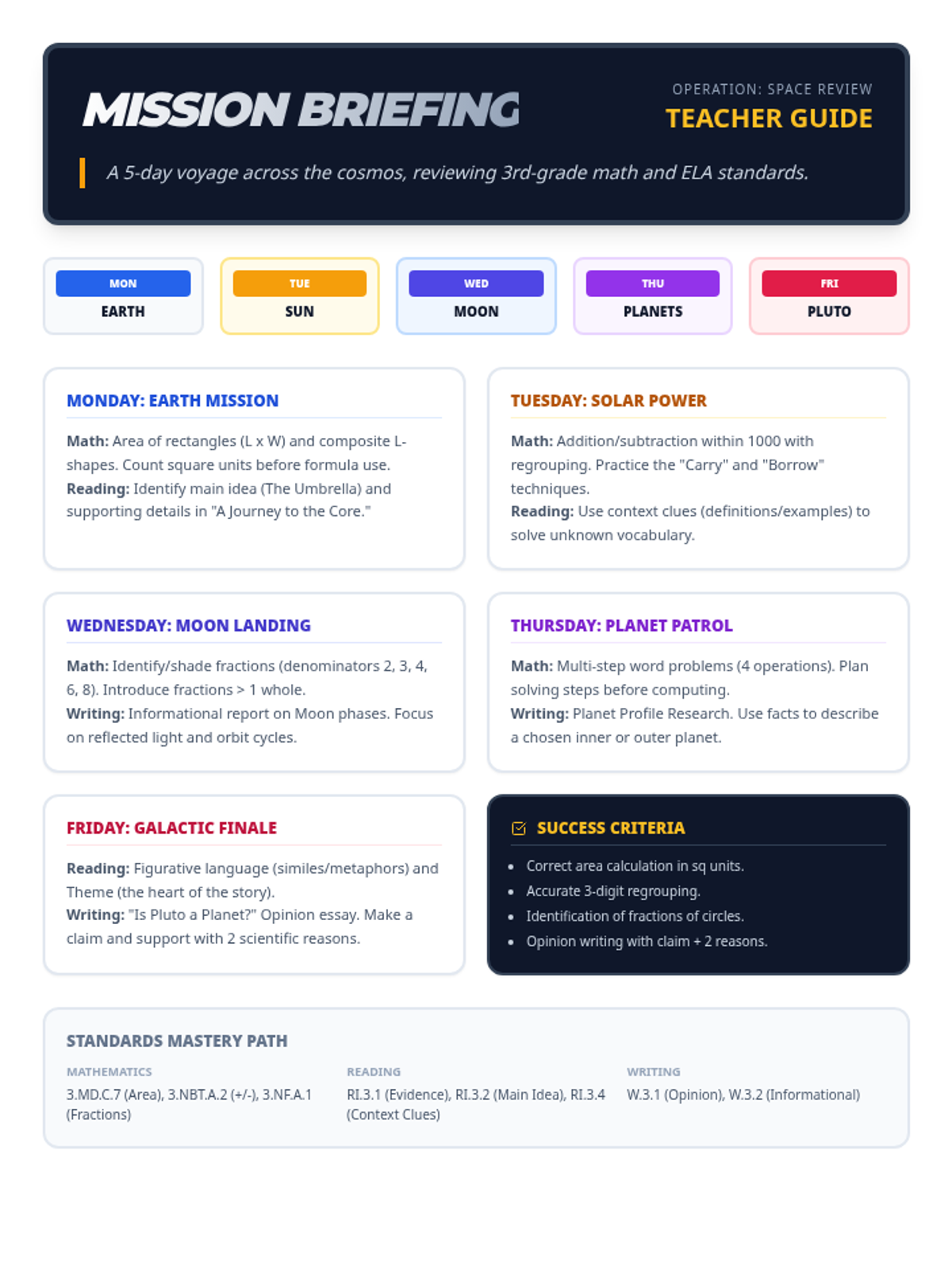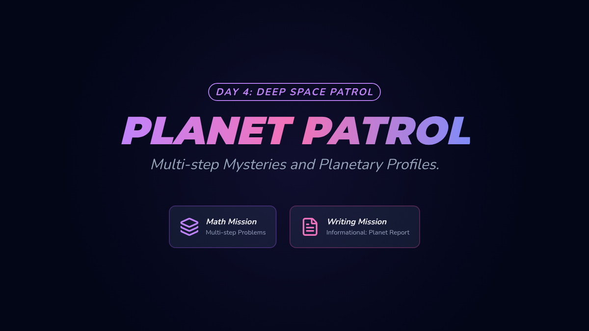 Focusing on the inner and outer planets. Math: Multiplication, division, and multi-step word problems. Writing: Informational planet report.