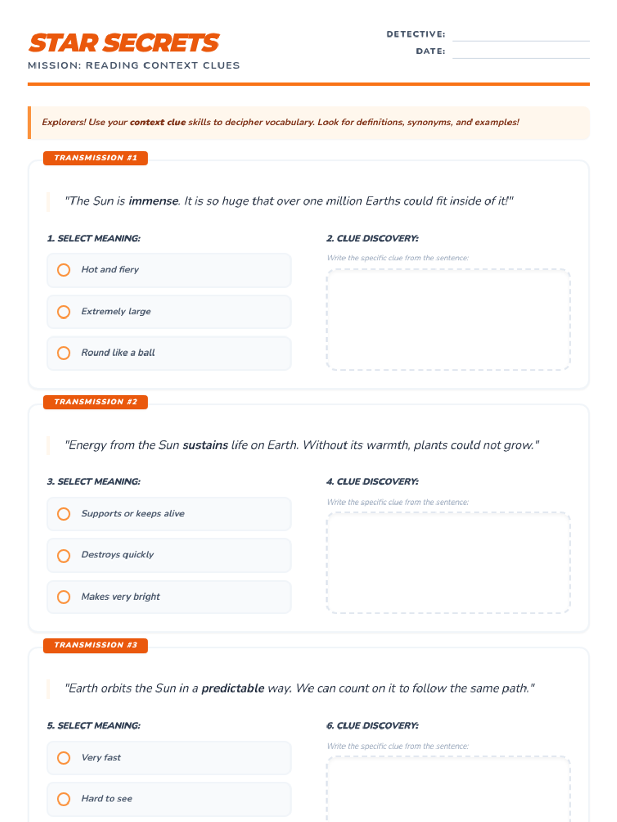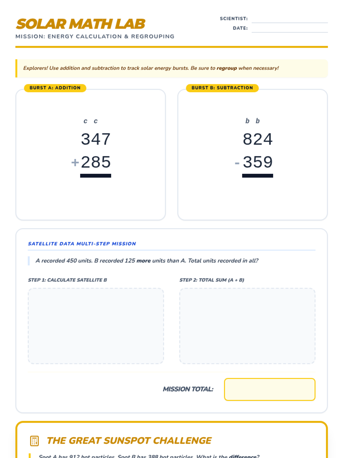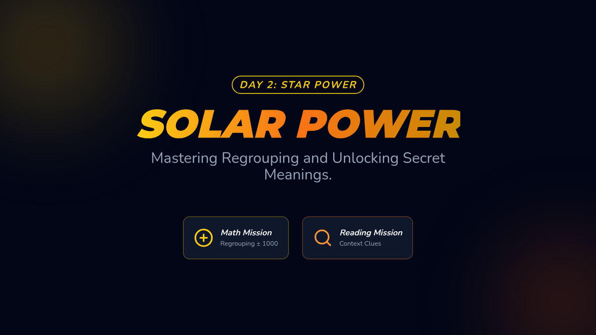 Focusing on the Sun. Math: Addition and subtraction with regrouping within 1000. Reading: Context clues.