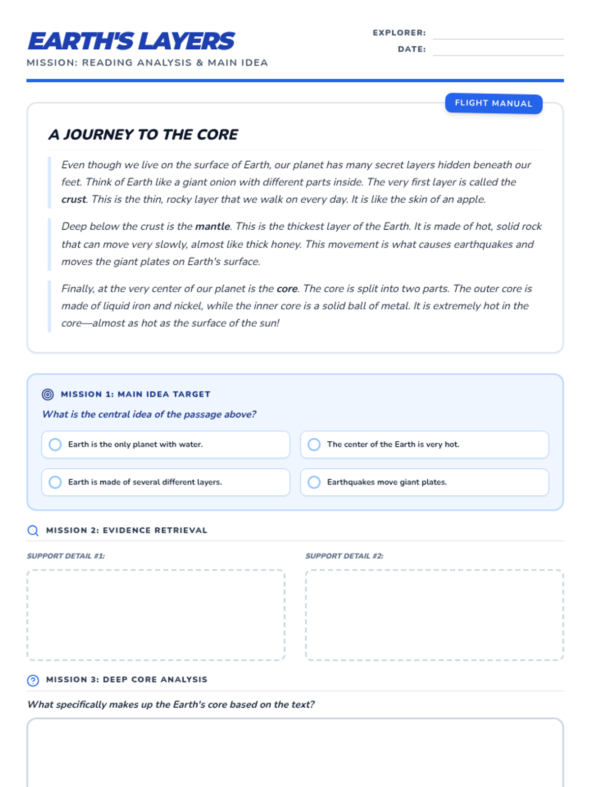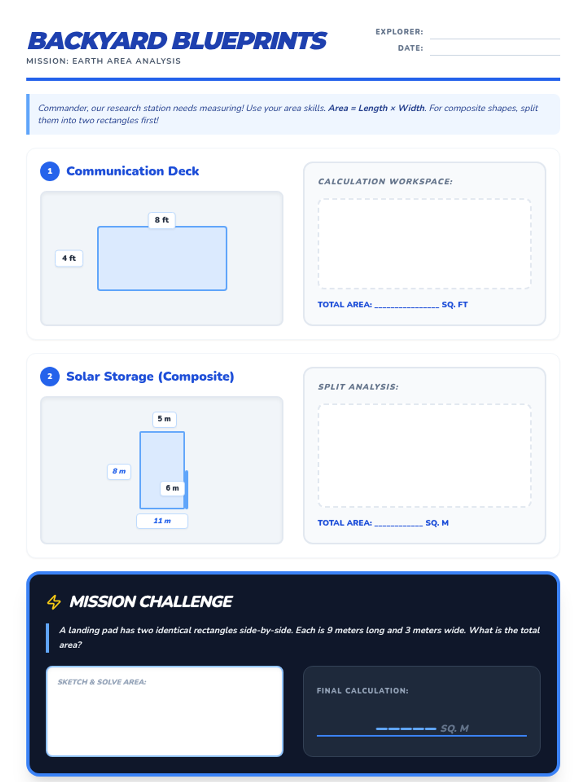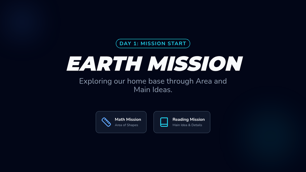 Introduction to the review week focusing on Earth. Math: Area of rectangles and composite figures. Reading: Main idea and details.