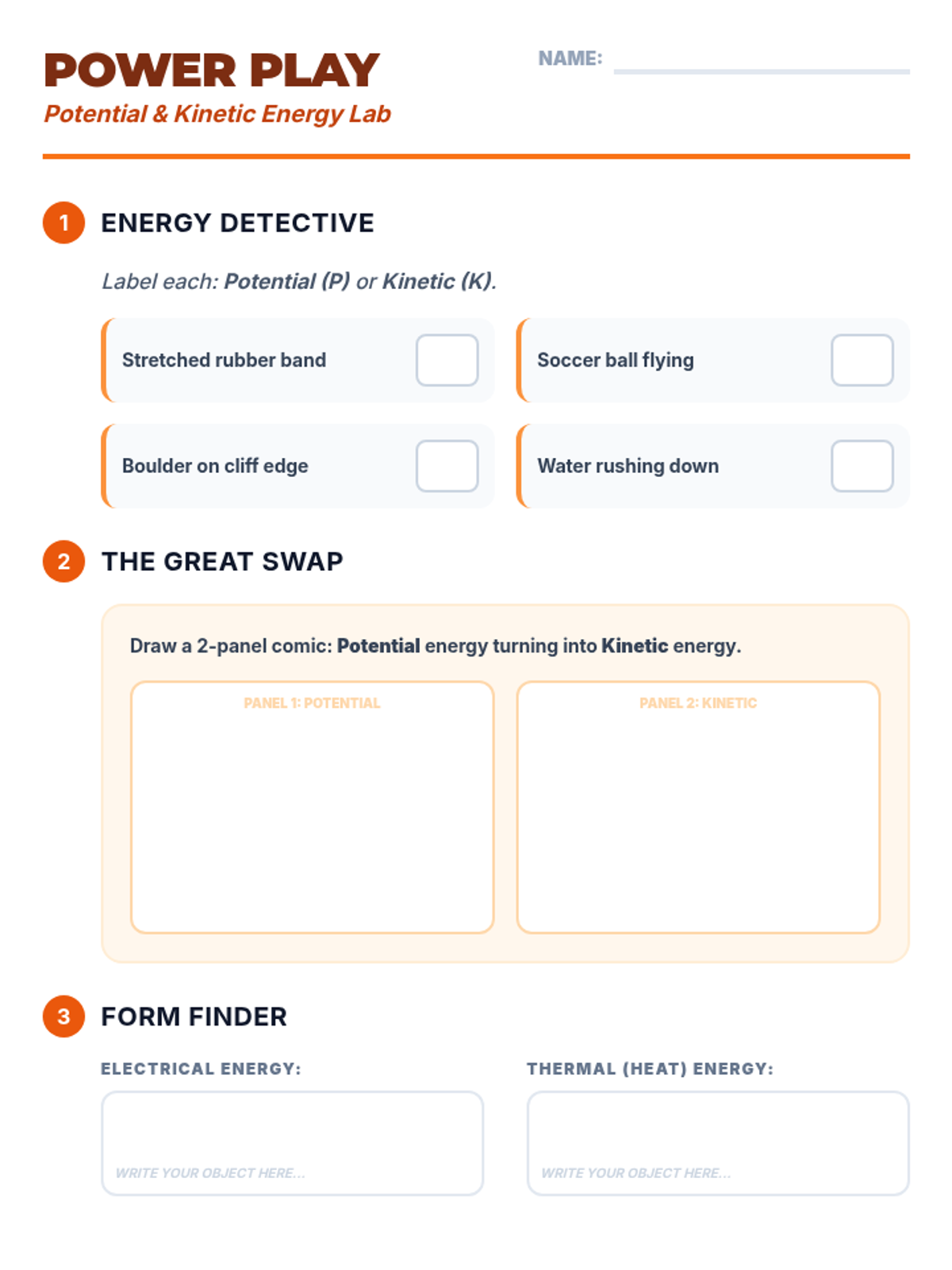 Investigate the different forms of energy and the transition between potential and kinetic energy through real-world examples.