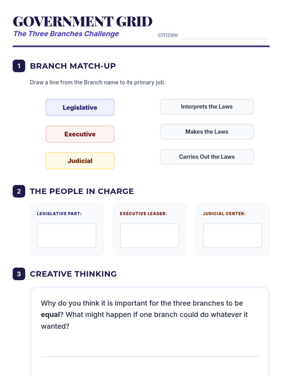 Explore the structure of the U.S. government, focusing on the roles and responsibilities of the Legislative, Executive, and Judicial branches.