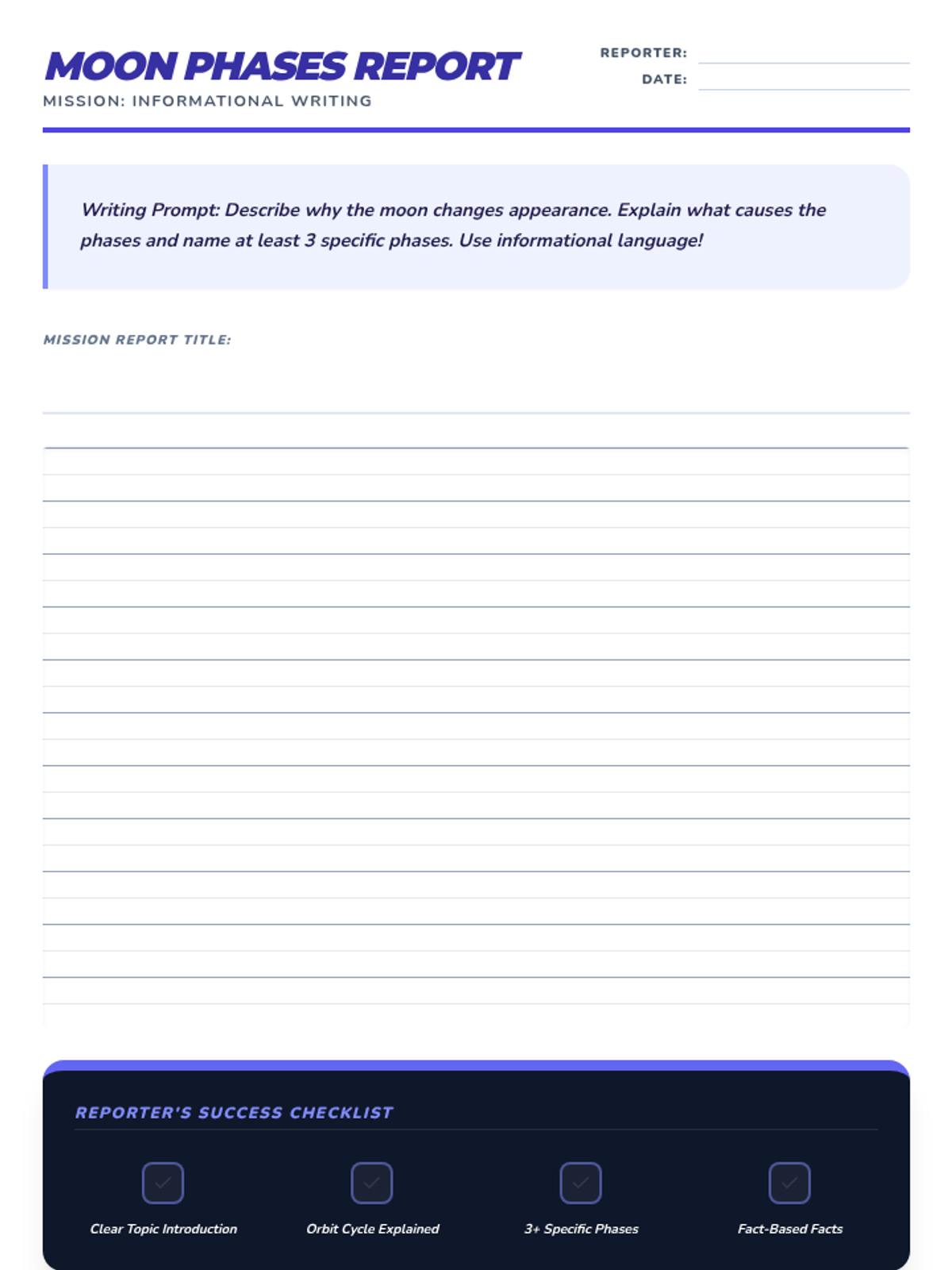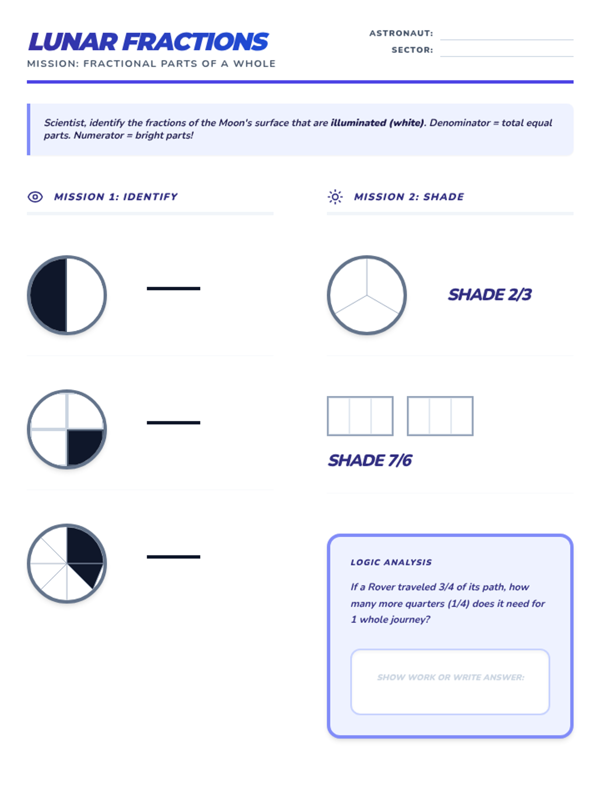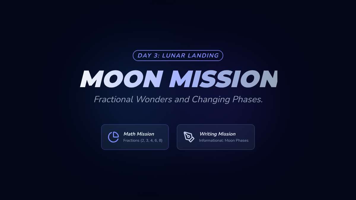 Focusing on the Moon. Math: Fractions (2, 3, 4, 6, 8). Writing: Informational report on Moon phases.