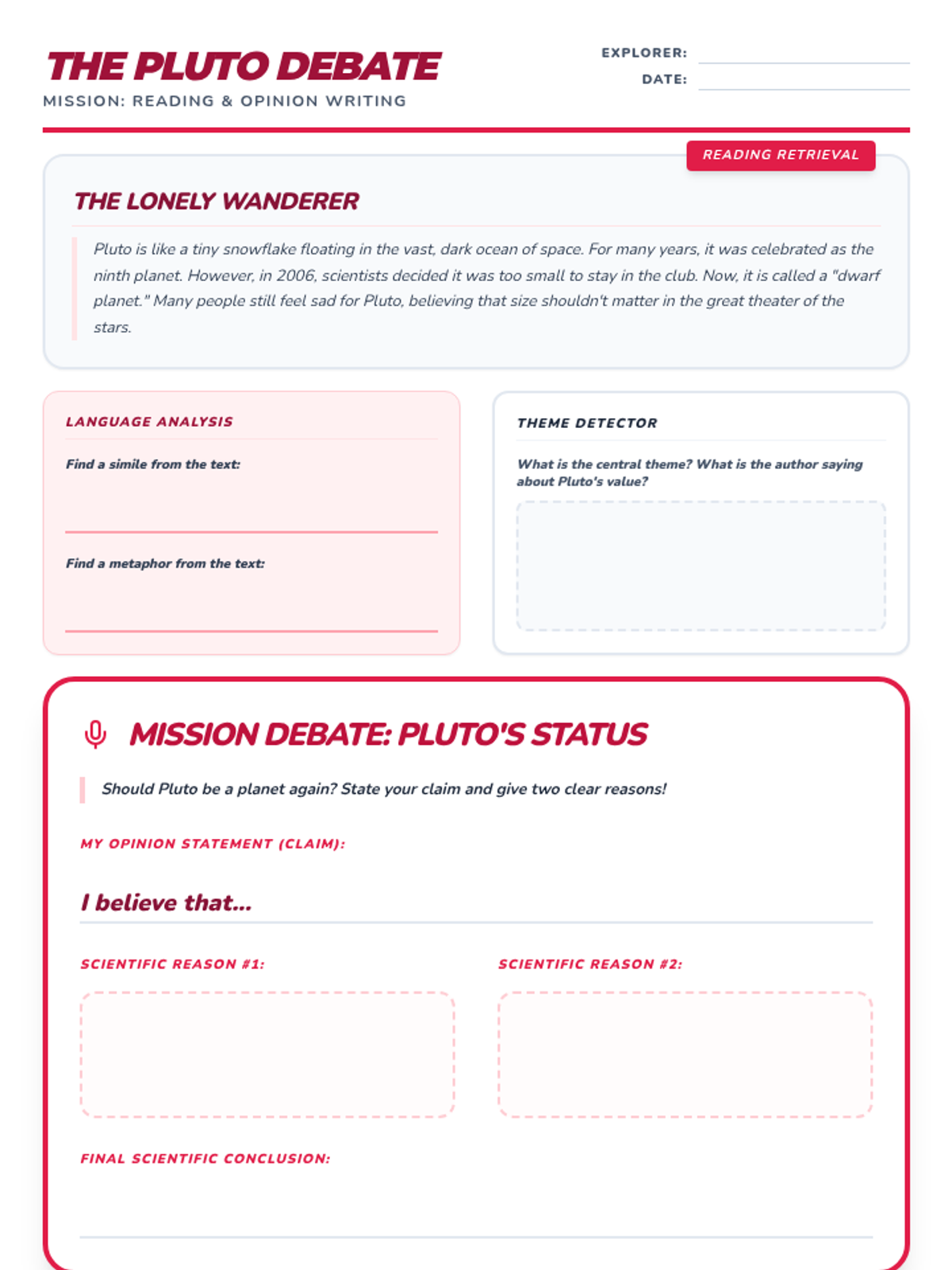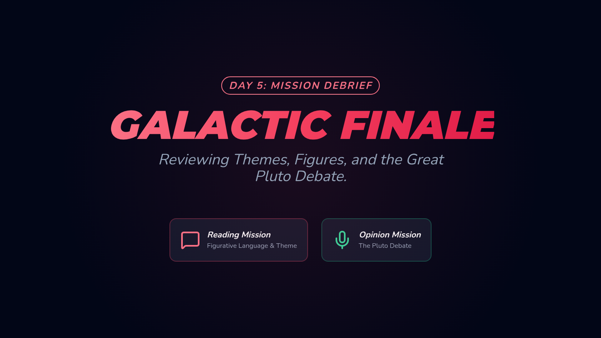 Reviewing the edge of the solar system and wrapping up. Reading: Figurative language and theme. Writing: Opinion writing on Pluto and best planetary destinations.