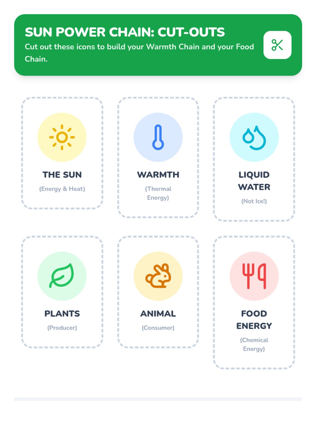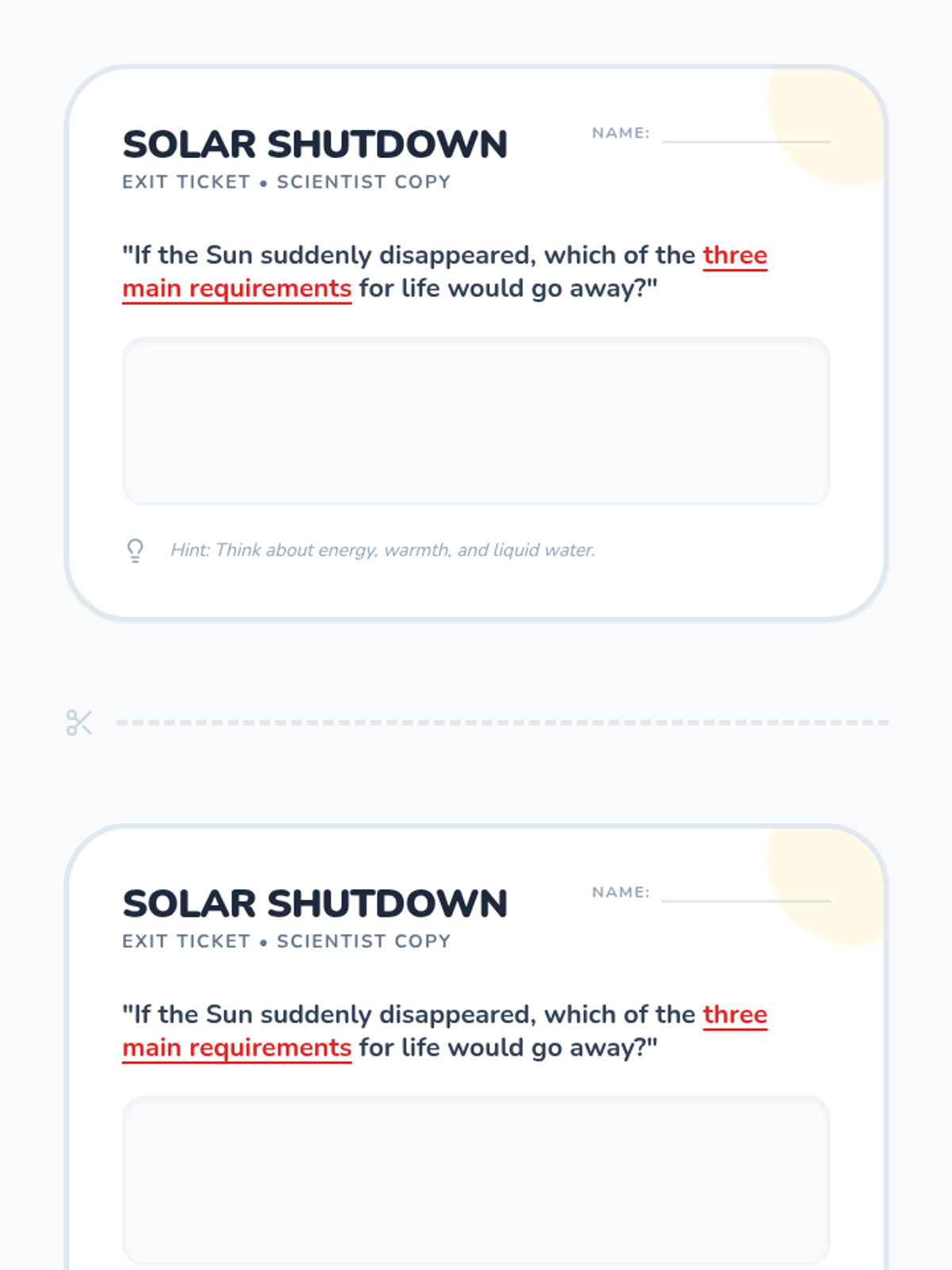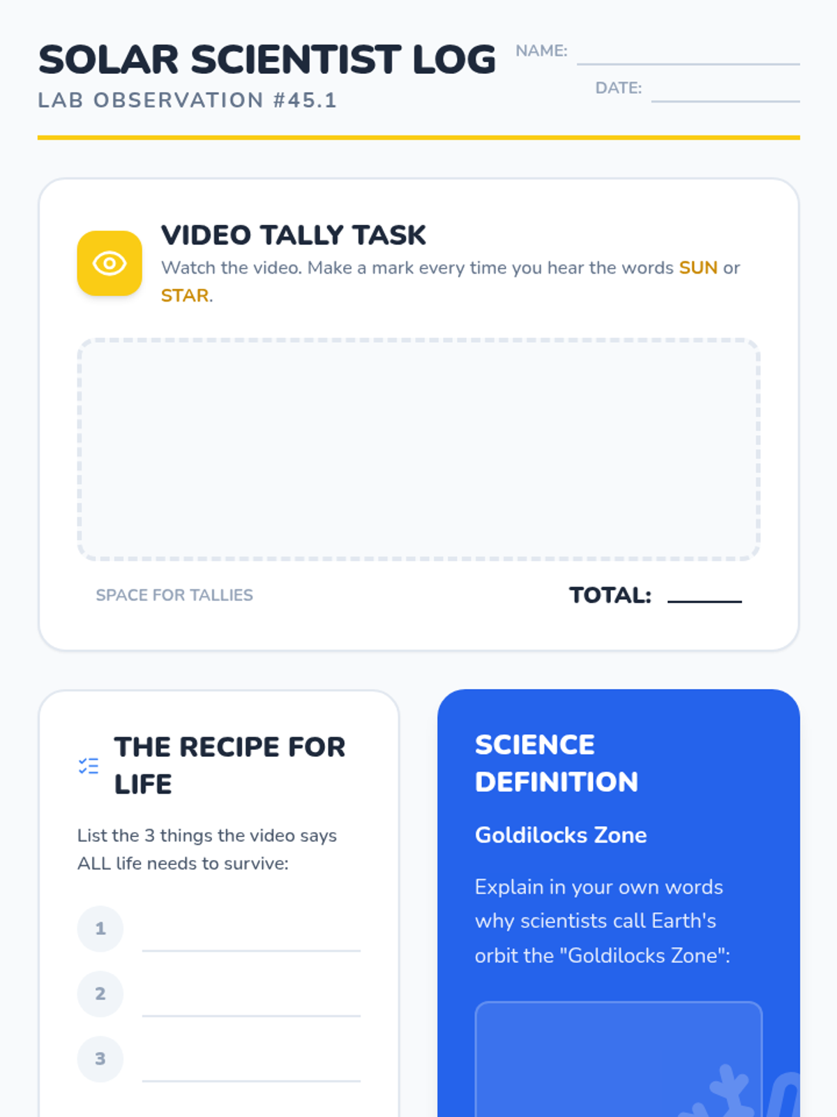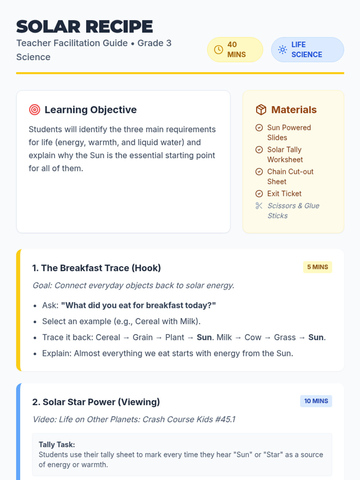 Students explore how the Sun provides the three essential requirements for life—energy, warmth, and liquid water—through a video investigation and a sequencing activity.