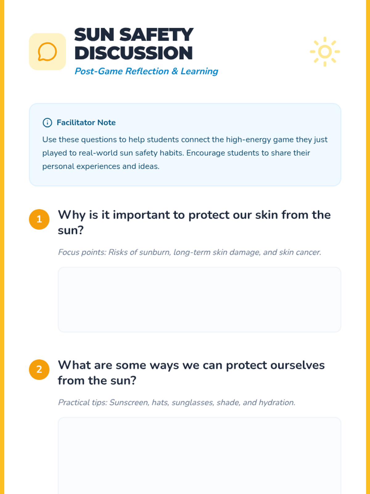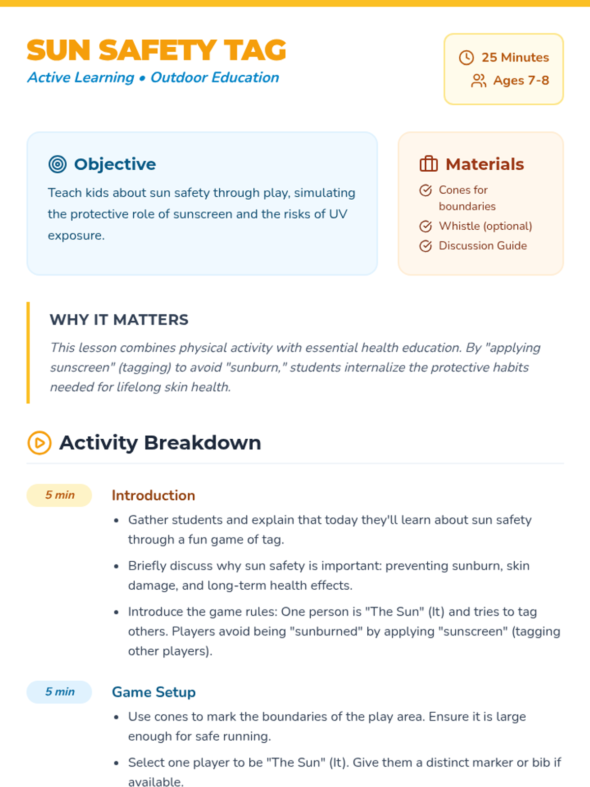 An active, outdoor lesson where students learn the principles of sun safety through a high-energy game of tag, simulating the protection provided by sunscreen.
