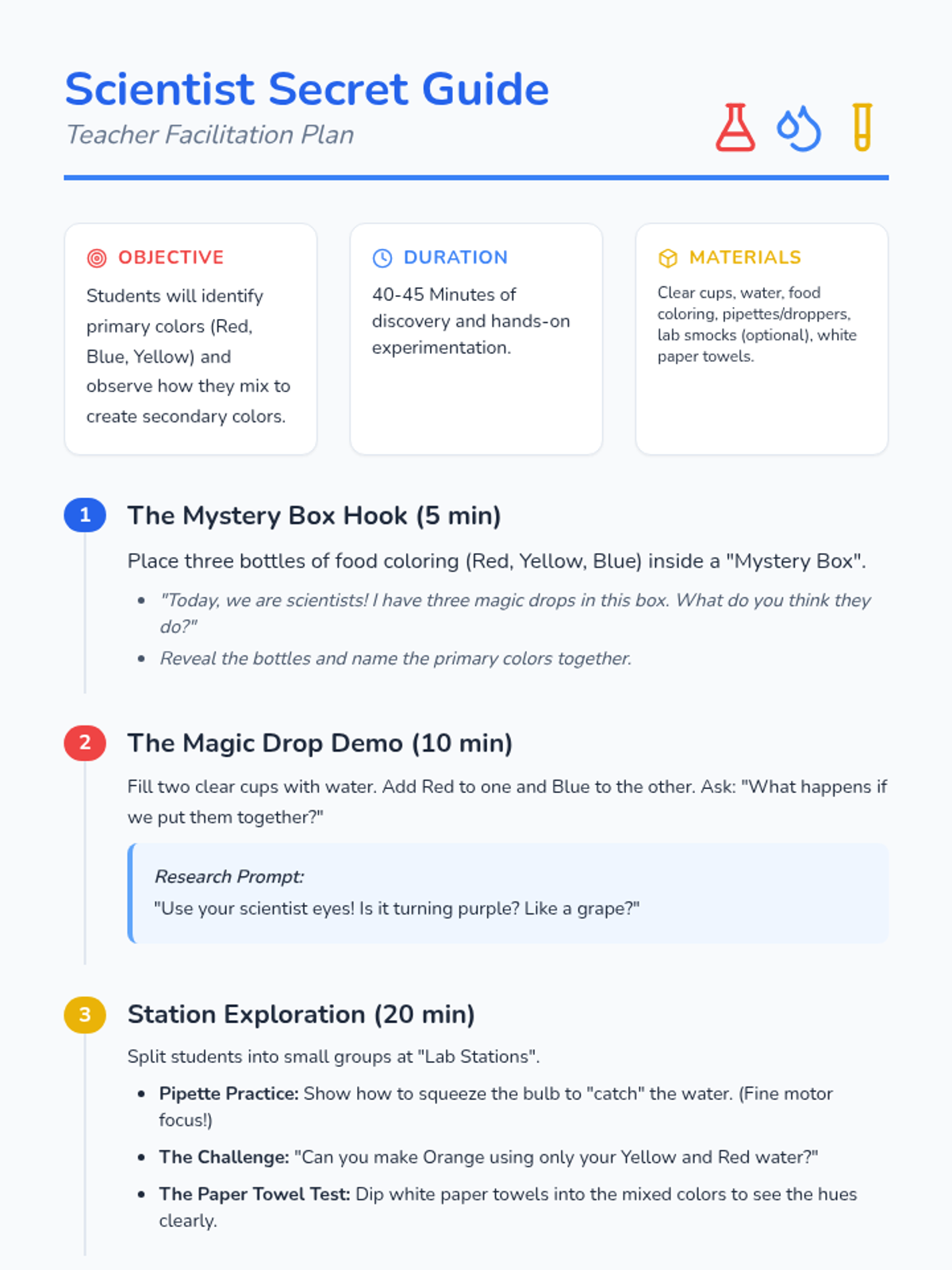 Pre-K students become little scientists to explore primary colors and the magic of mixing them using water and food coloring. This lesson builds fine motor skills and introduces the concept of cause and effect through hands-on play.