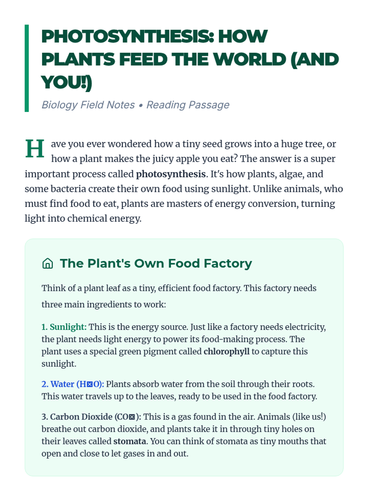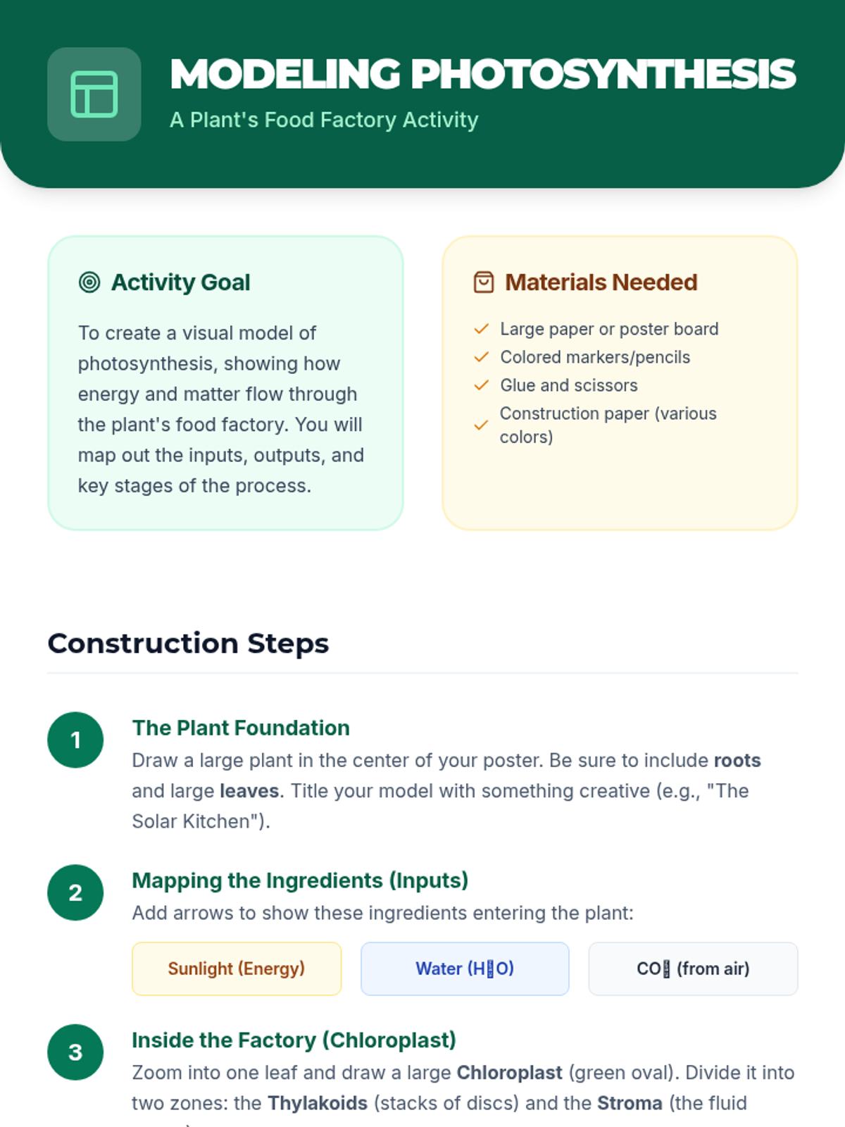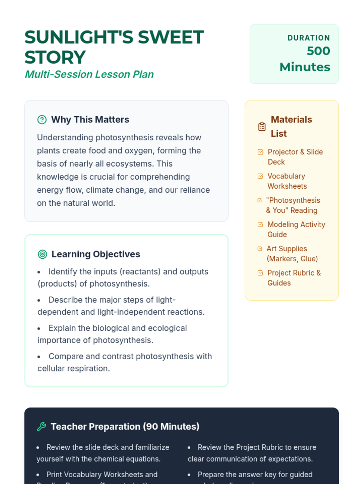 A comprehensive 500-minute multi-session lesson for high school biology students that breaks down the process of photosynthesis, its stages, real-world impact, and relationship to cellular respiration.