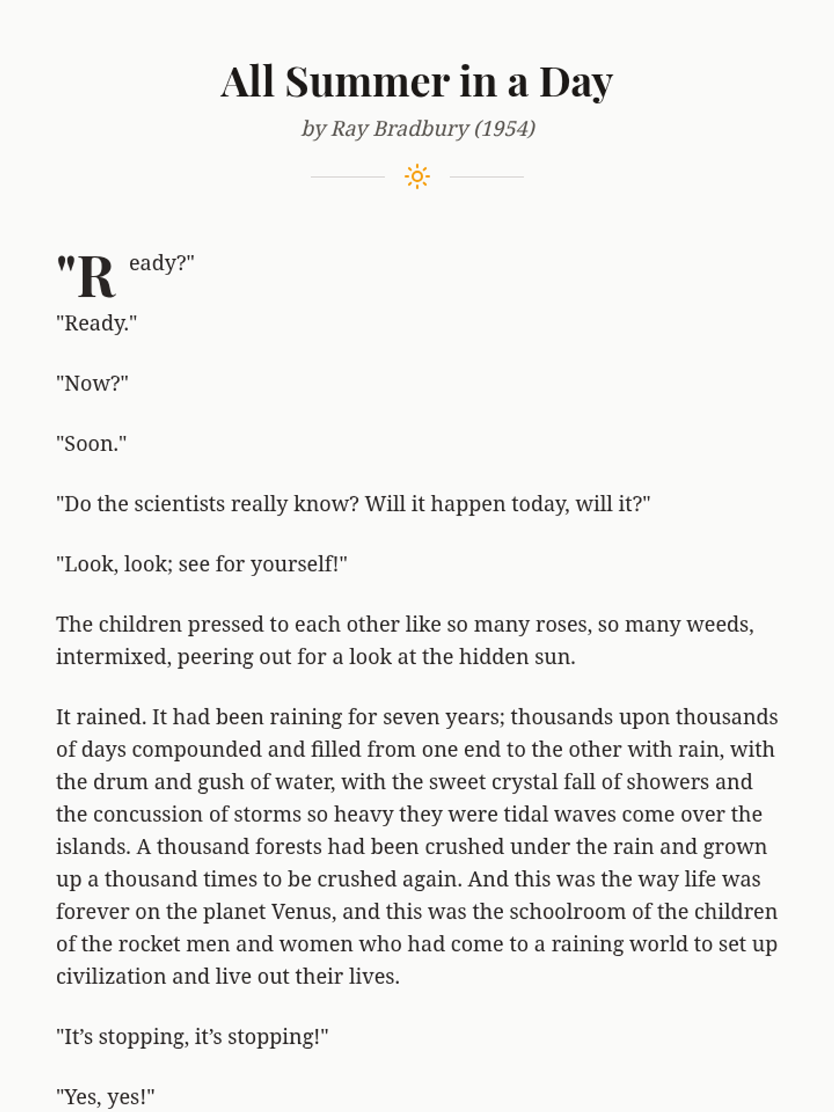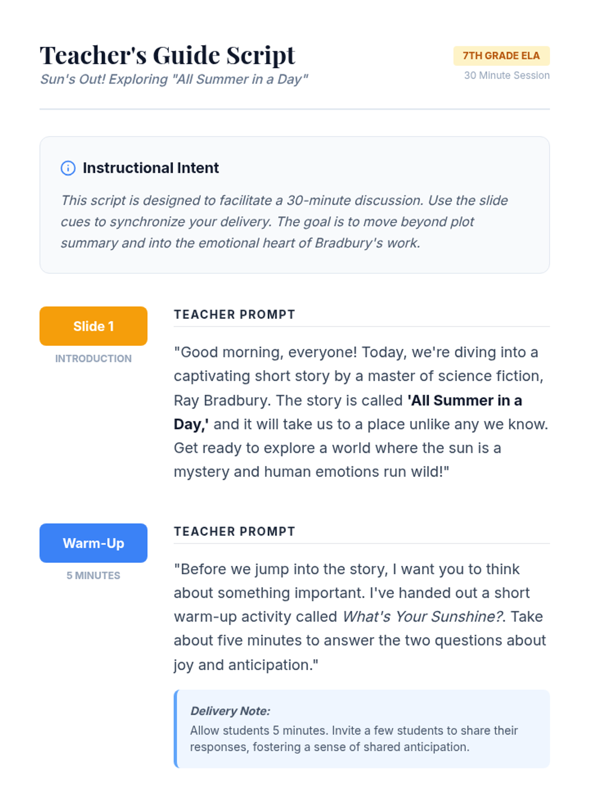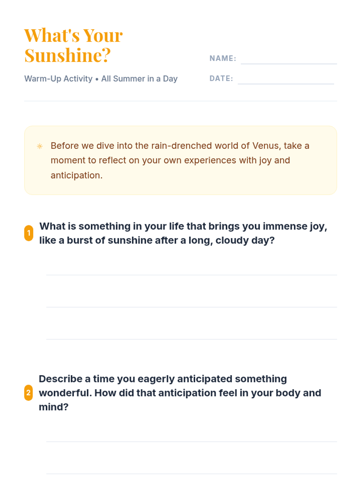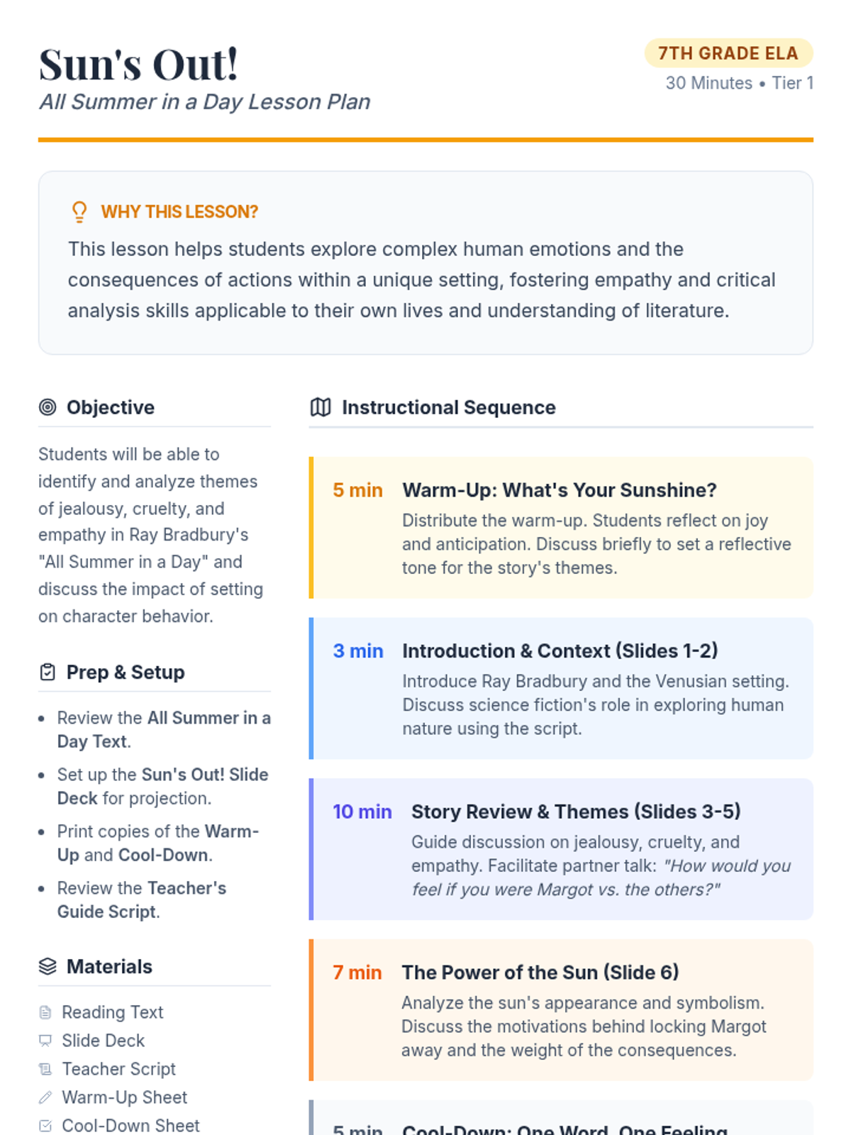 A 30-minute 7th-grade ELA lesson exploring Ray Bradbury's 'All Summer in a Day,' focusing on themes of jealousy, cruelty, and the power of memory and environment. Students analyze character motivations and the symbolic importance of the sun.