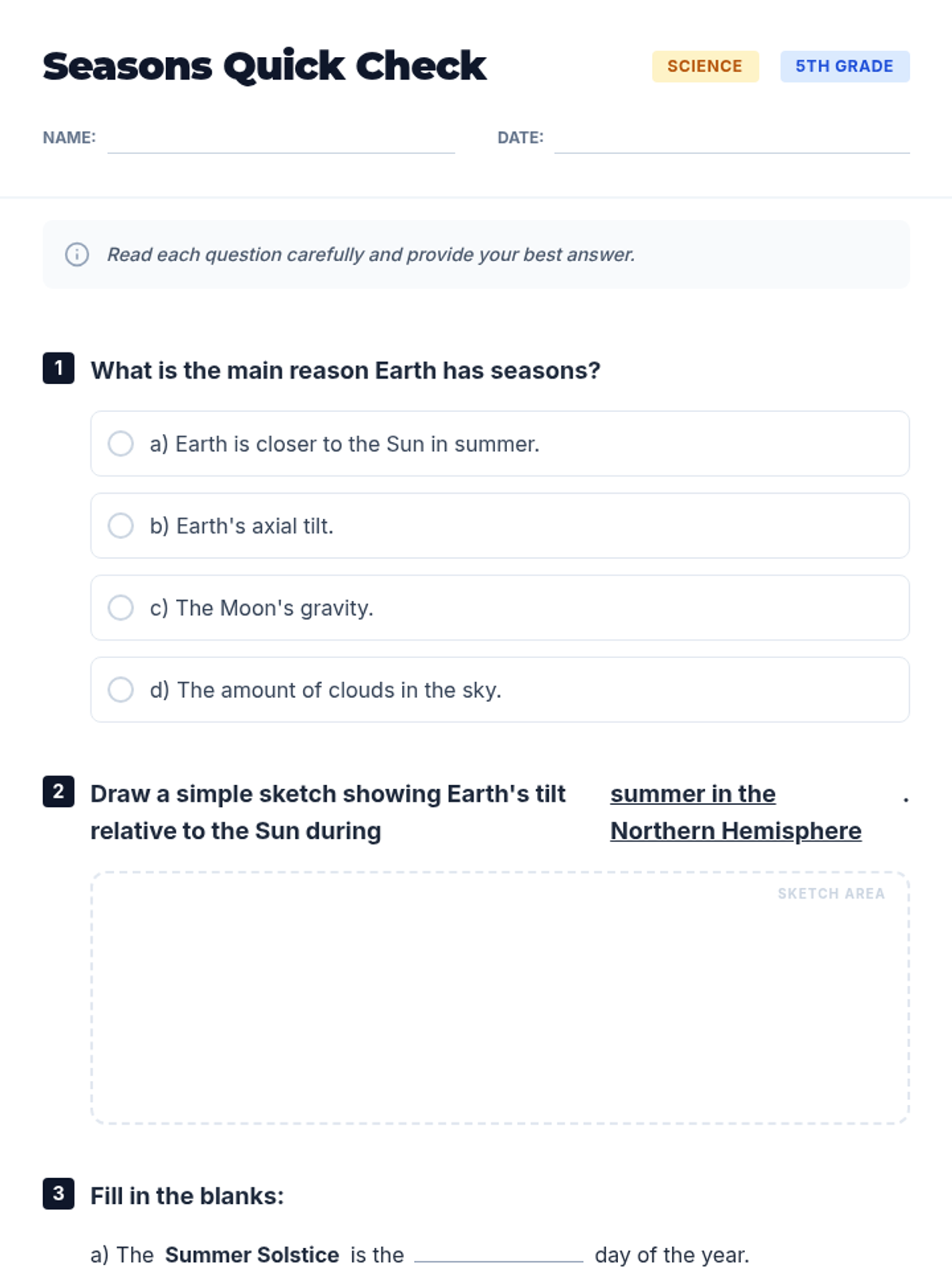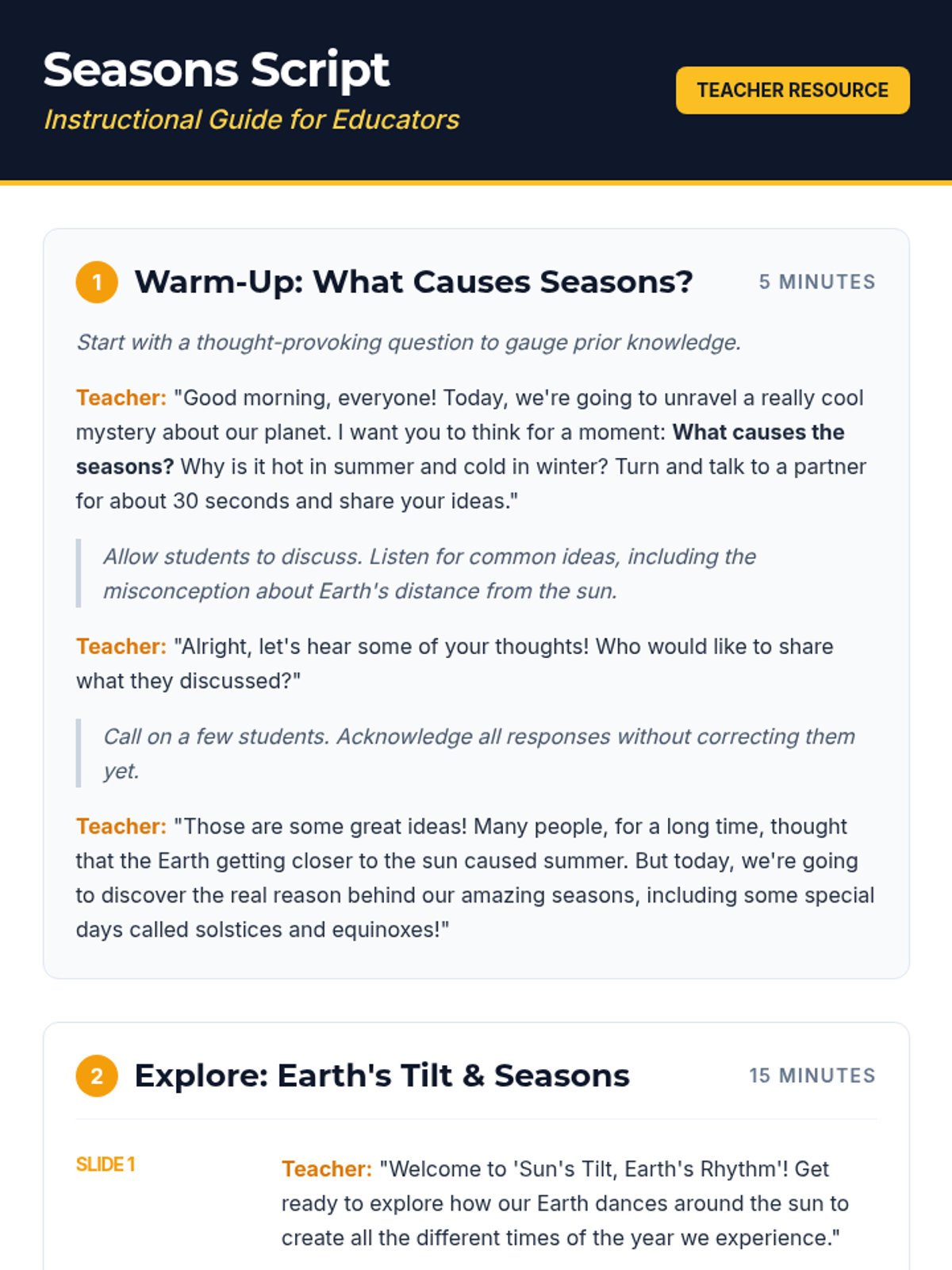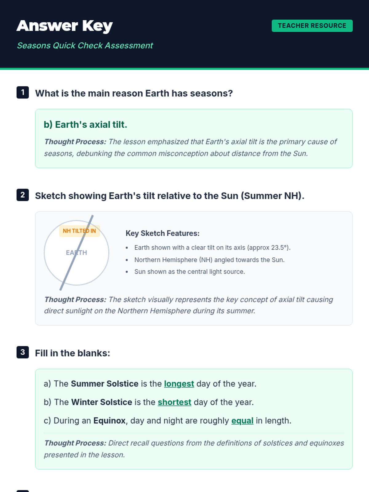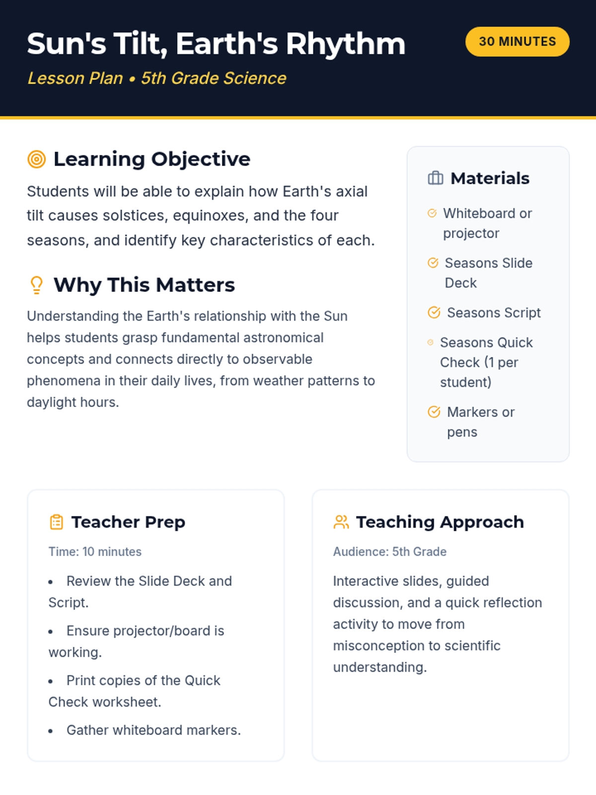 Explore how Earth's tilt creates solstices, equinoxes, and the changing seasons. This lesson helps 5th-grade students understand a fundamental astronomical concept and its impact on their daily lives. It is designed for a single 30-minute classroom session.