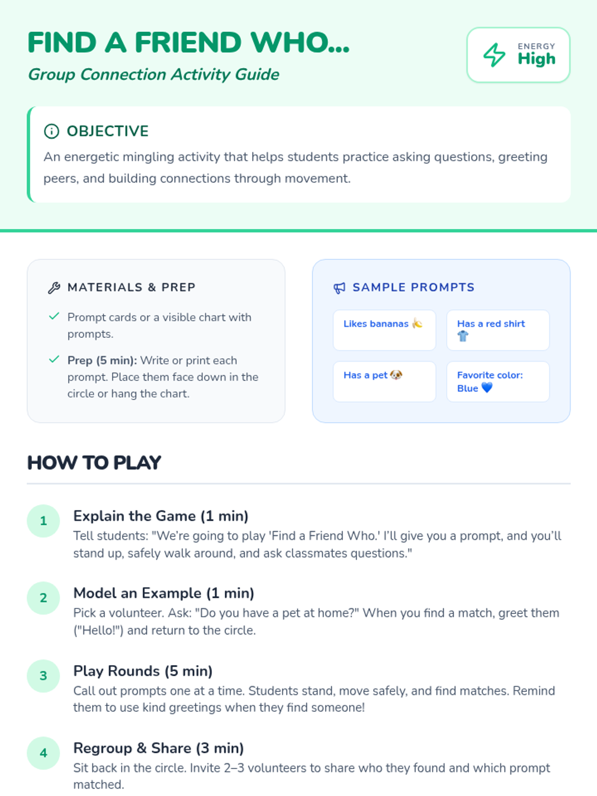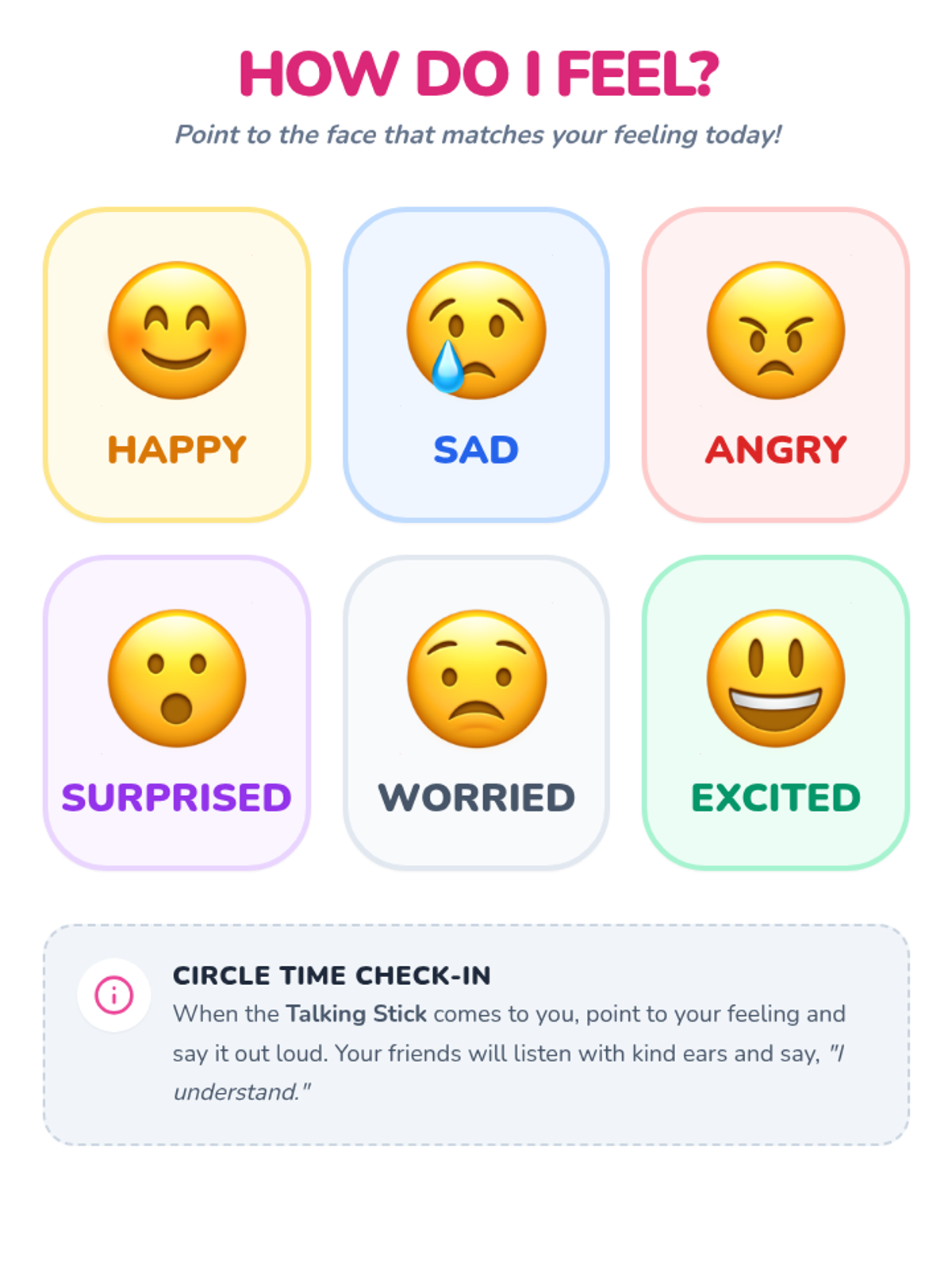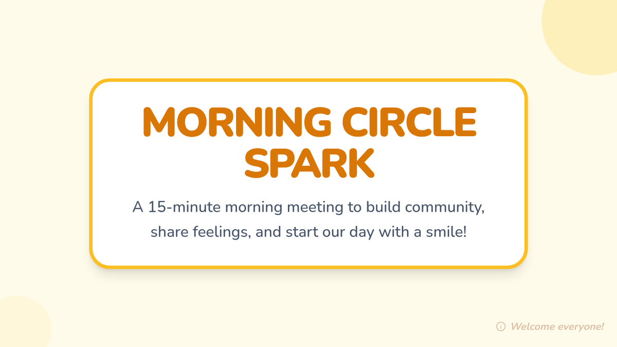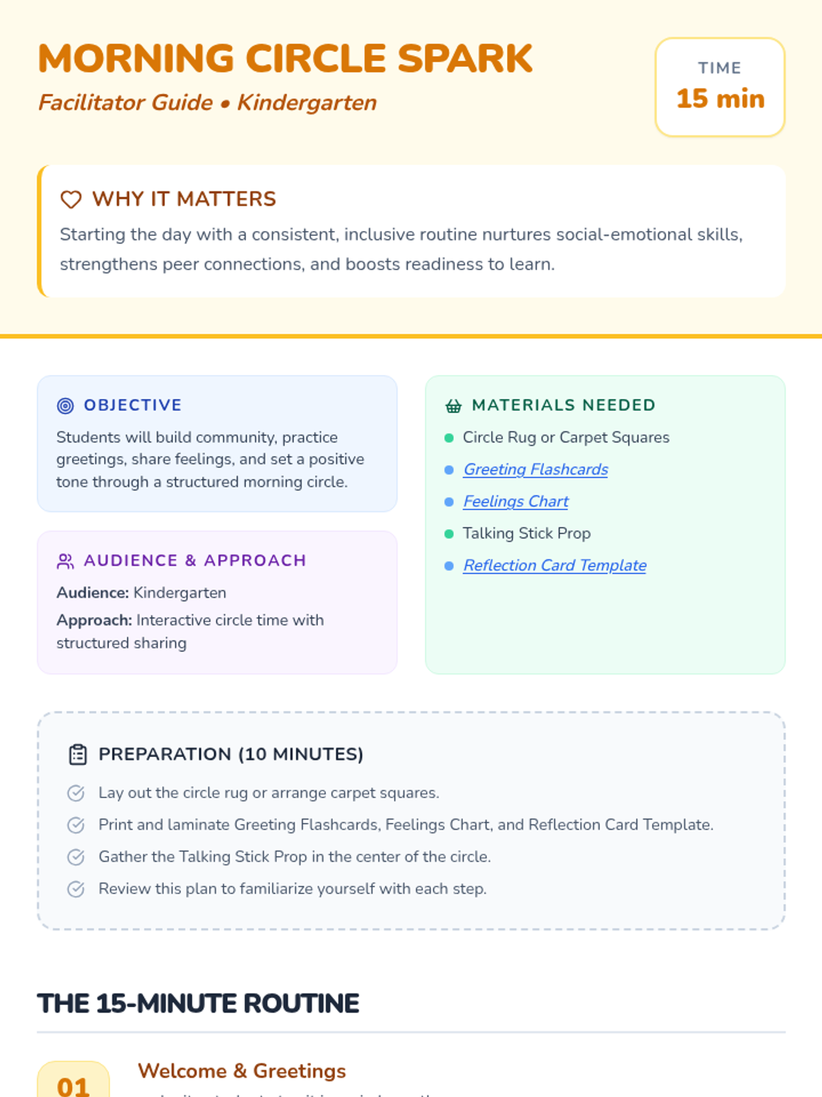 A 15-minute Kindergarten morning meeting routine focused on building community, social skills, and emotional awareness through greetings and sharing.