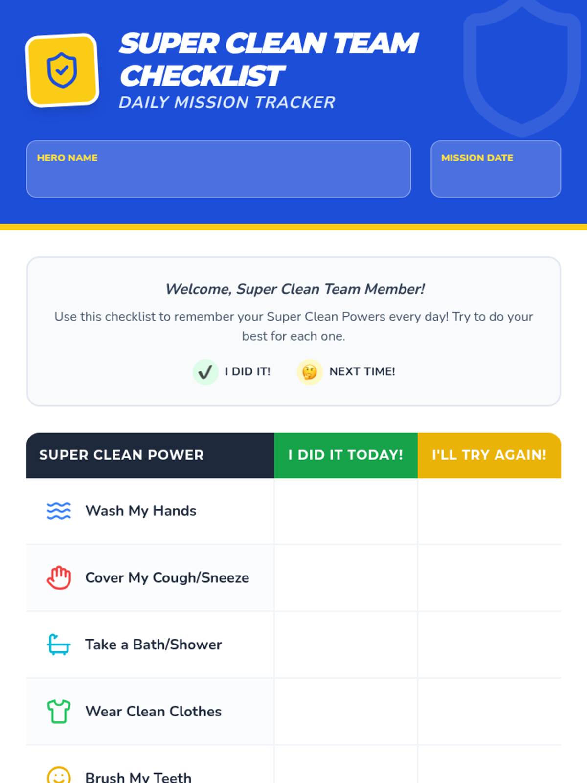The introductory lesson for the Dirt Destroyers Squad, covering the 'why' of hygiene and the 'how' of daily missions. It includes visual presentations and tools for tracking success across the whole family.
