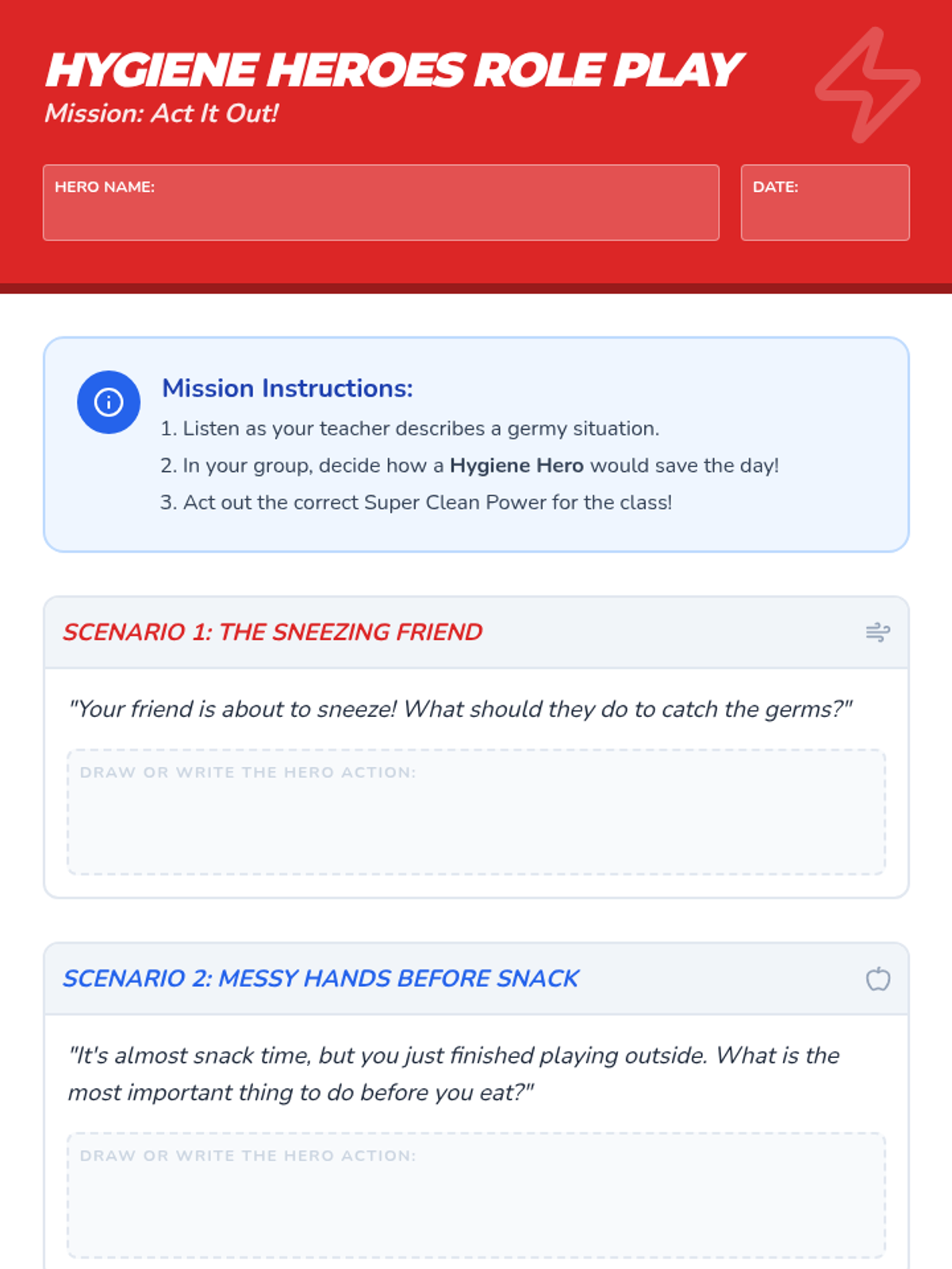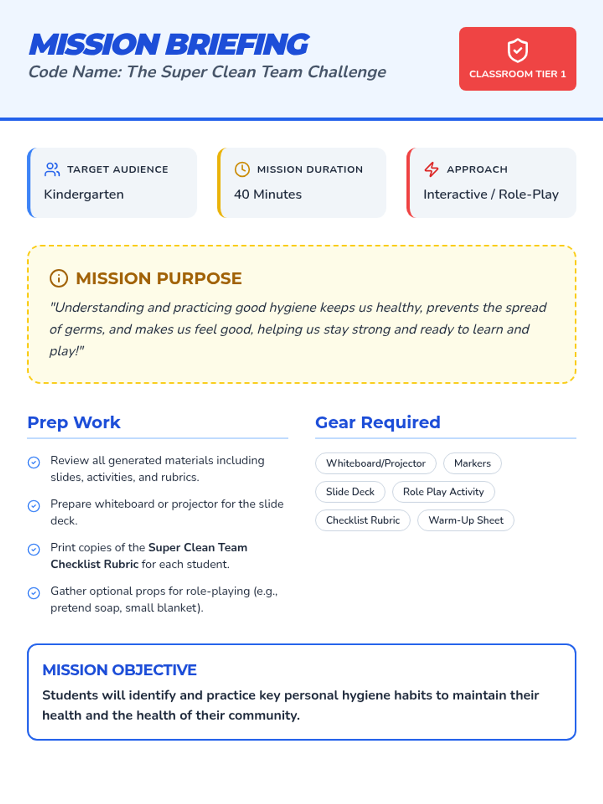 A fun, interactive lesson where Kindergarten students become 'Super Clean Team' members, learning essential hygiene habits like handwashing, covering coughs, and brushing teeth through superhero-themed challenges and role-play.