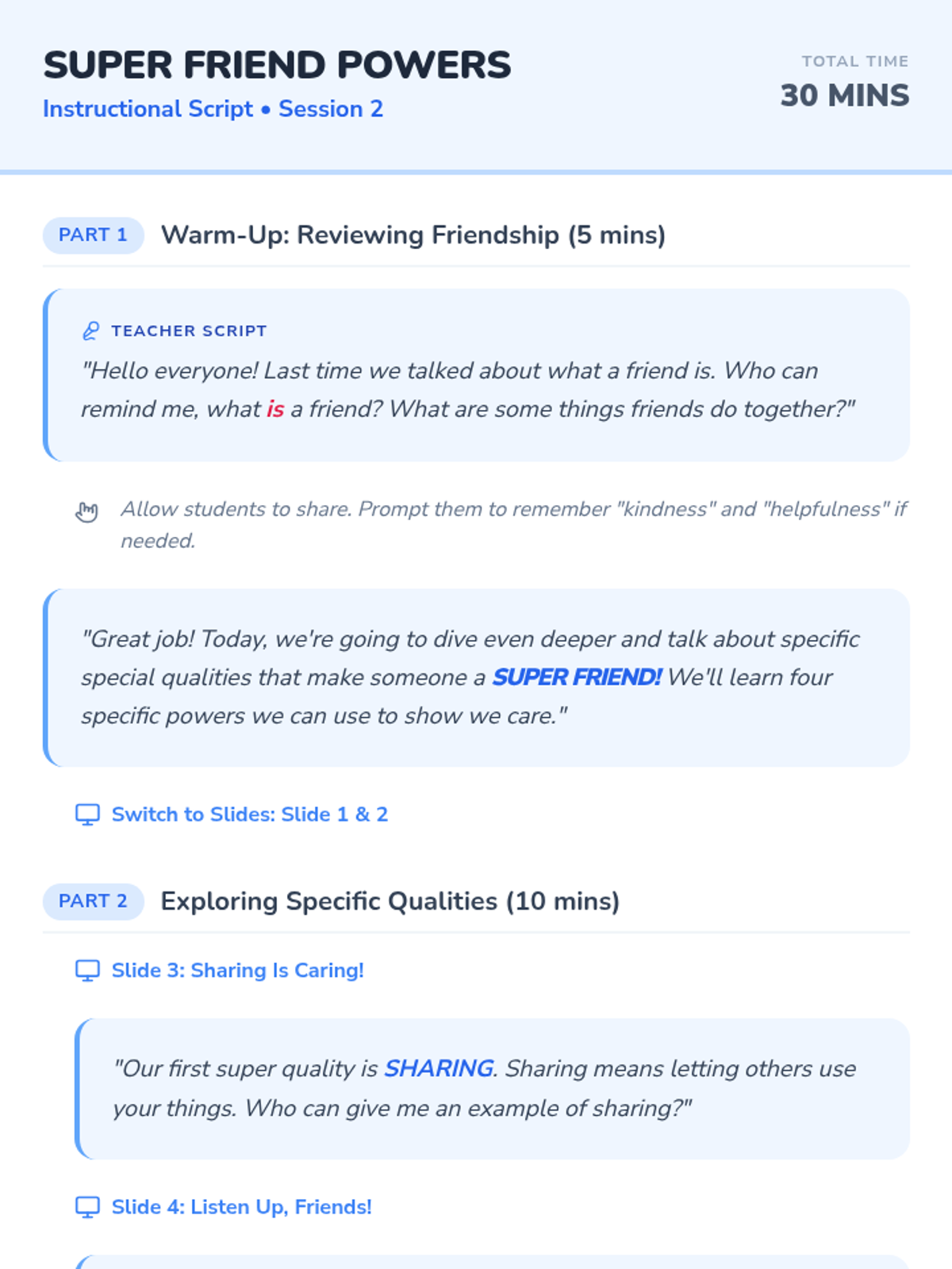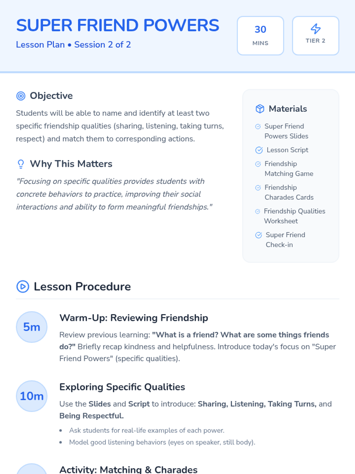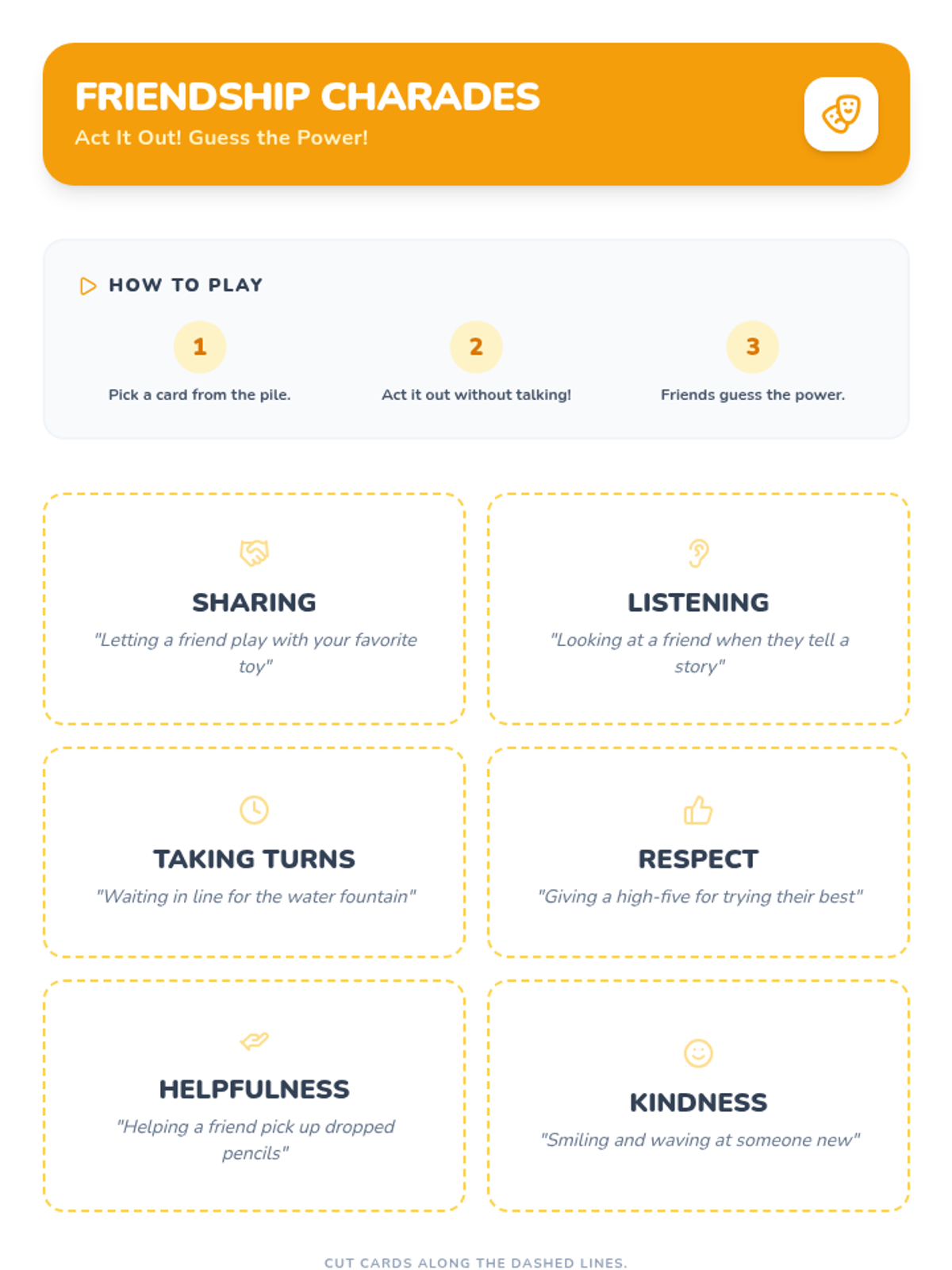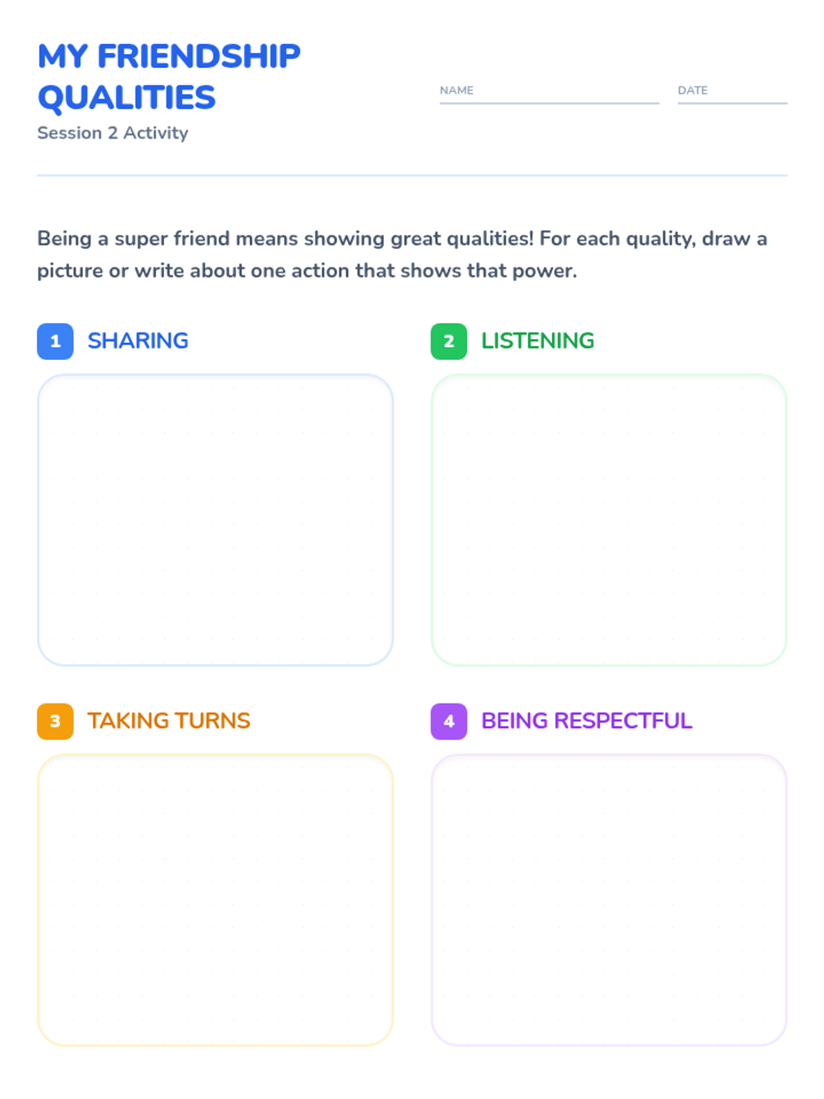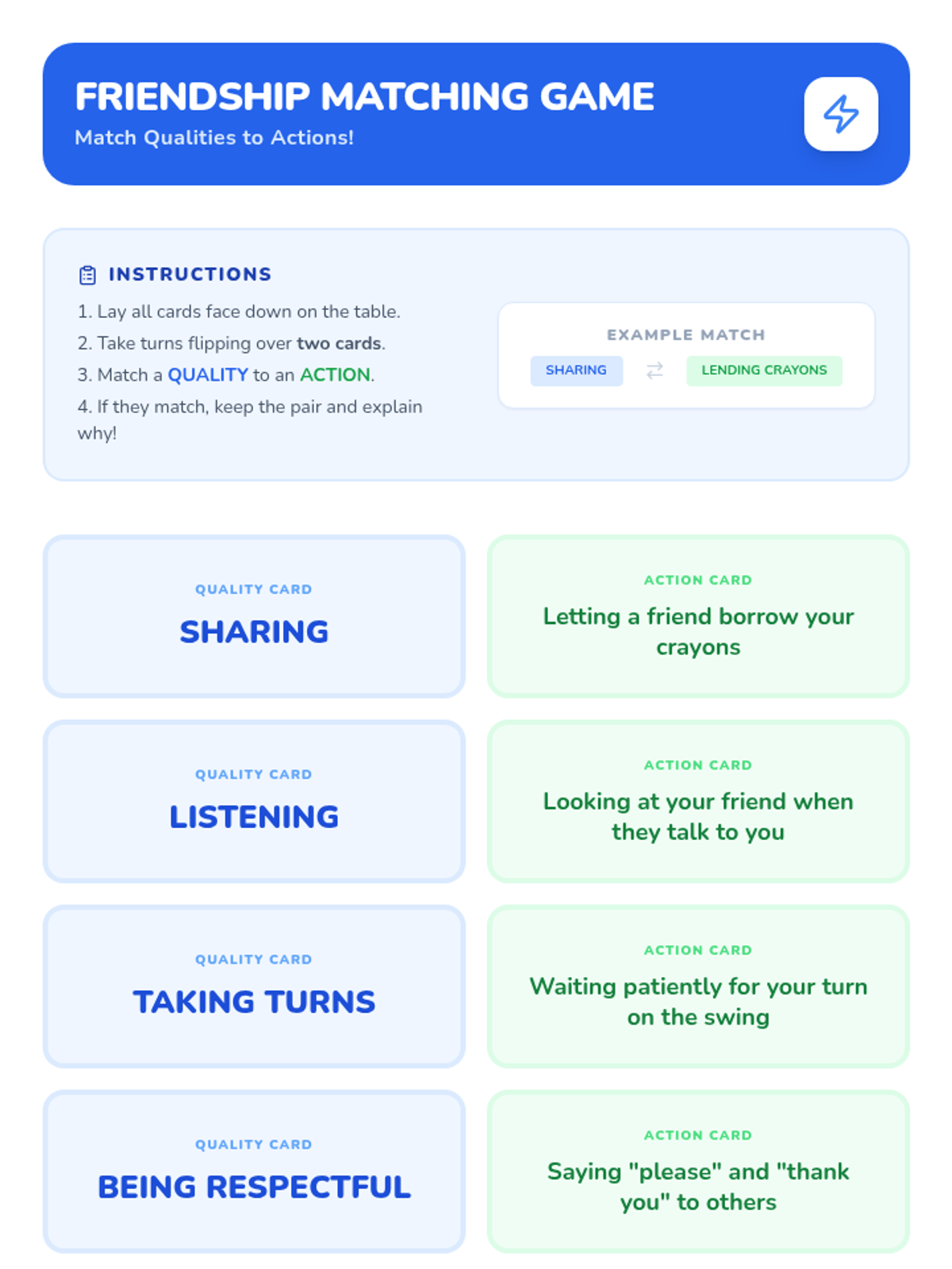 Students dive into specific friendship qualities—sharing, listening, taking turns, and respect—using a matching game and discussion.