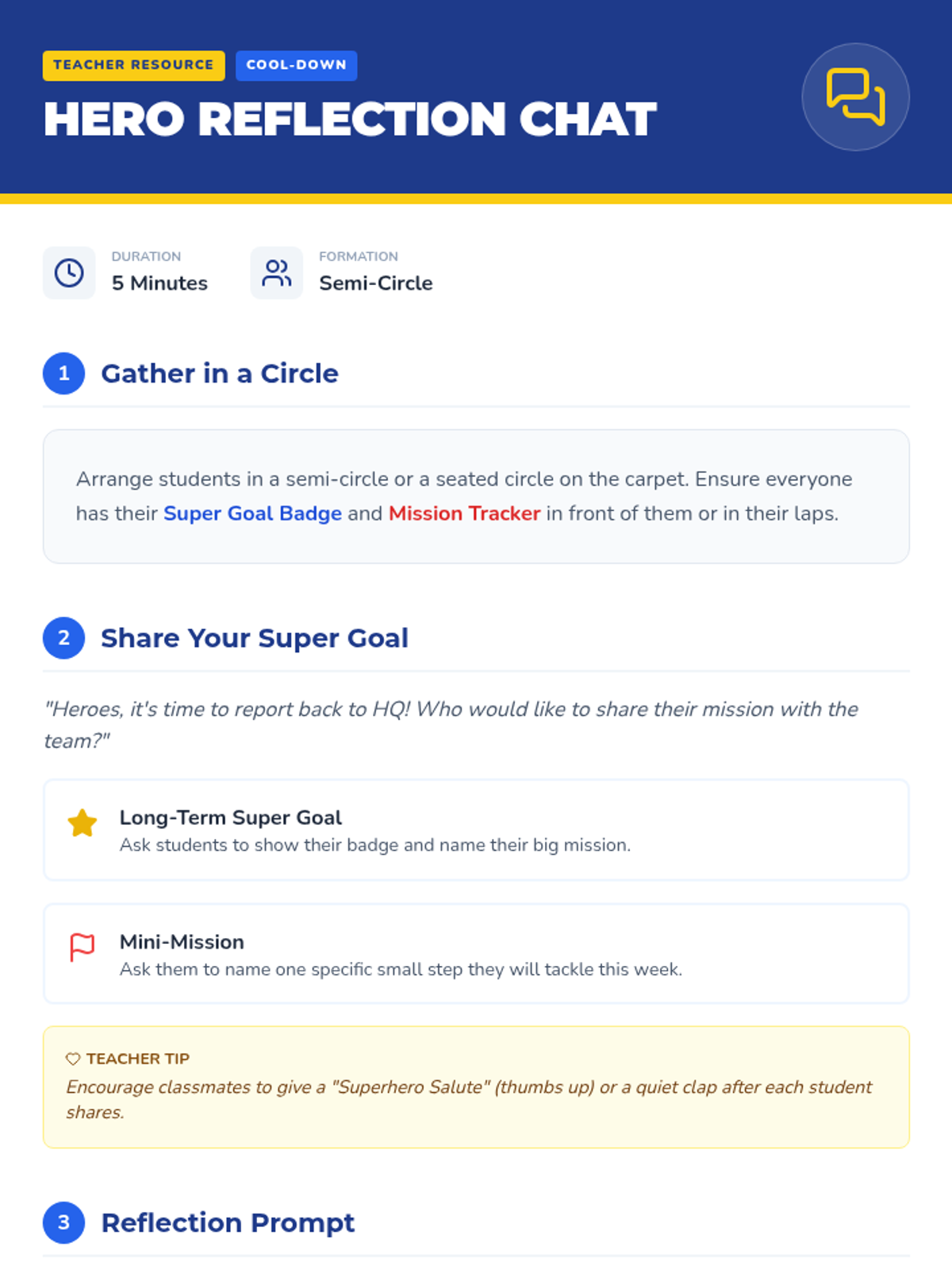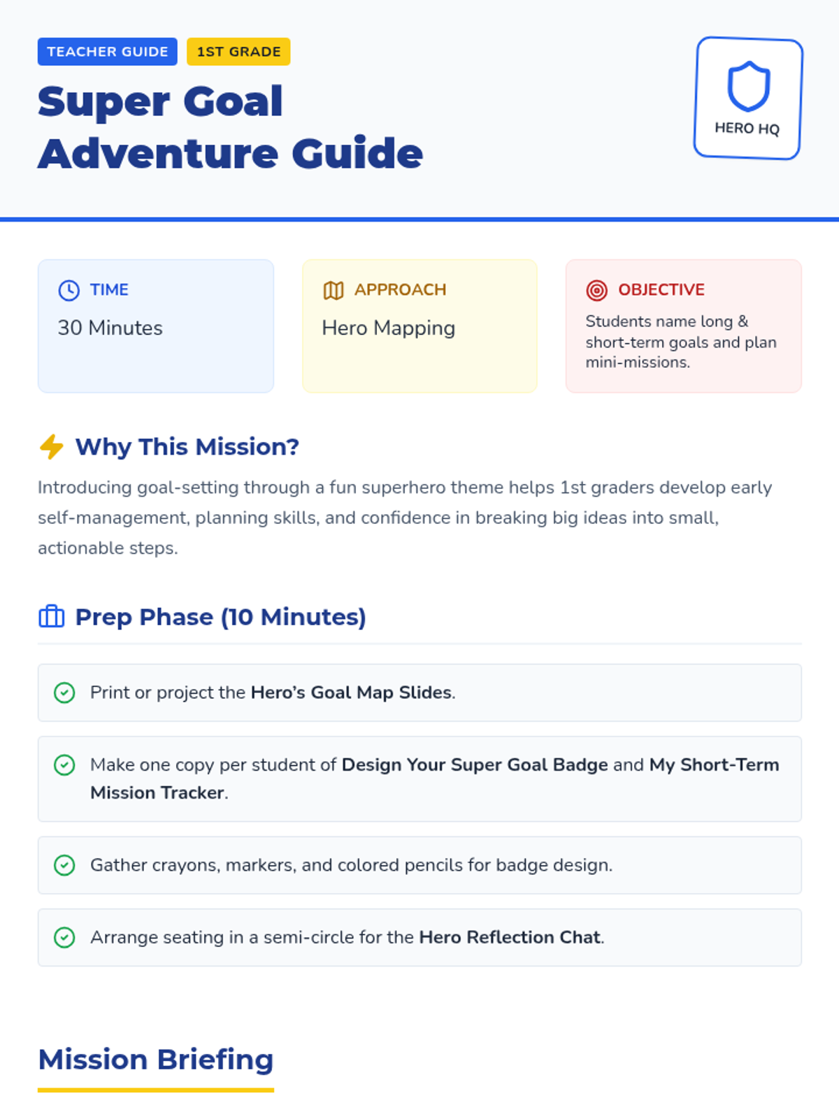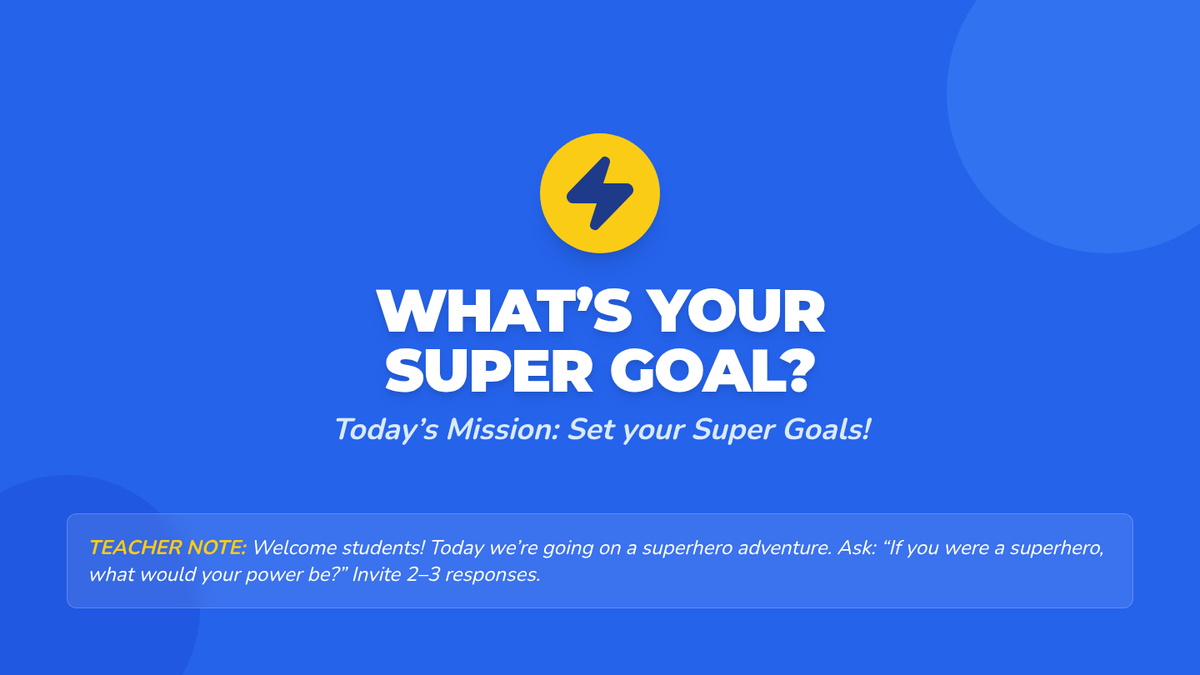 An interactive lesson that introduces 1st graders to the idea of setting short- and long-term goals by imagining their own superhero journeys. This lesson helps build early self-management and planning skills through engaging activities, maps, and reflections.