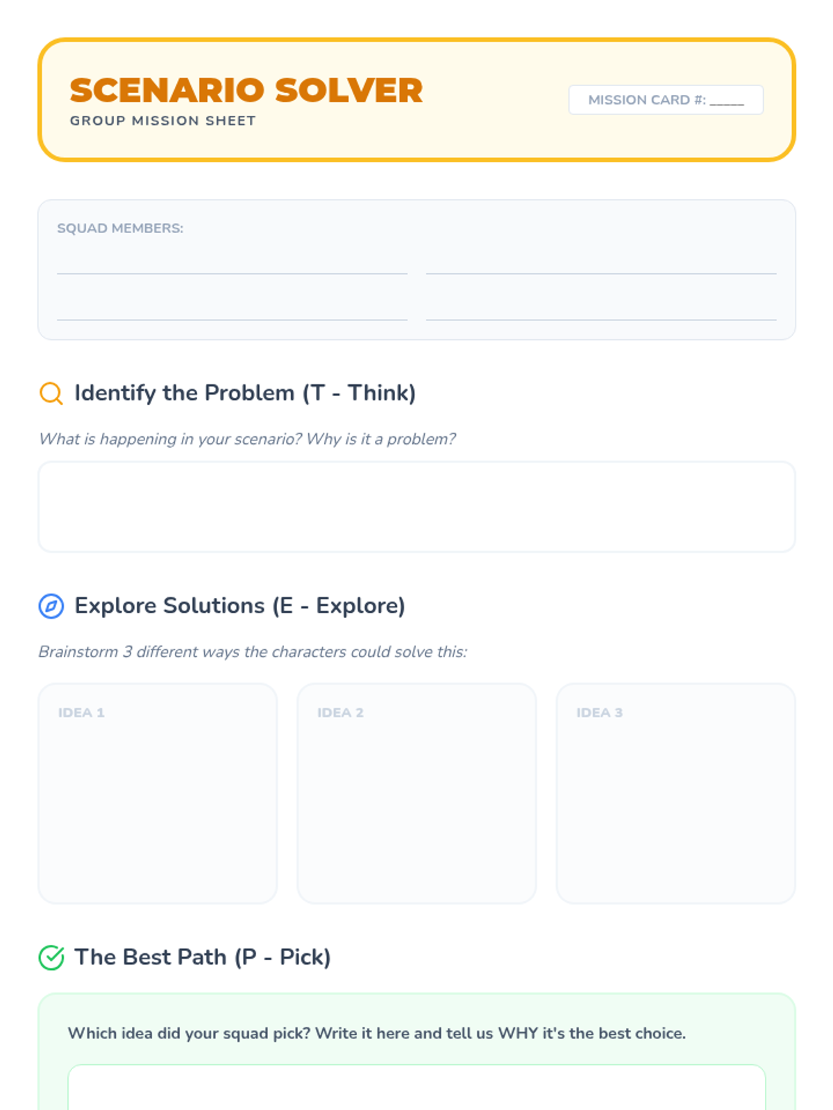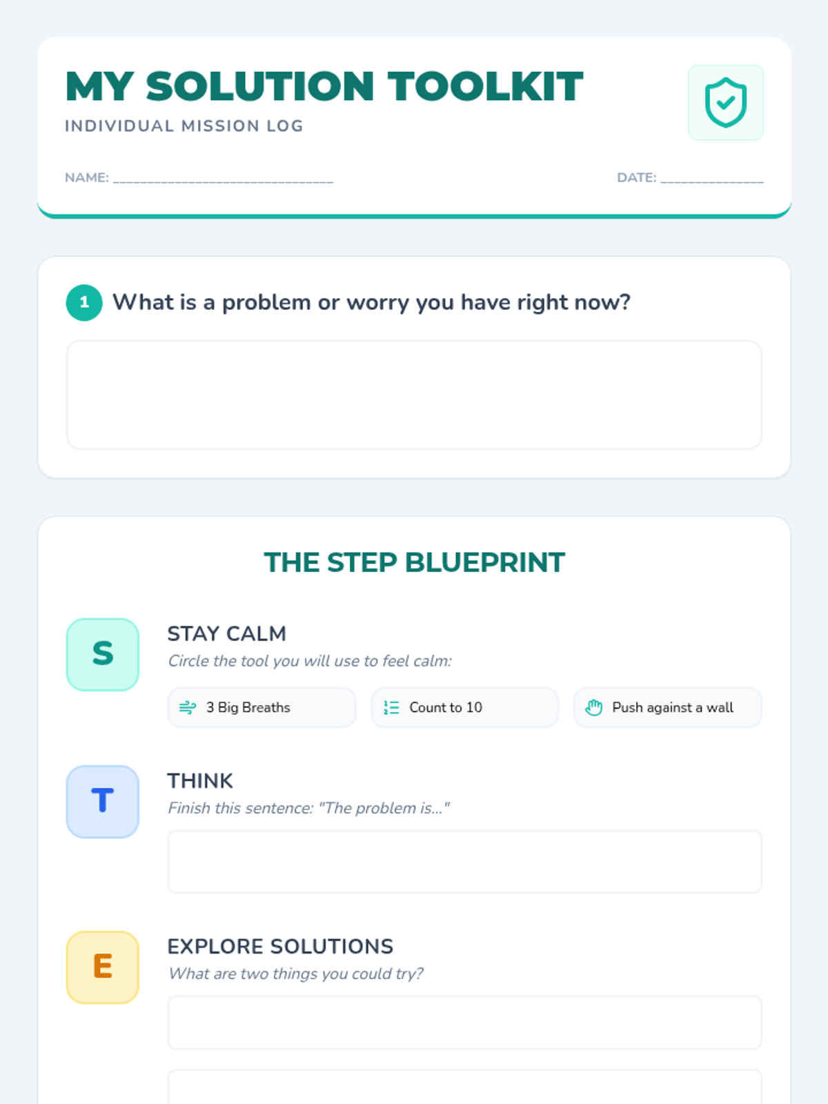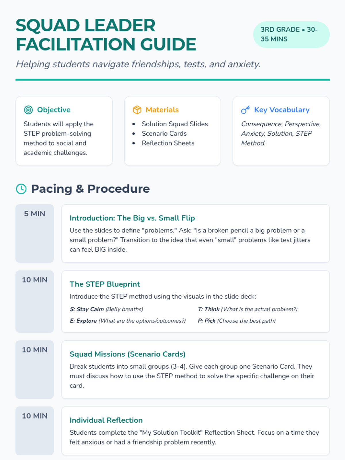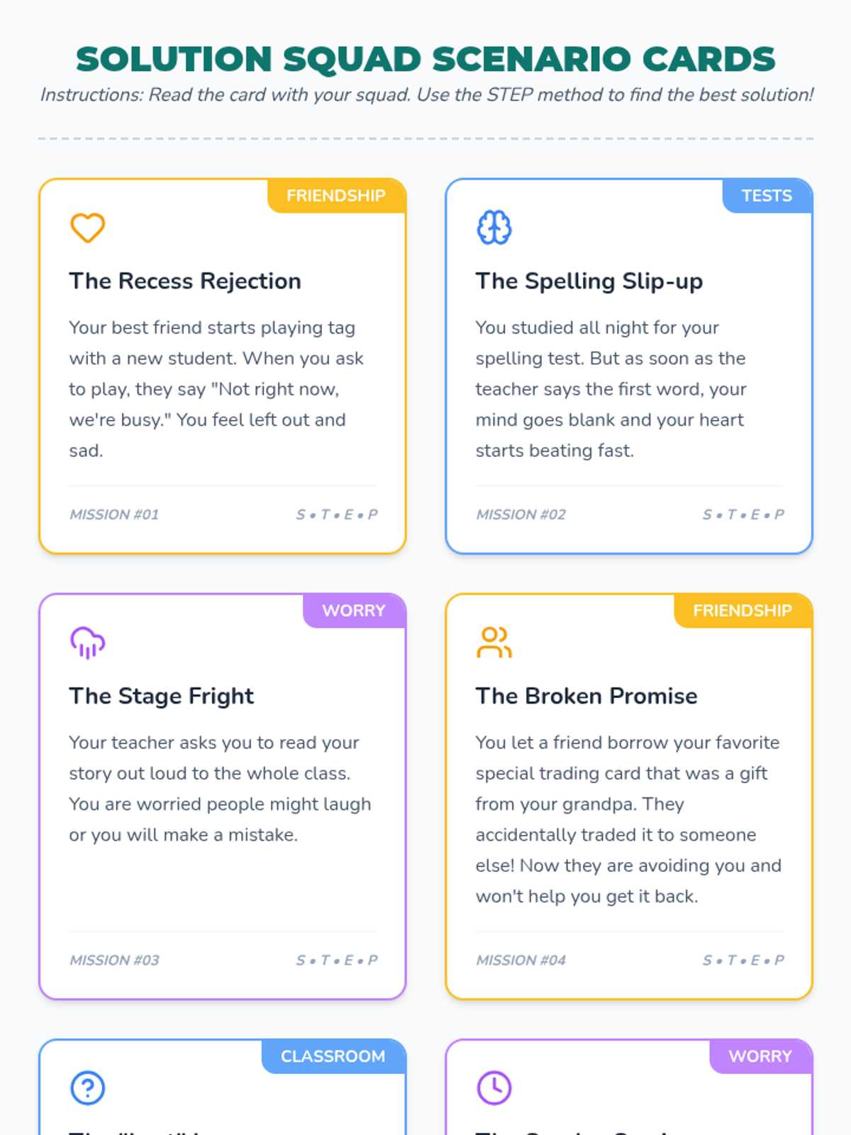 A social-emotional learning lesson for 3rd graders focused on identifying and solving common problems related to friendships, test anxiety, and general worries using the STEP method.