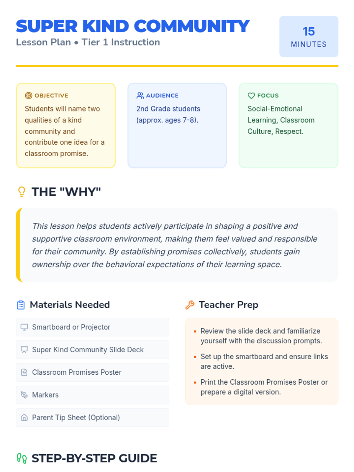 This 15-minute lesson empowers 2nd-grade students to understand and actively build a kind and respectful classroom community through interactive discussion and collaborative promise creation.