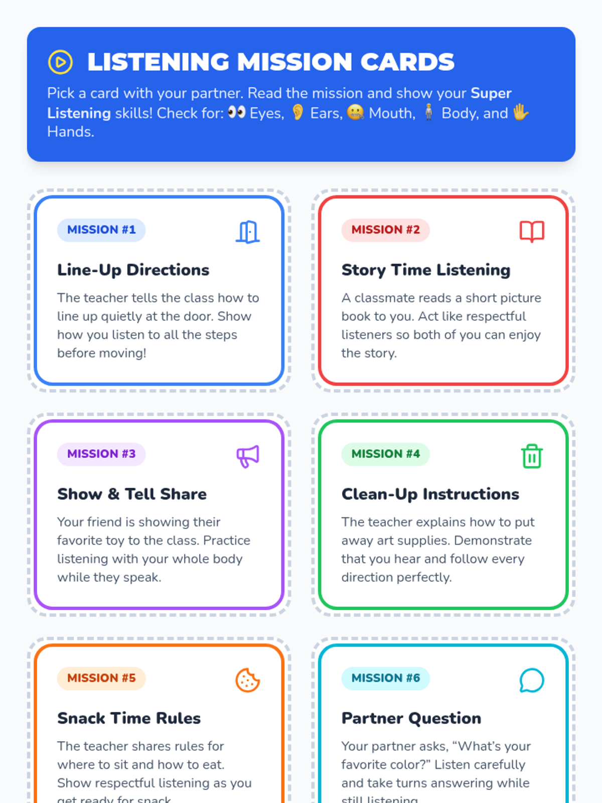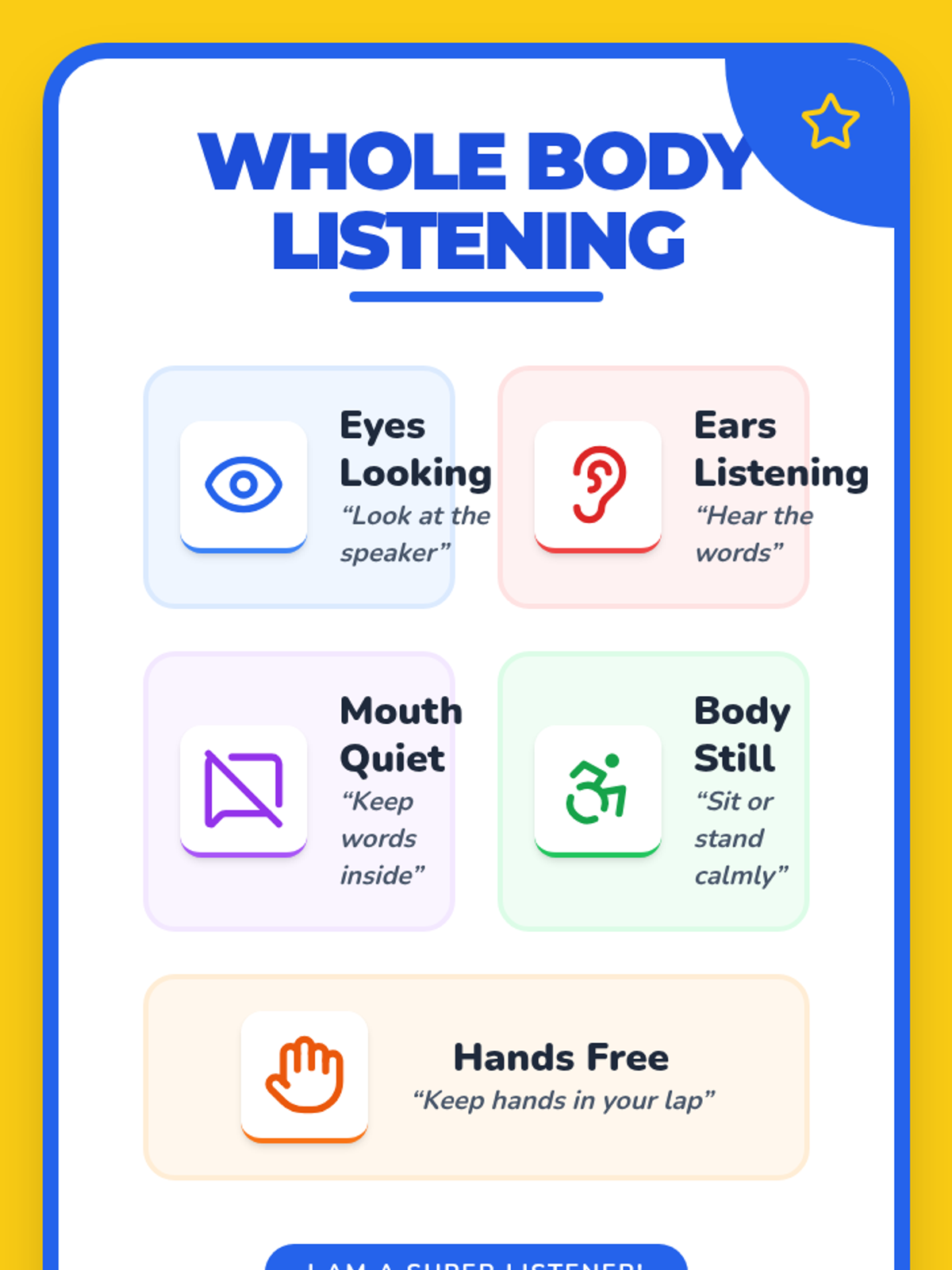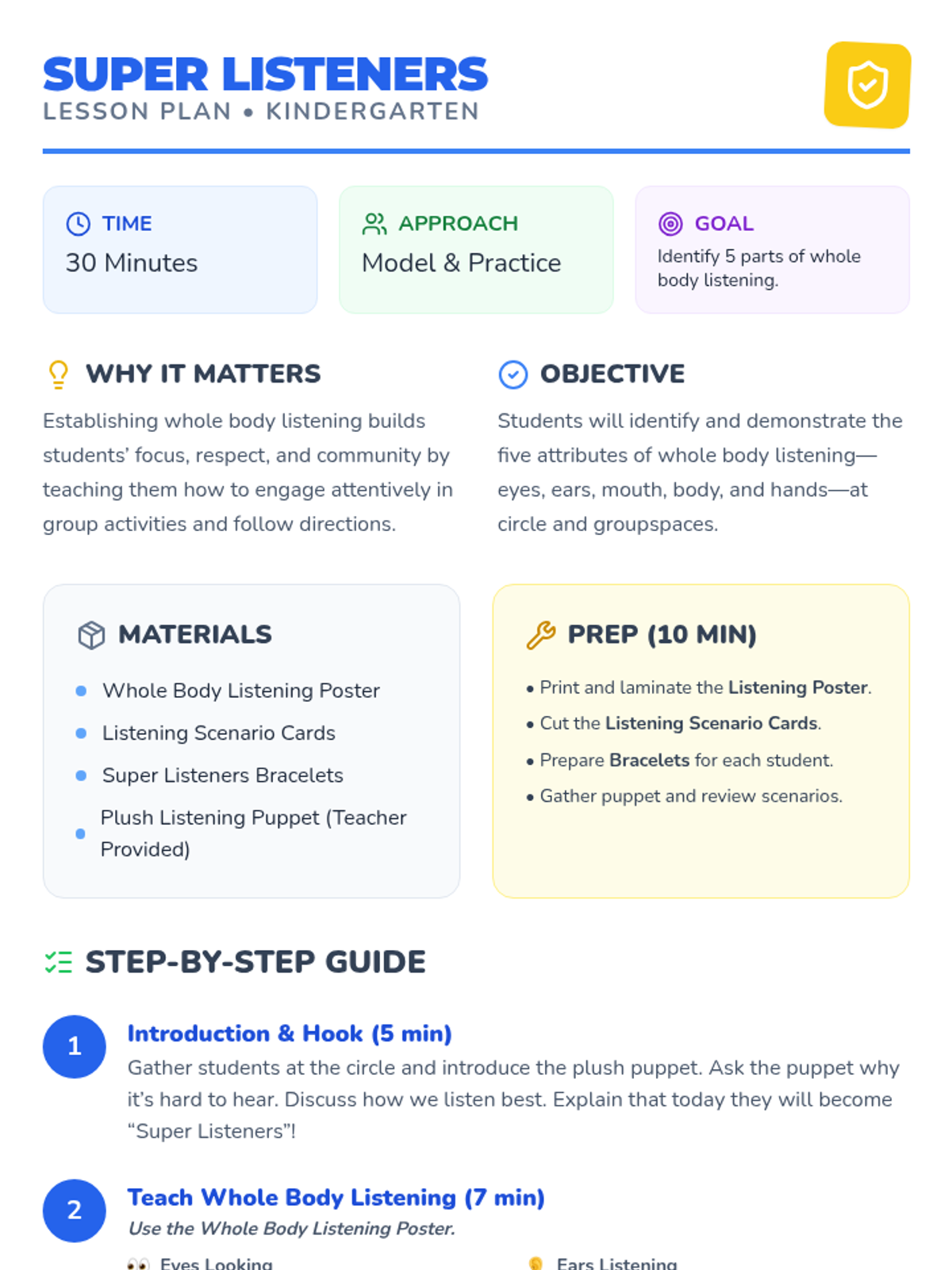 A 30-minute Tier 1 kindergarten lesson teaching Whole Body Listening through interactive demos, visuals, and role-play to build focus and cooperation.