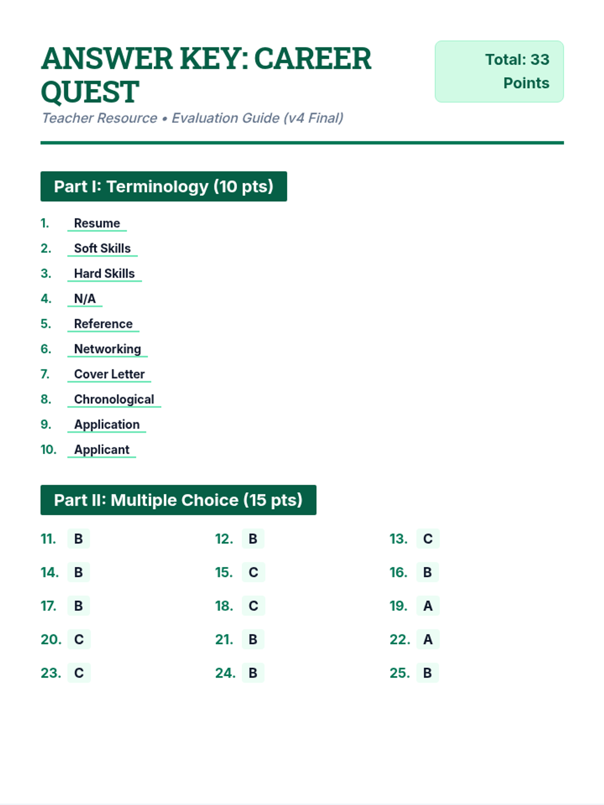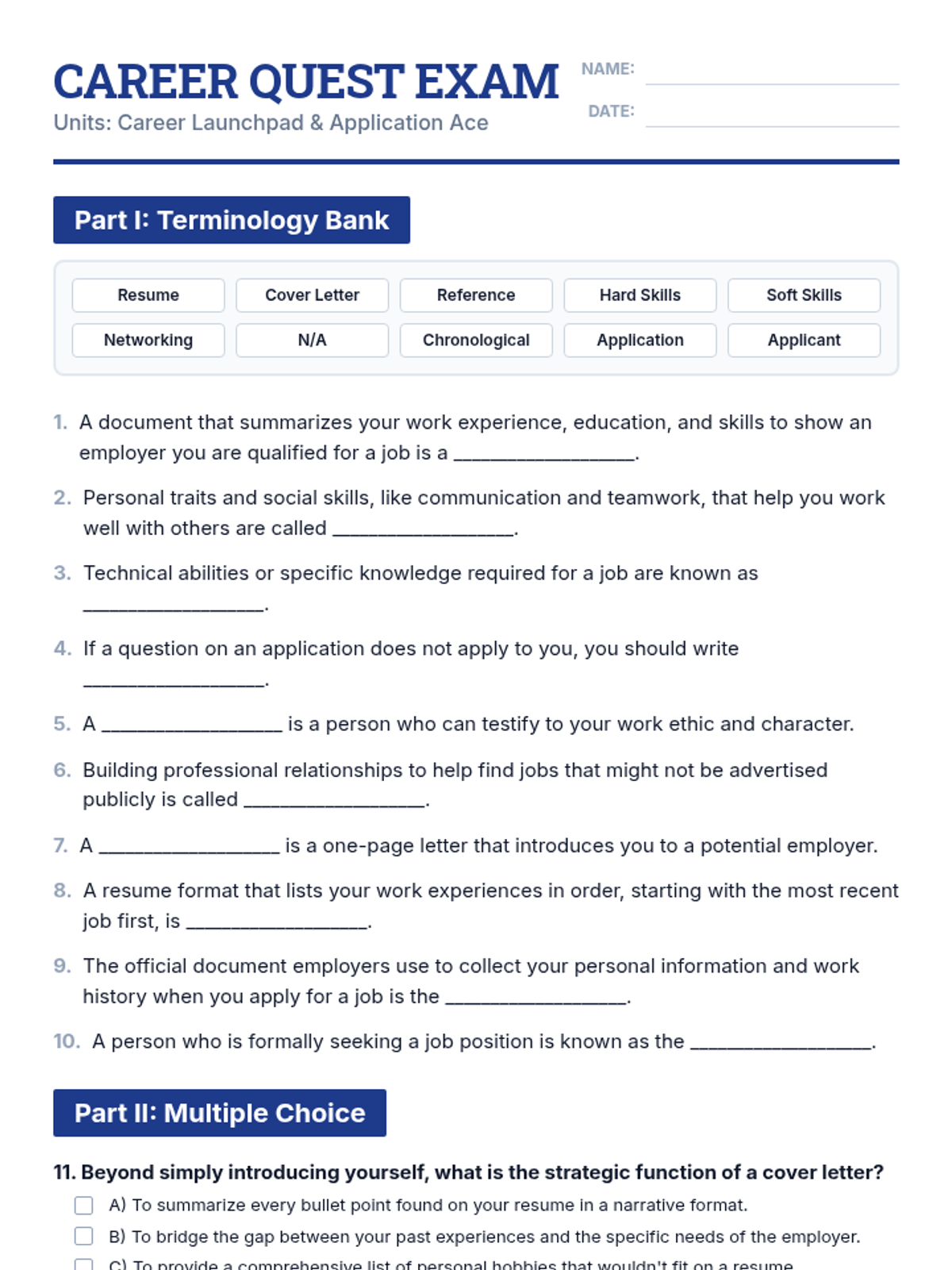 A final assessment module to evaluate student understanding of career readiness concepts and application proficiency.