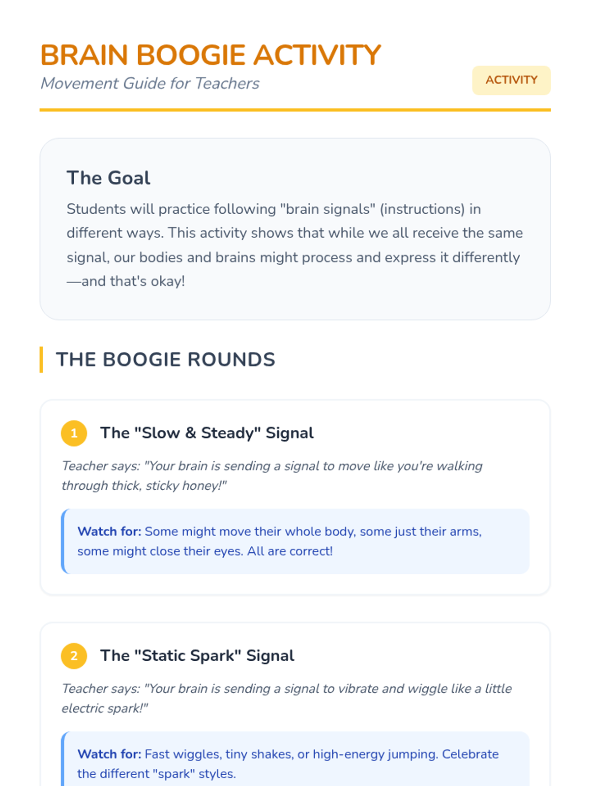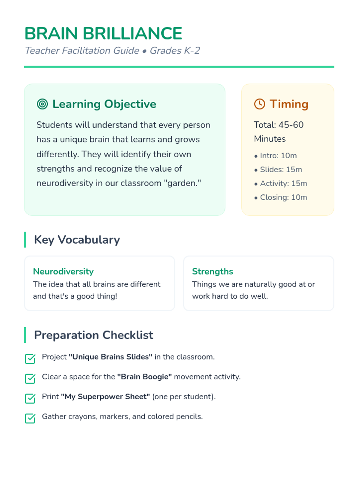 A foundational lesson for K-2 students exploring the concept that every brain is unique, highlighting different learning styles and individual strengths through movement and art.