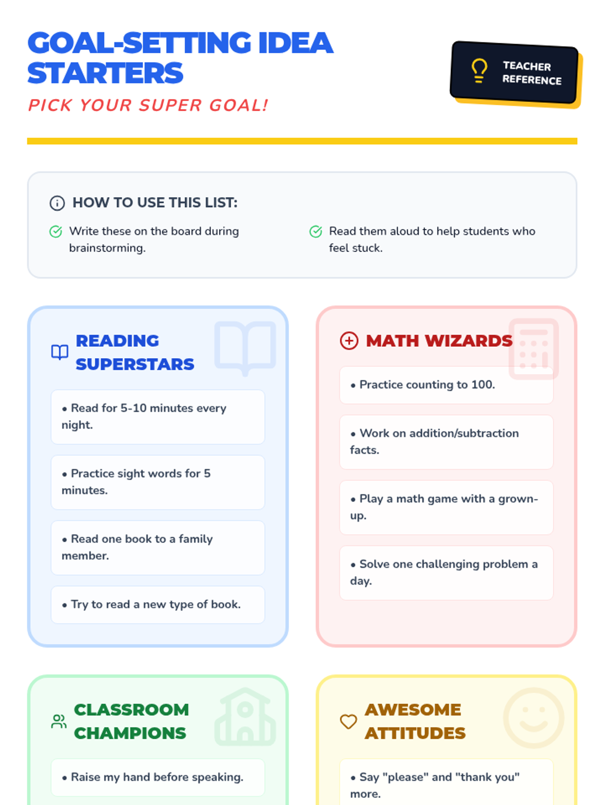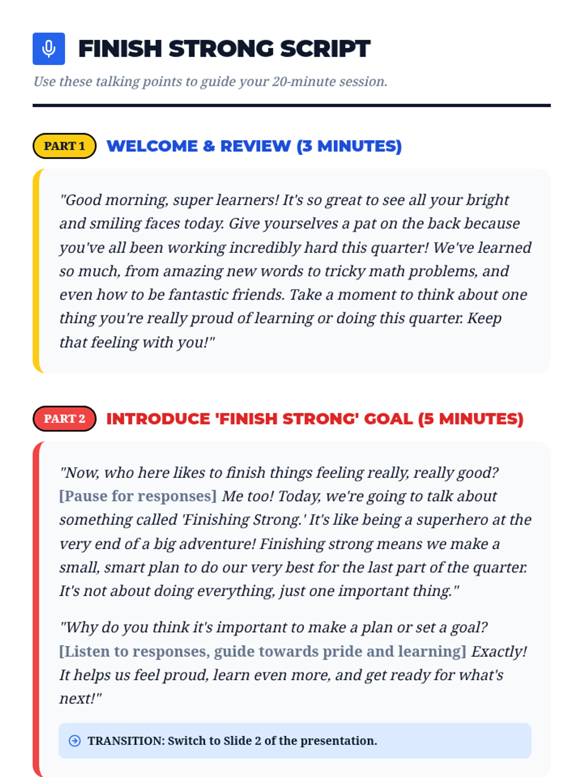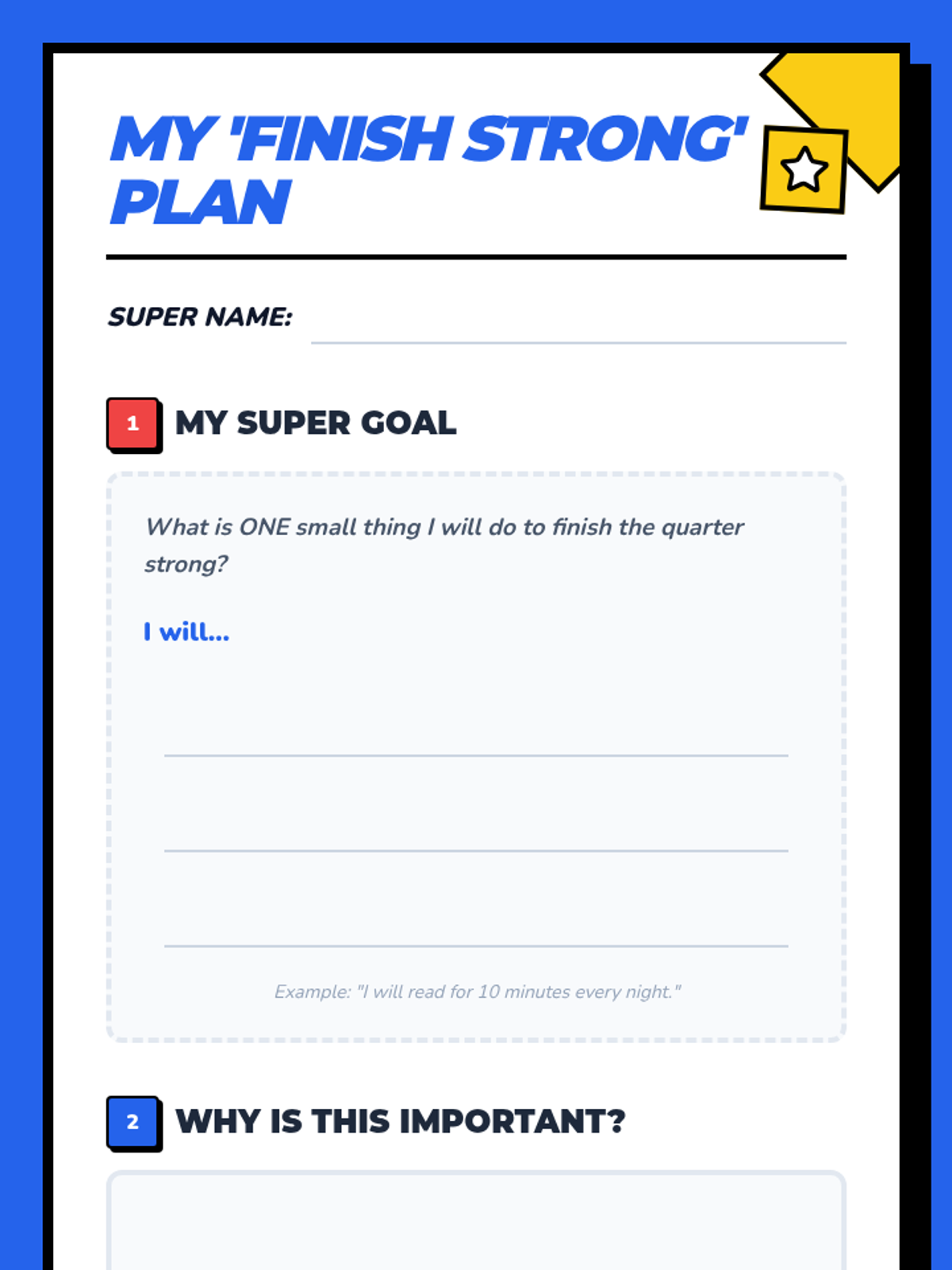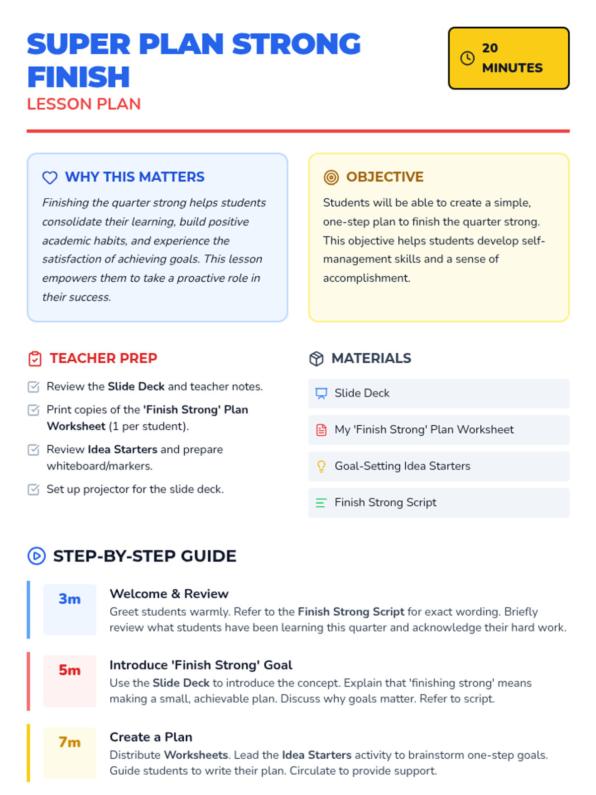 A 20-minute 1st-grade lesson focused on setting a simple, one-step goal to finish the quarter successfully. Students learn the concept of 'finishing strong' and create their own action plans to build positive habits.