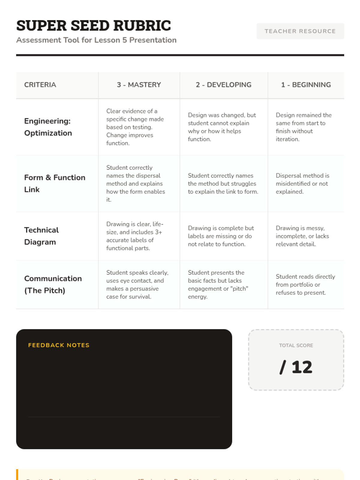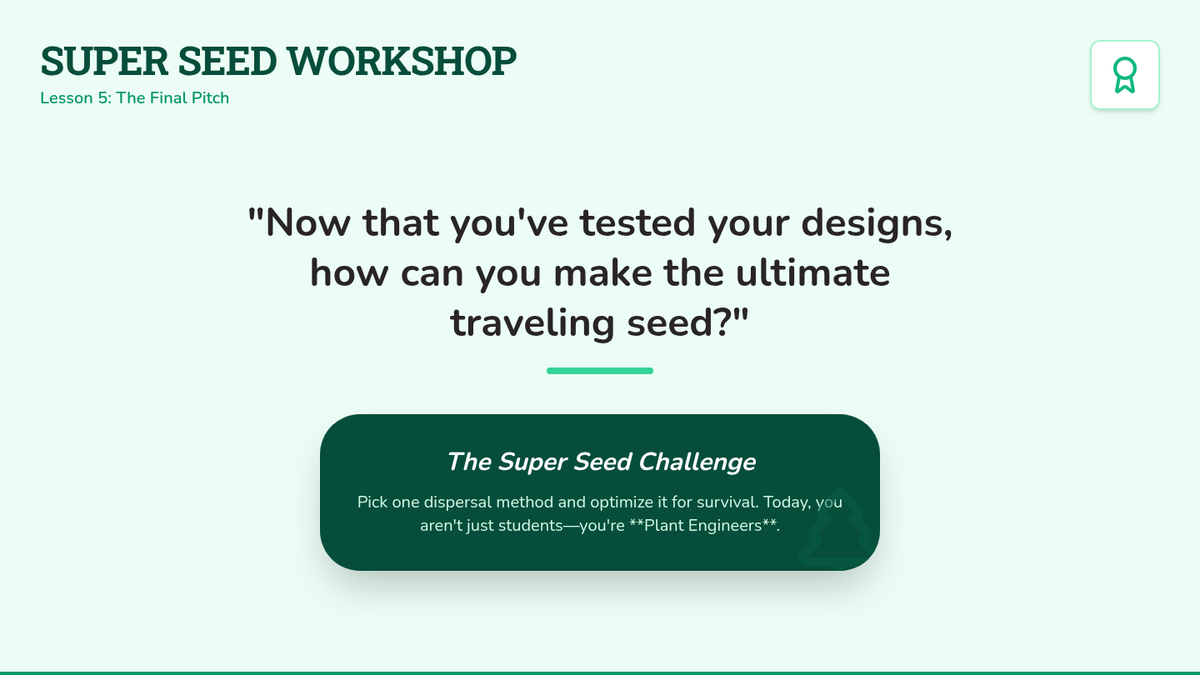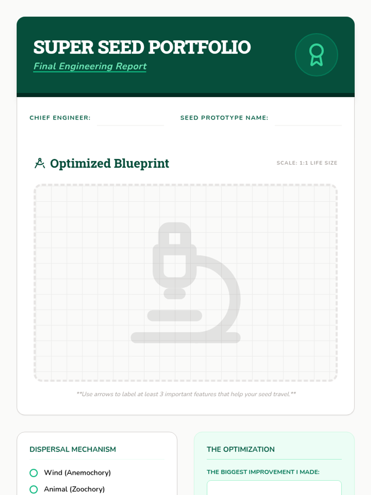 Students synthesize their learning by optimizing a final seed dispersal prototype and presenting their 'Super Seed' design to the class.