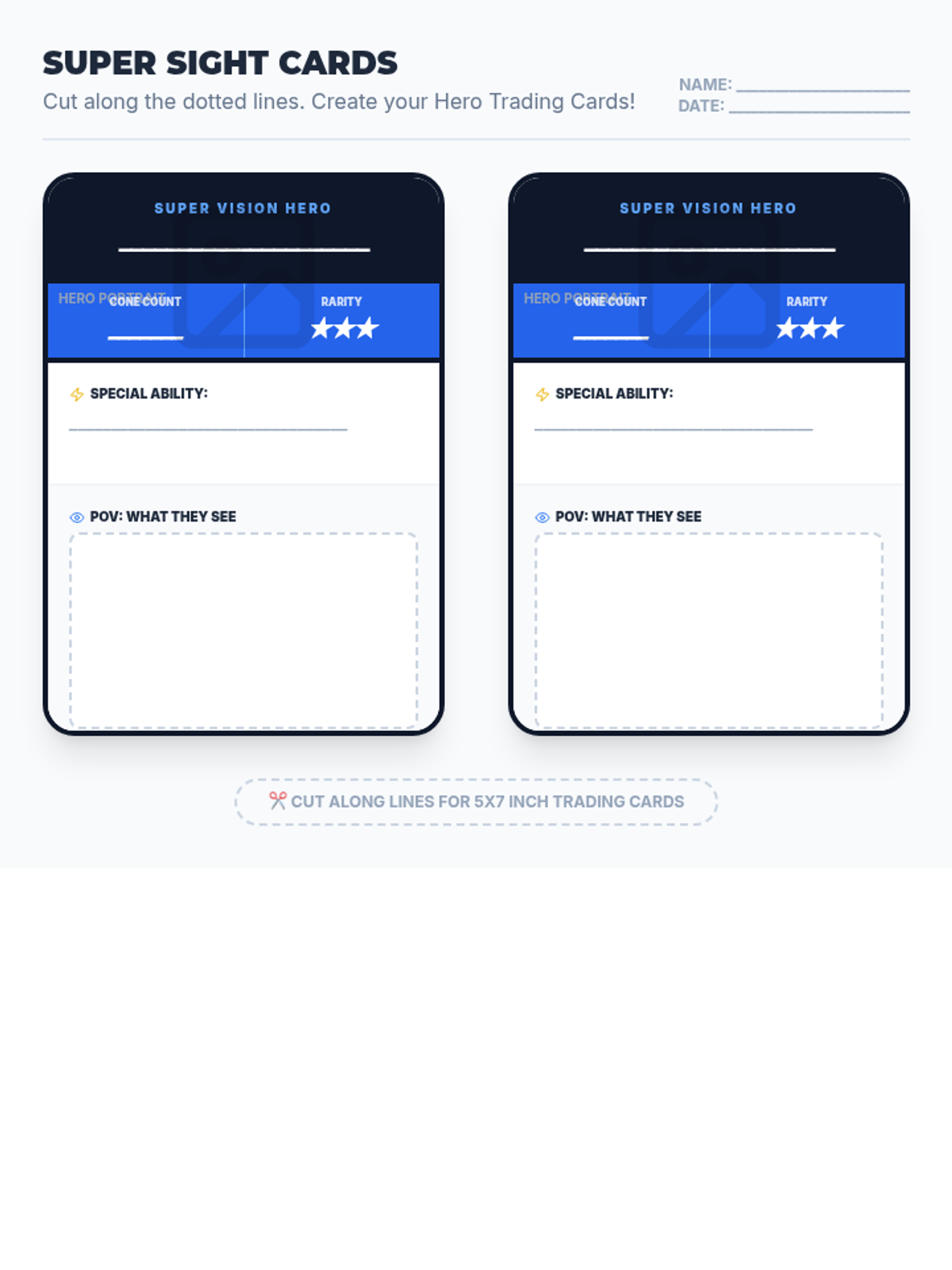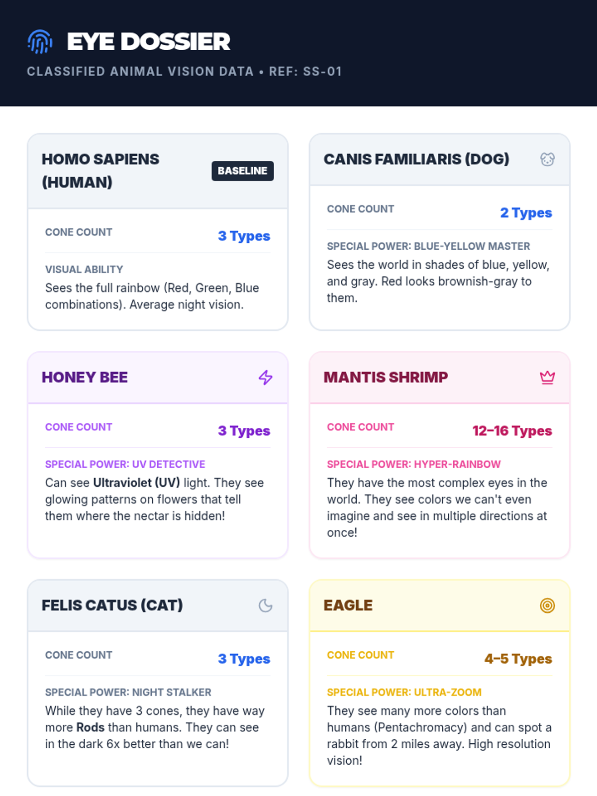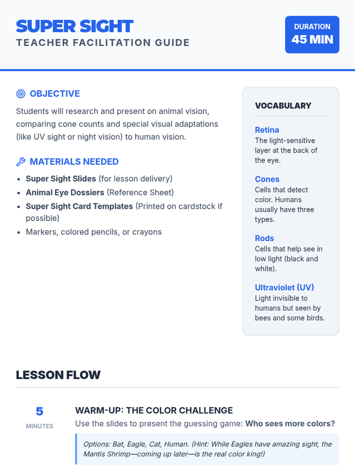 Students explore the science of color vision by comparing human eyes to animal eyes. They research cone counts and special visual abilities to create superhero-themed trading cards for various animals.