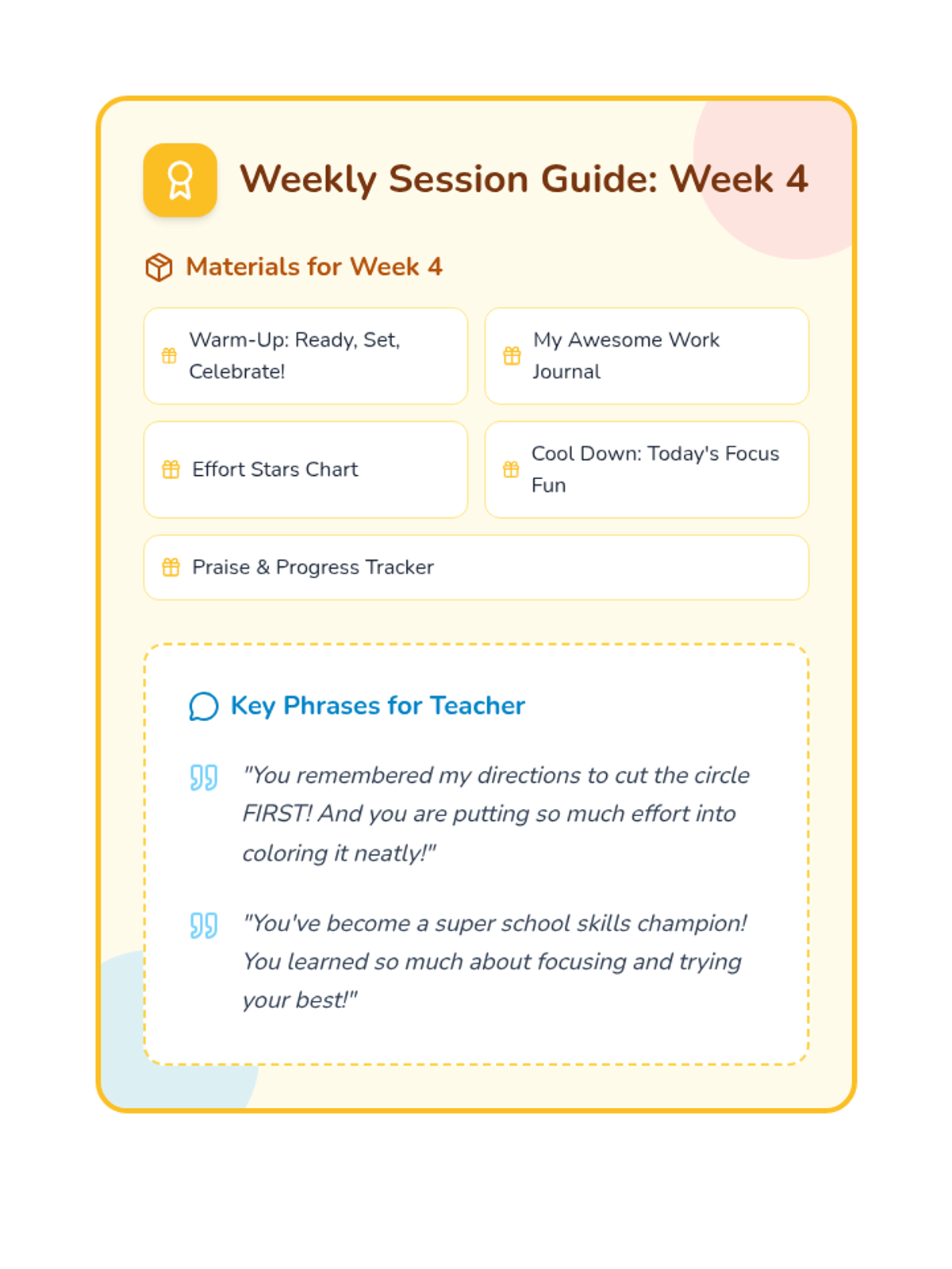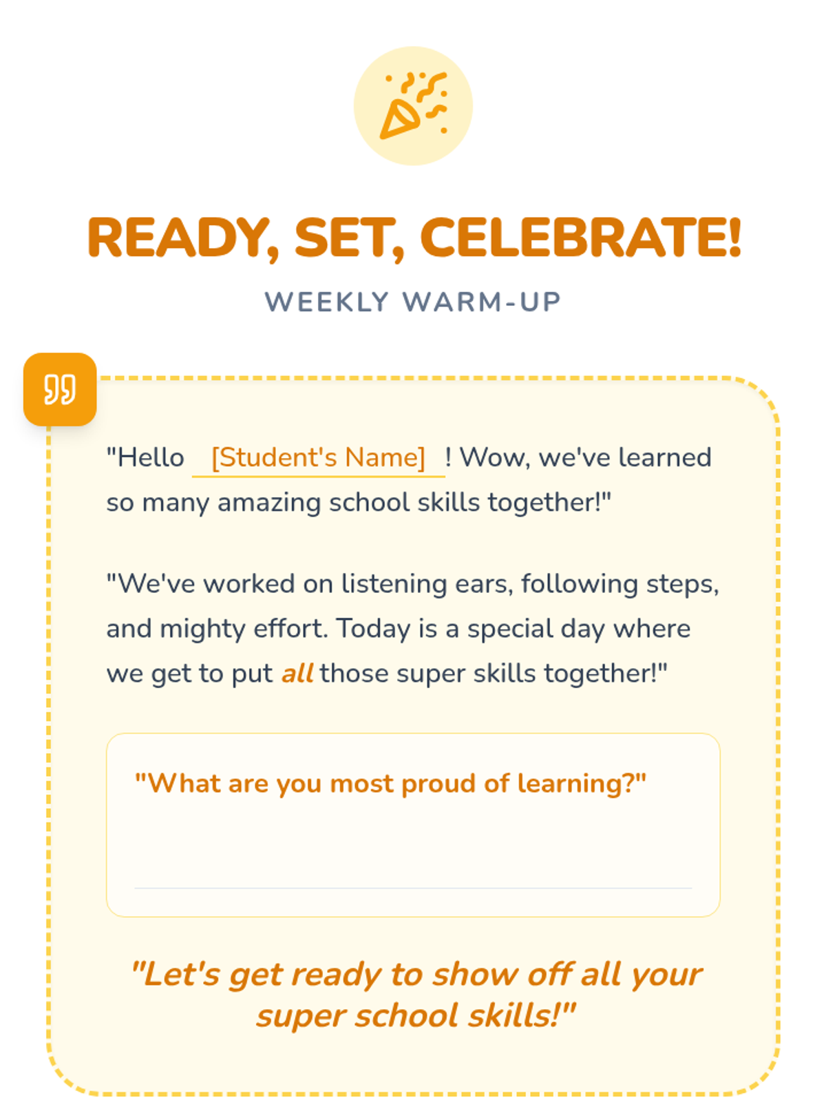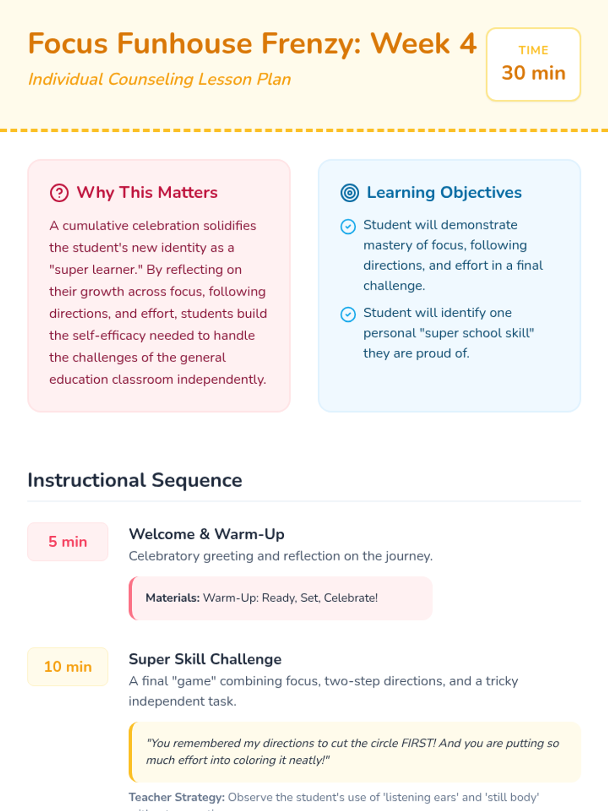 A cumulative session celebrating the student's progress and mastery of focus, following directions, and effort.