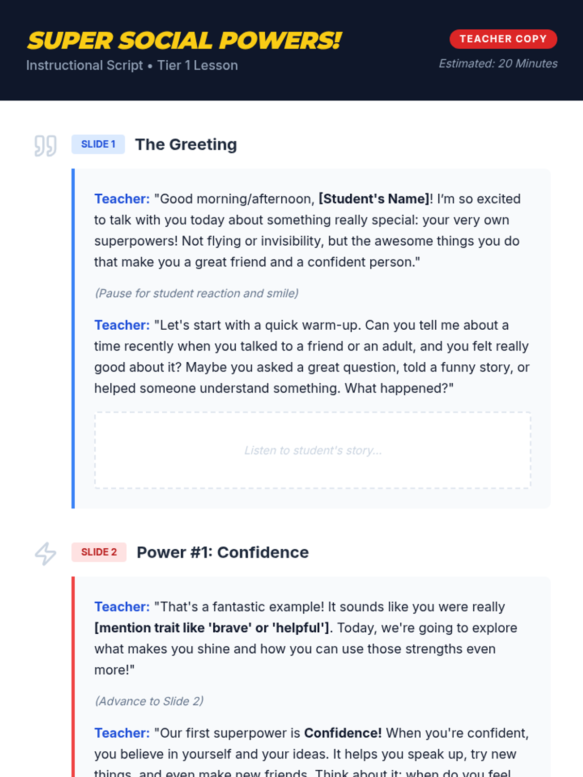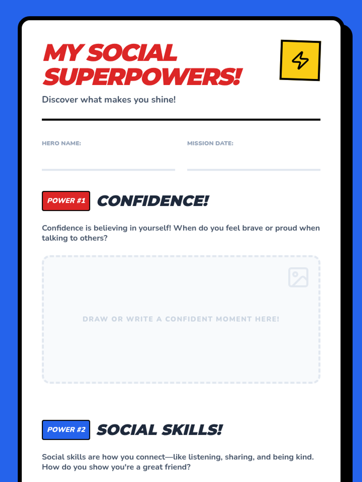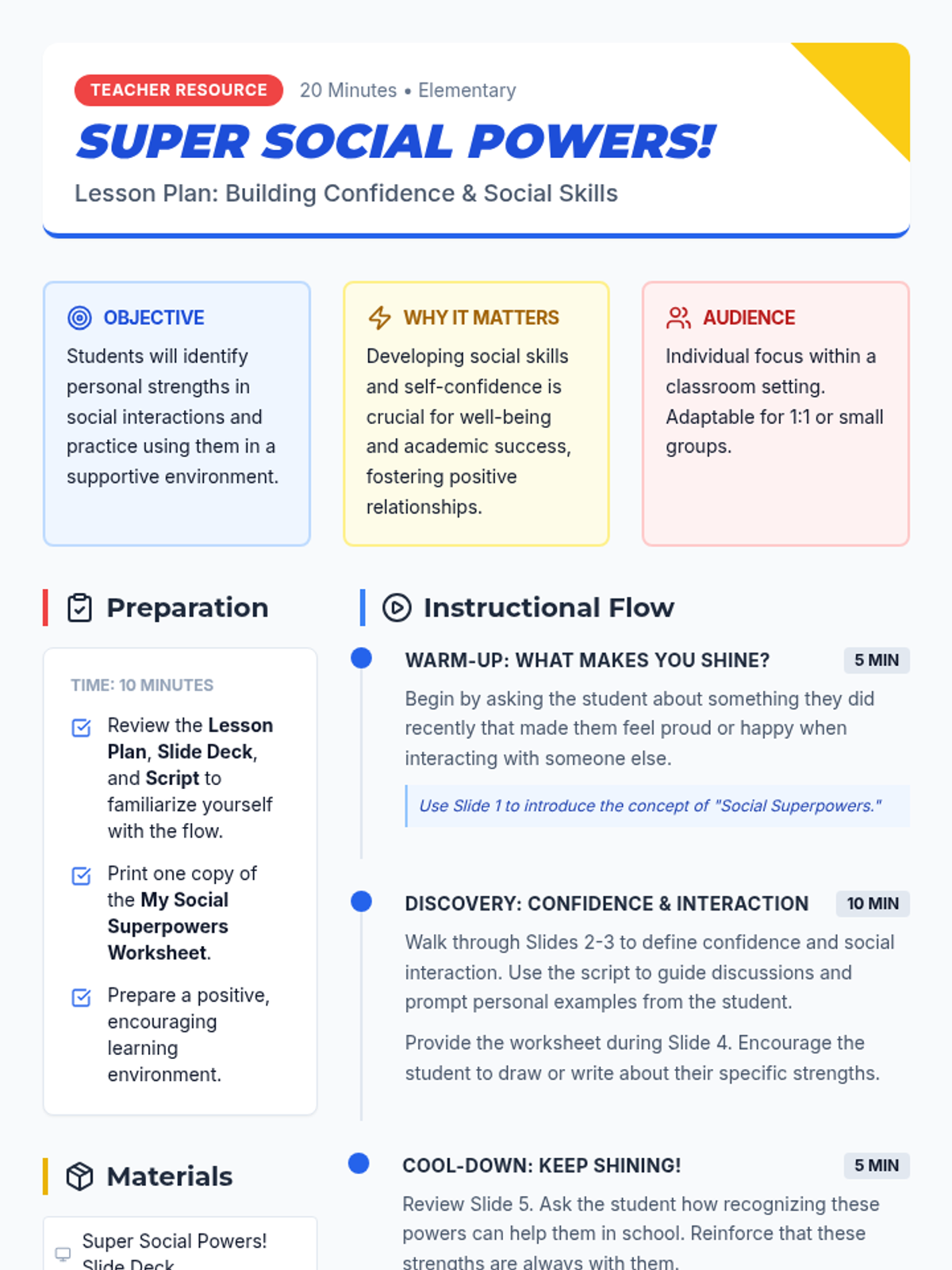 A 20-minute lesson designed to help elementary students recognize and celebrate their strengths in confidence and social interaction through a superhero-themed exploration.