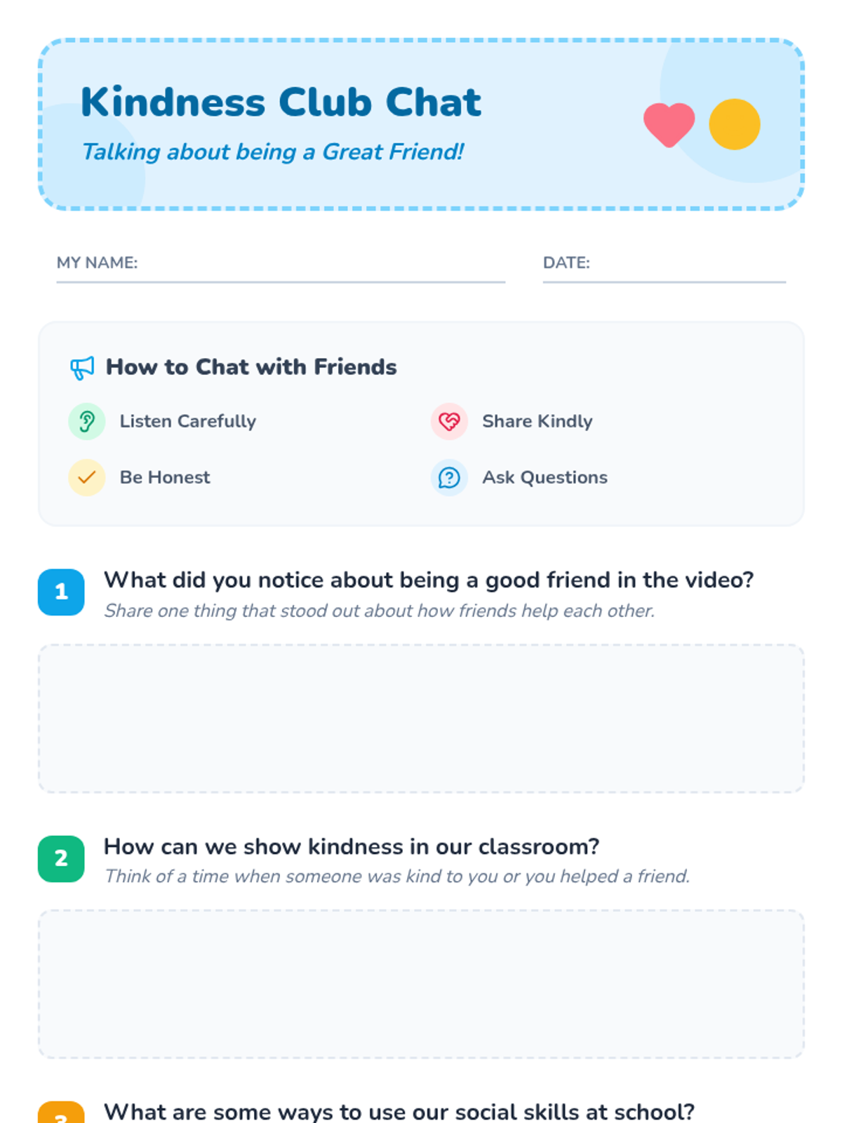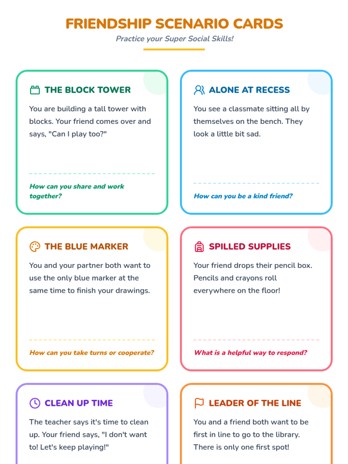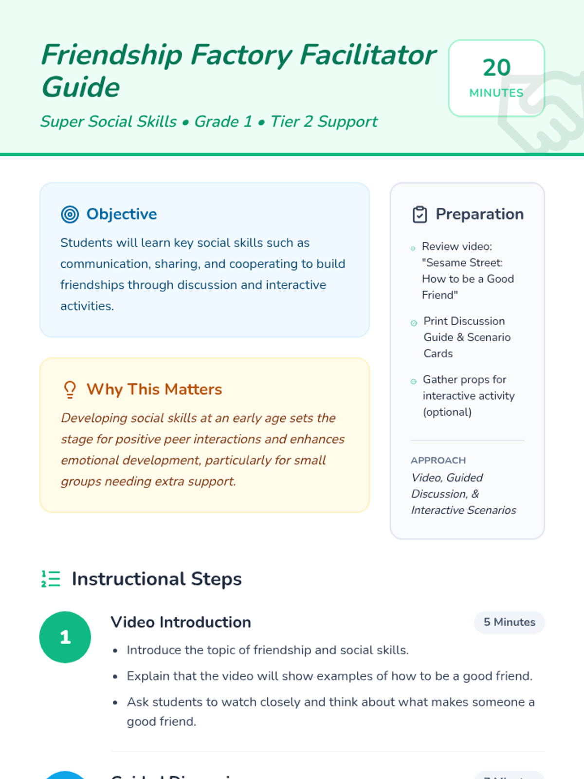 A 20-minute Tier 2 social skills lesson for 1st graders focused on building friendships through communication, sharing, and cooperation. Includes a video discussion, guided reflection, and scenario-based interactive practice.