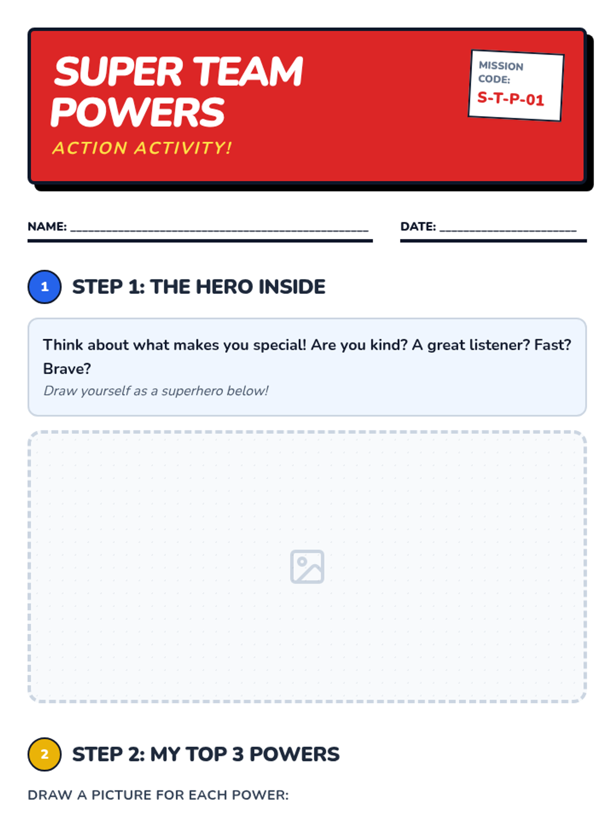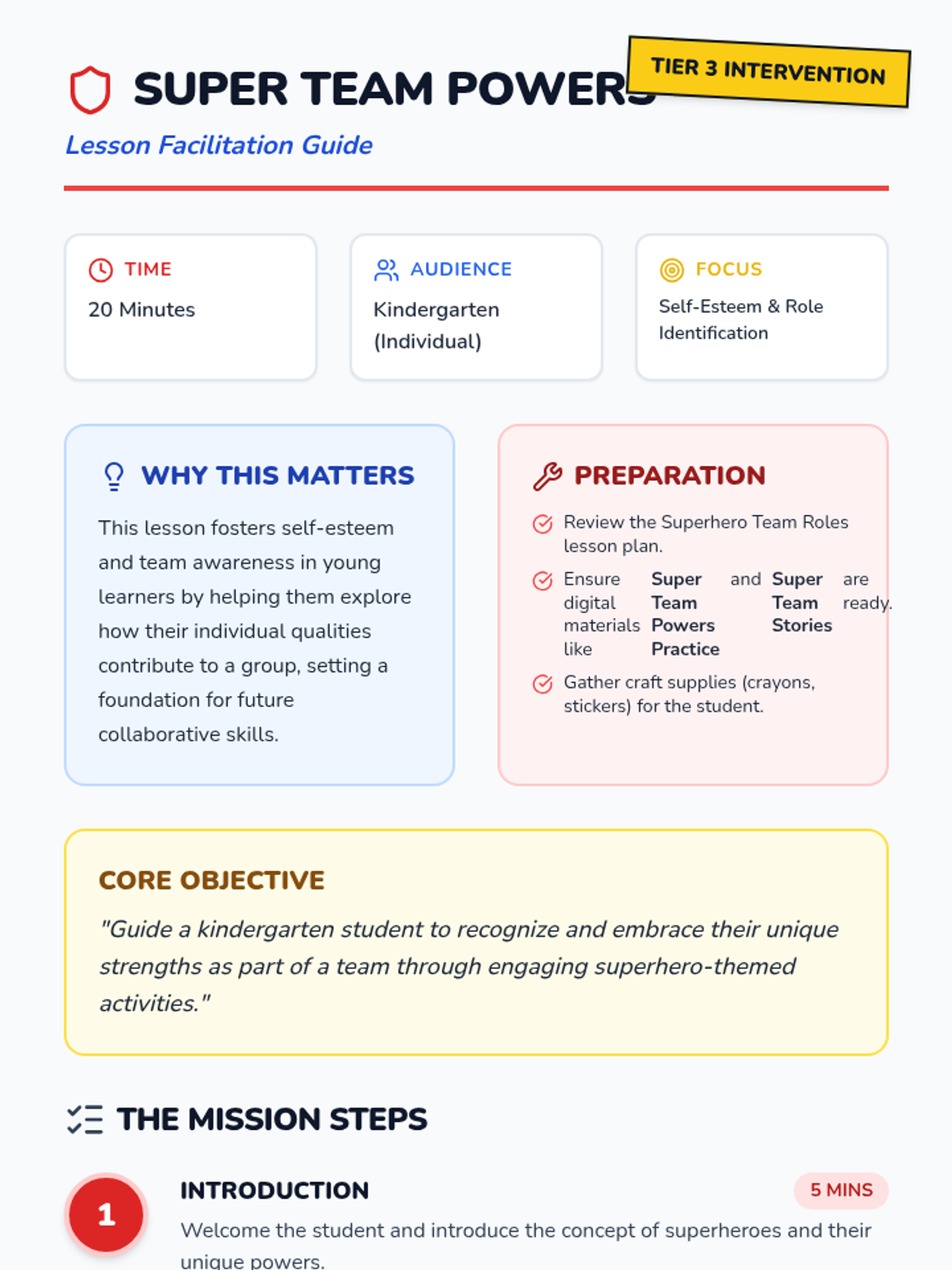 A 20-minute individual intervention for kindergarteners to identify their unique strengths and understand their value in a team using a superhero theme.