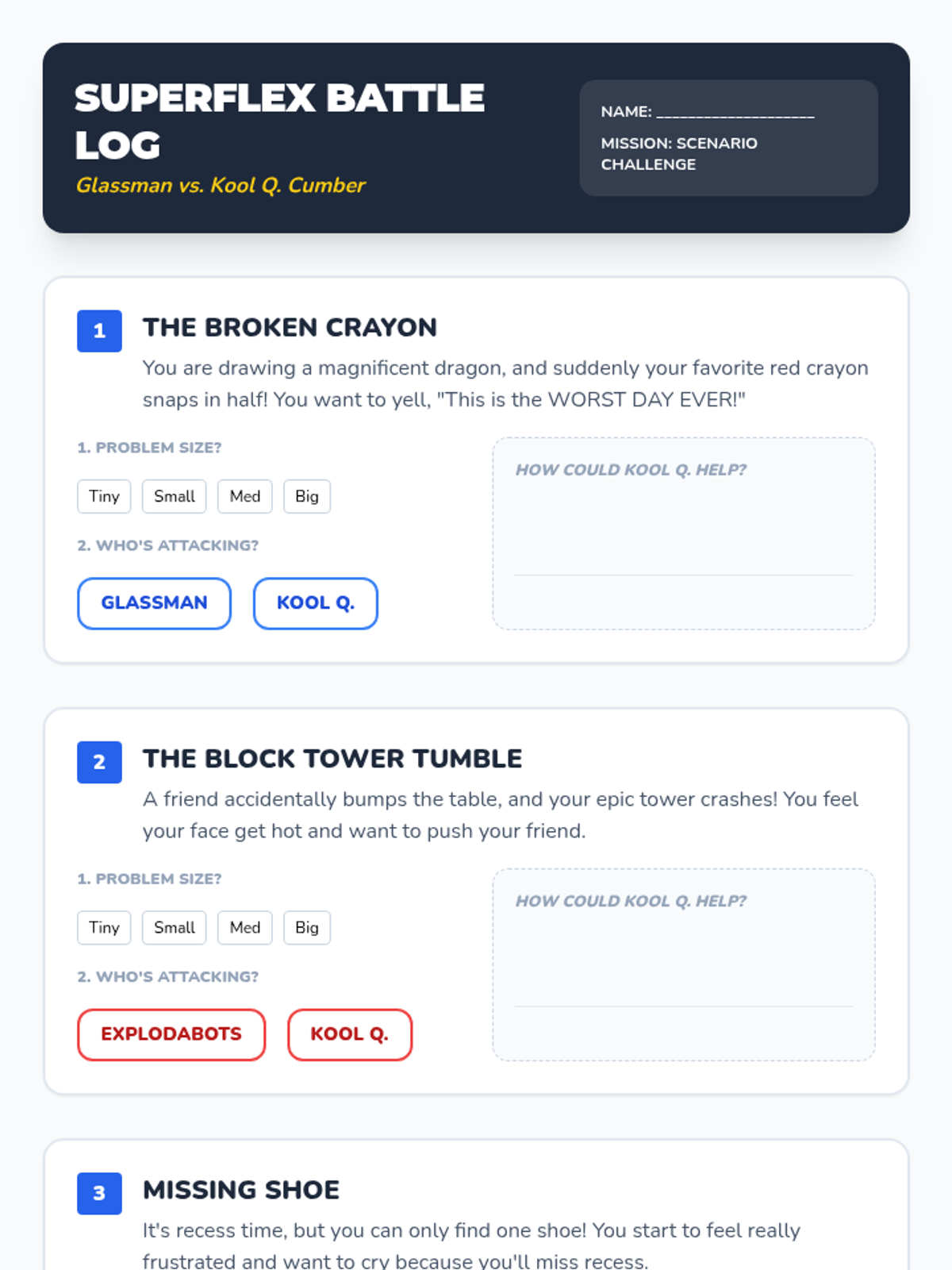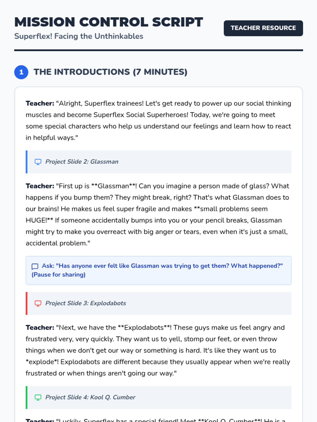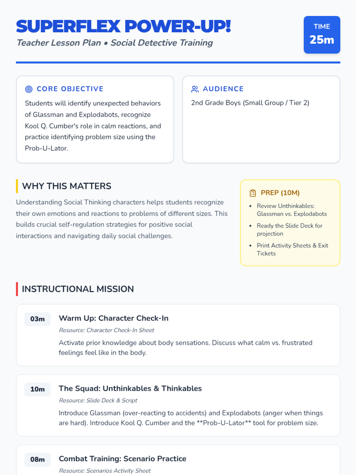 This lesson introduces 2nd-grade boys to the Social Thinking Superflex characters Glassman, Explodabots, and Kool Q. Cumber, focusing on identifying unexpected behaviors and practicing self-regulation strategies.