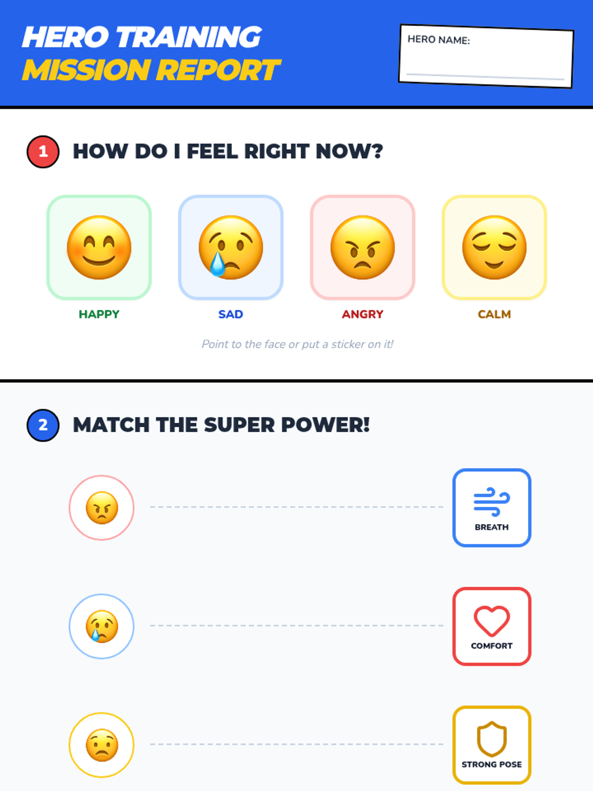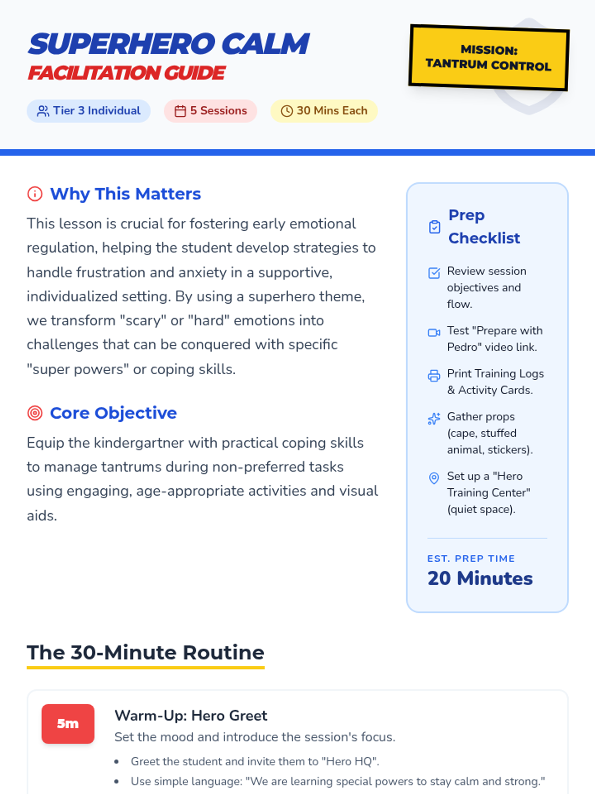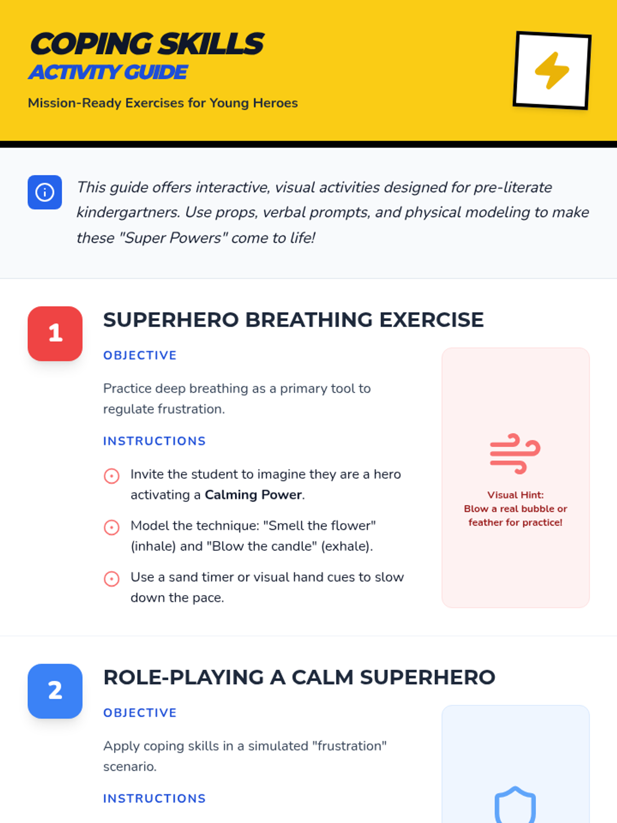 A 5-session individual intervention for kindergartners to develop emotional regulation and coping skills using a fun, superhero-themed approach. This lesson focuses on identifying feelings, practicing deep breathing, and using role-play to manage frustration during non-preferred tasks.