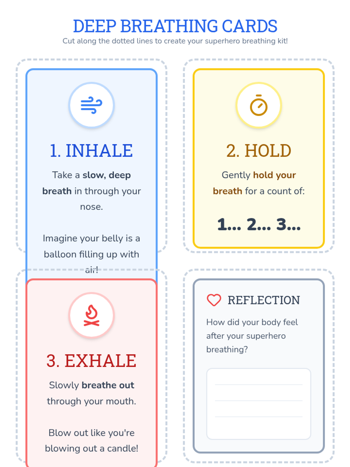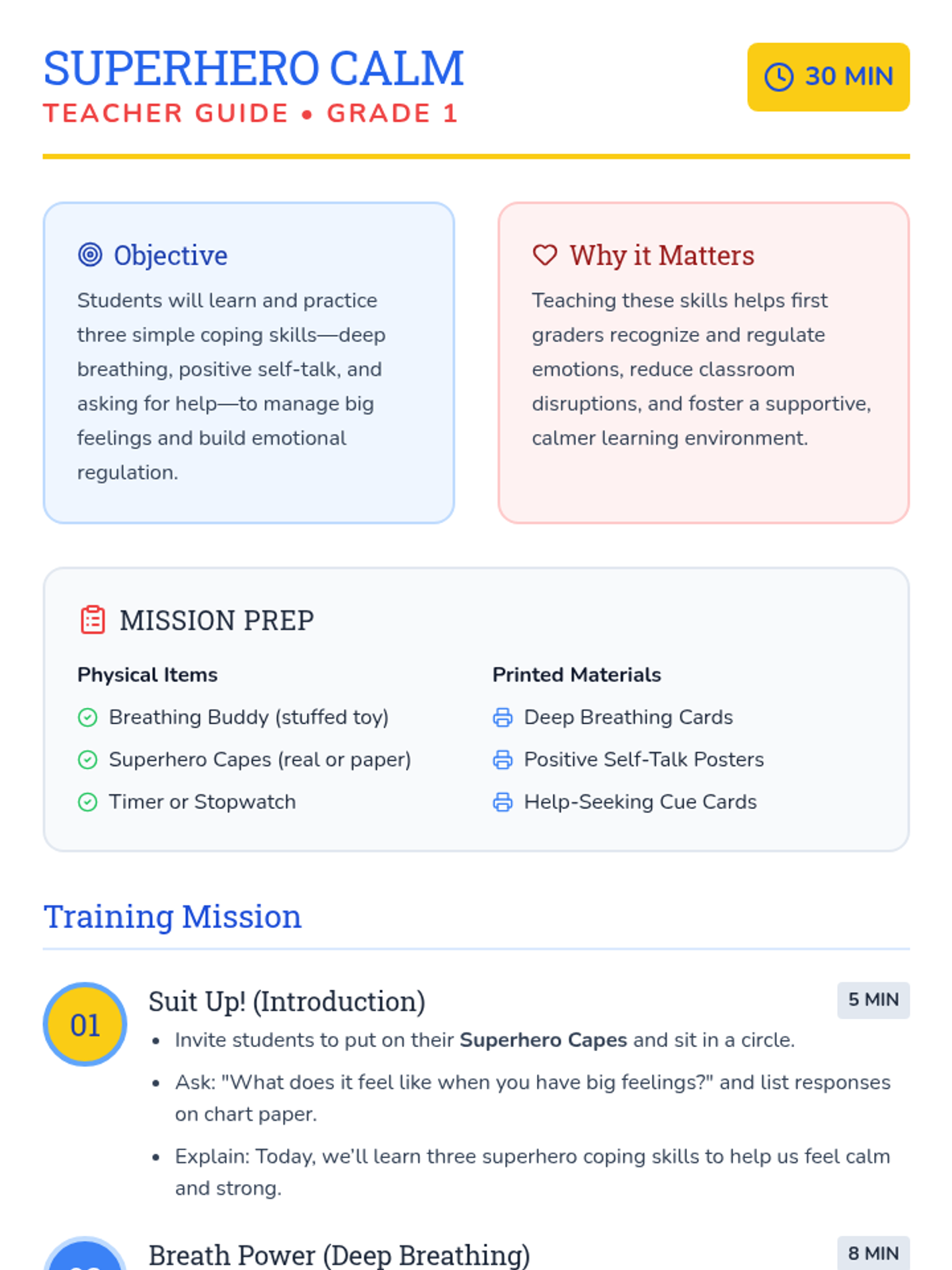 A 30-minute lesson for first graders to learn coping skills like deep breathing, positive self-talk, and asking for help through a fun superhero theme.