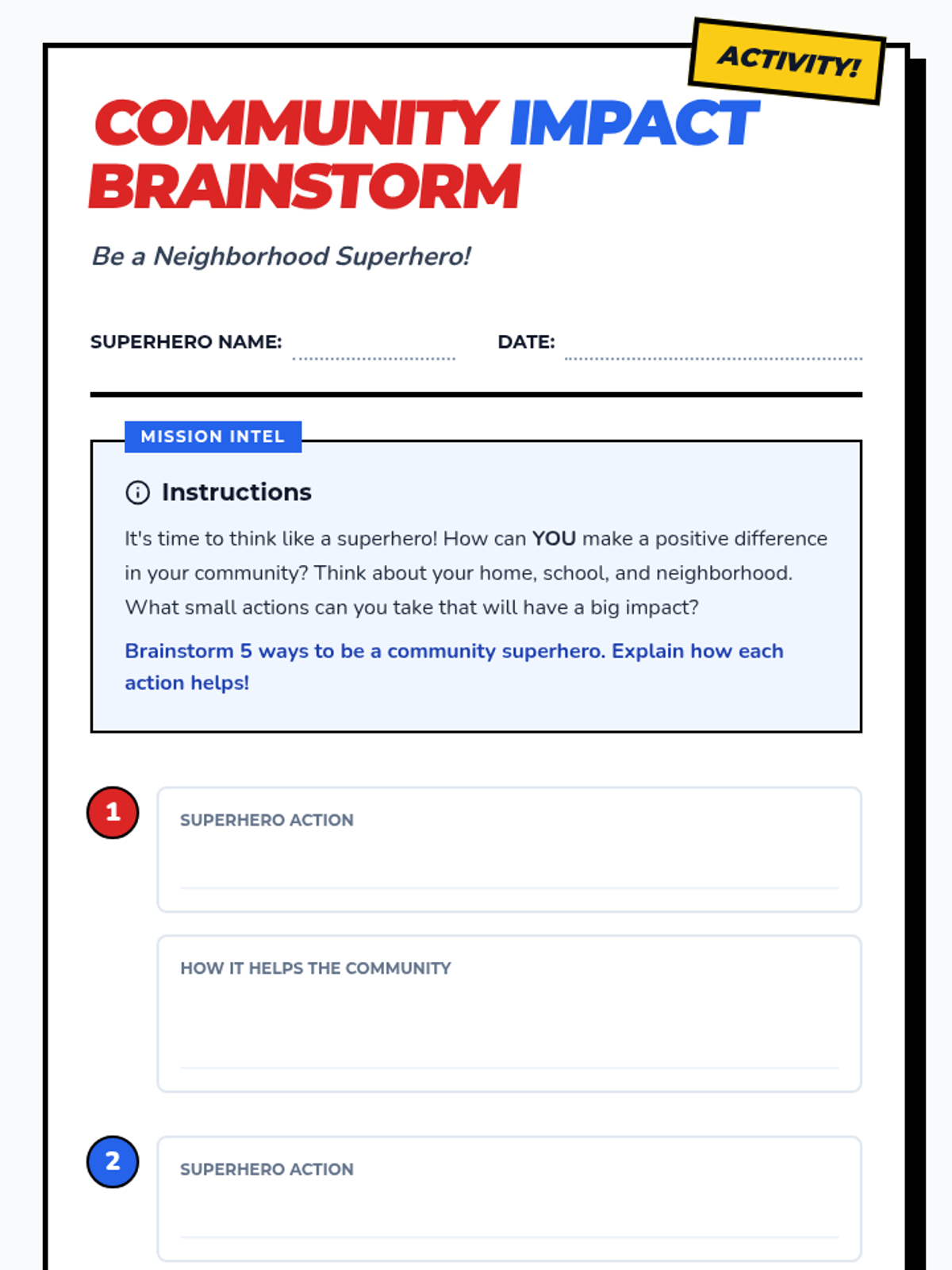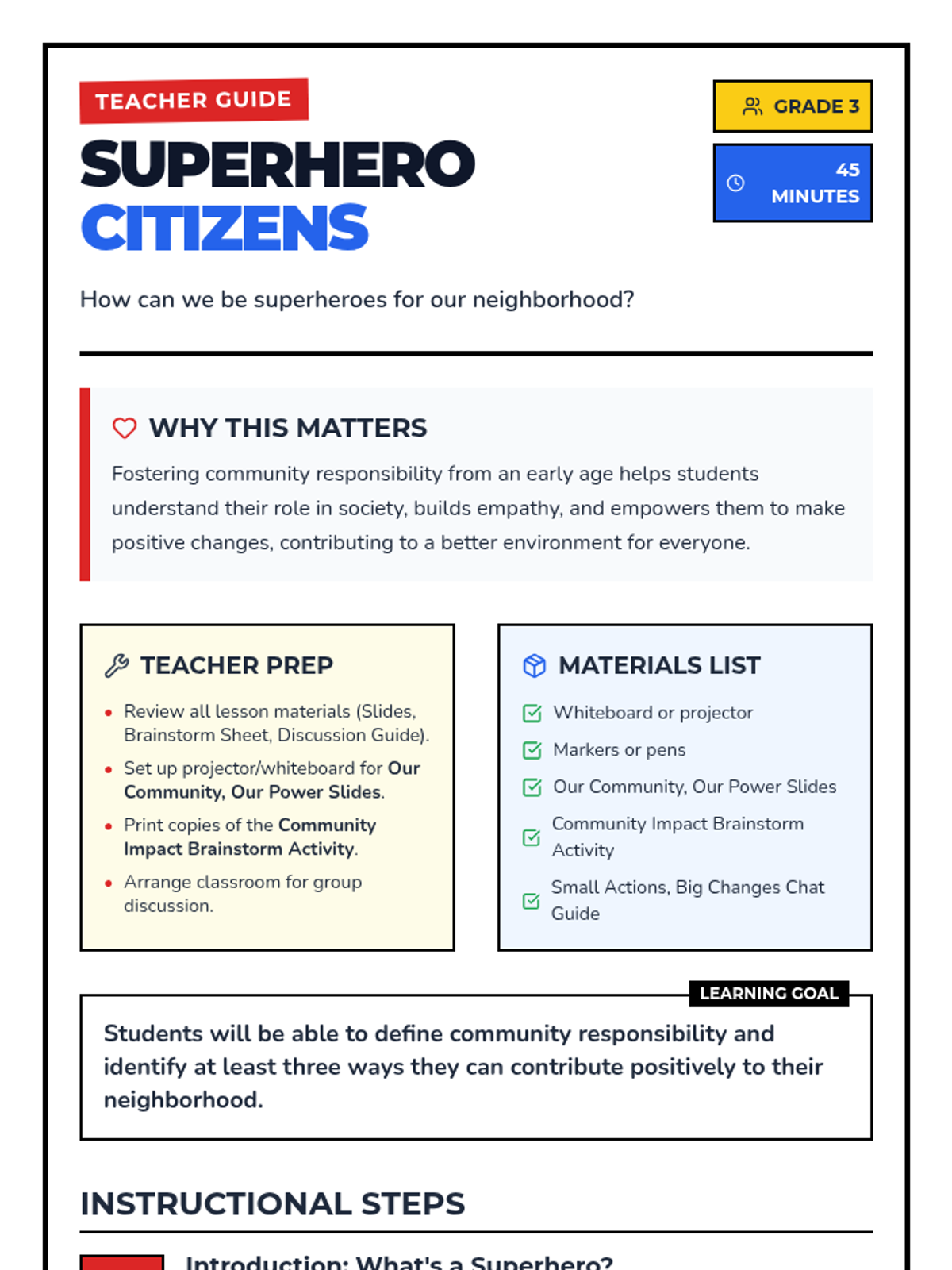 A 45-minute lesson for 3rd graders on community responsibility, using a superhero theme to empower students to make positive changes in their neighborhoods.