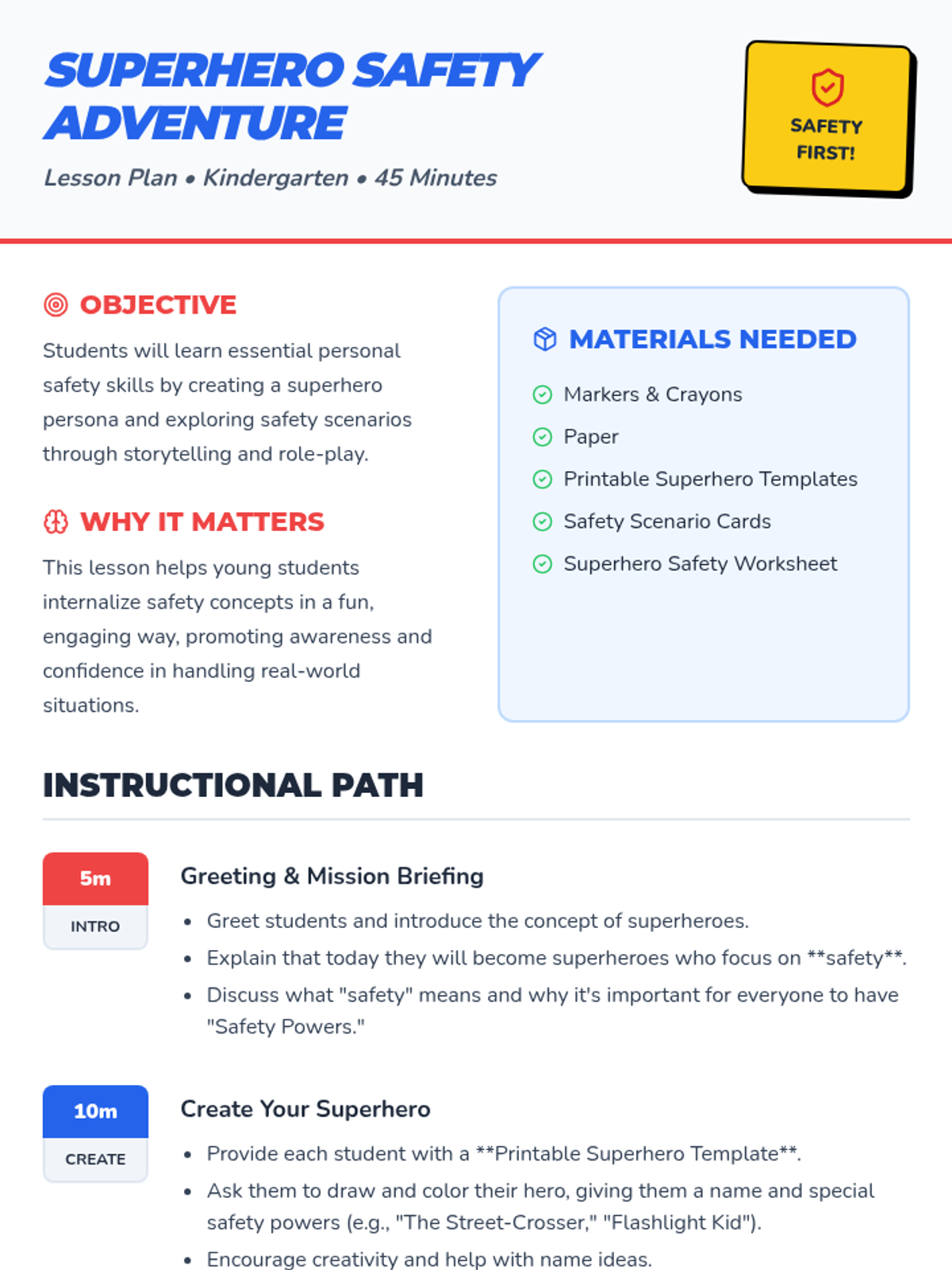 In this lesson, Kindergarten students will create their own superhero persona, focusing on safety skills. Through storytelling and creative play, they will learn about personal safety in various environments, from crossing the street to fire drills.