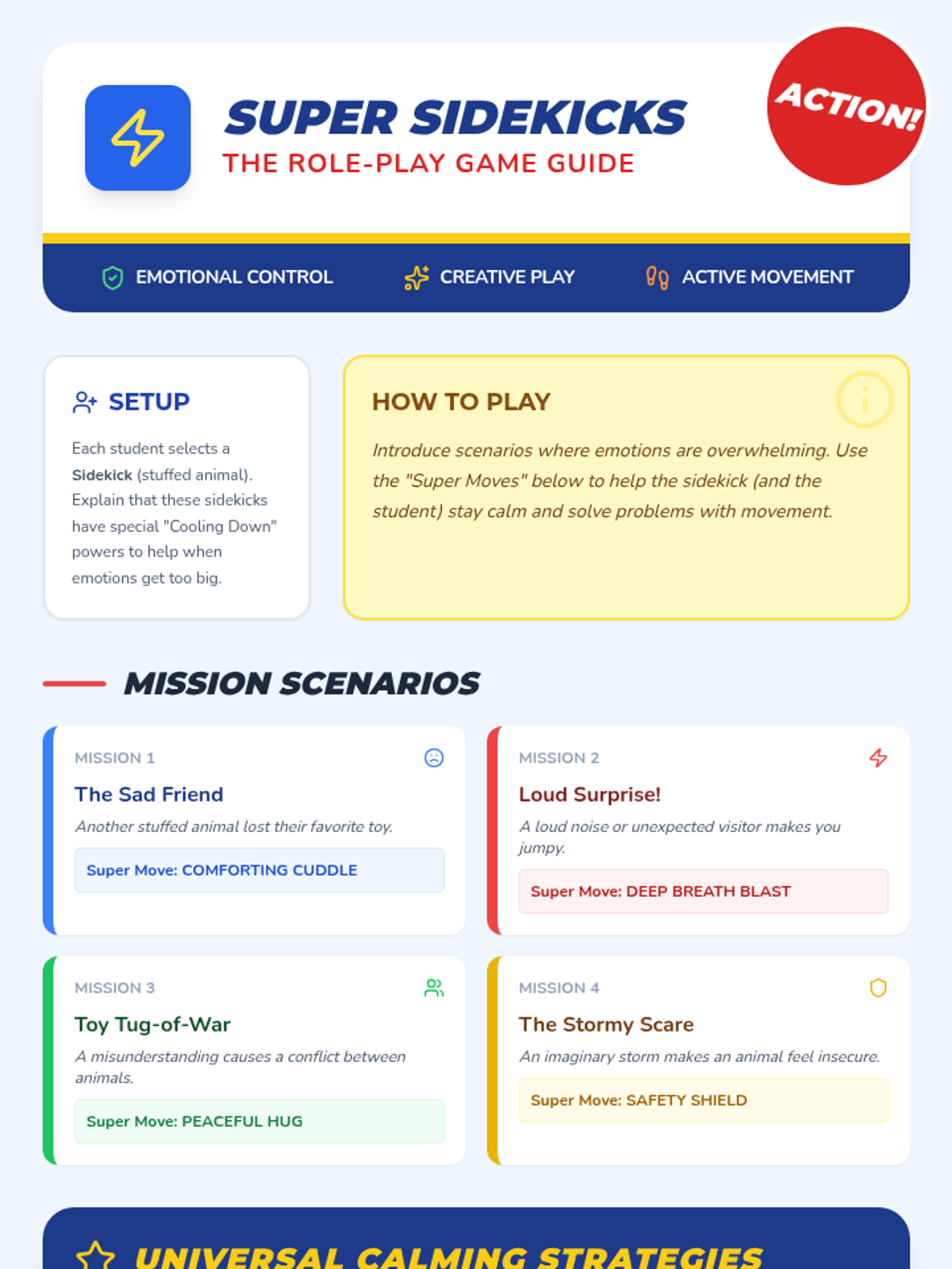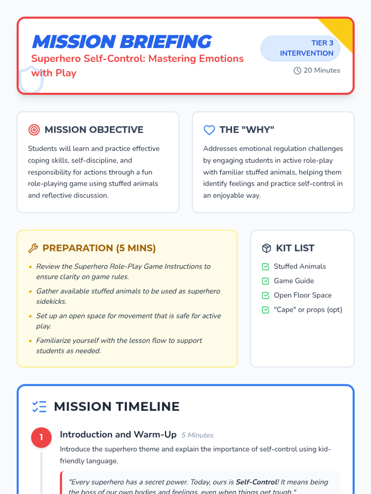 An intensive Tier 3 intervention for kindergarten students focusing on emotional regulation through movement and superhero-themed role-play with stuffed animals.