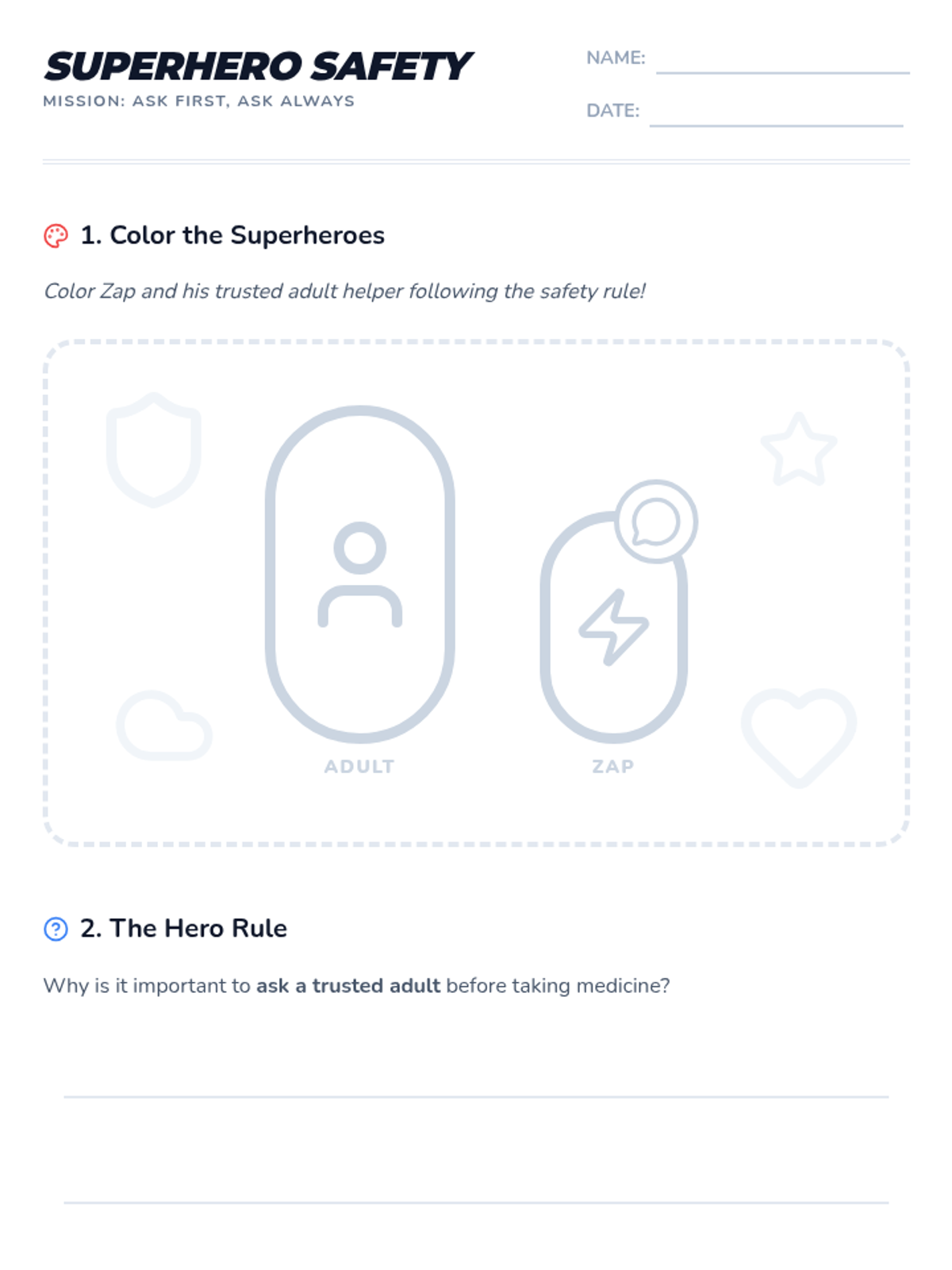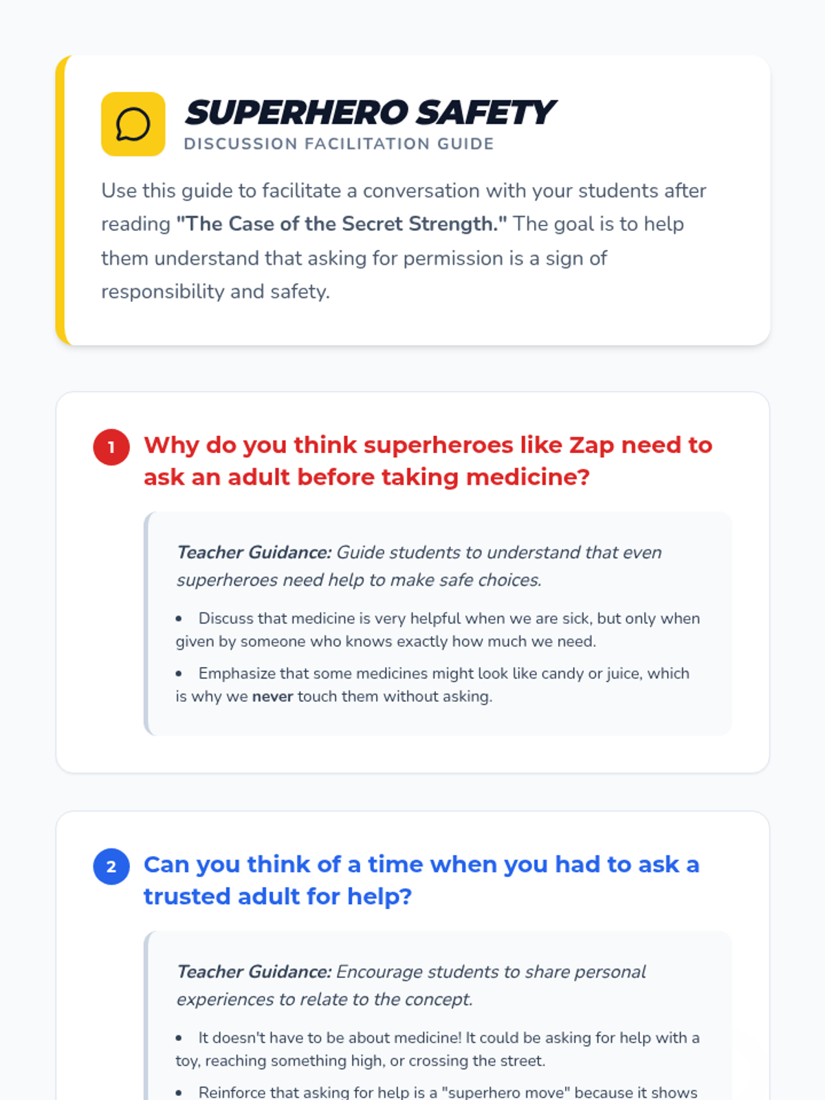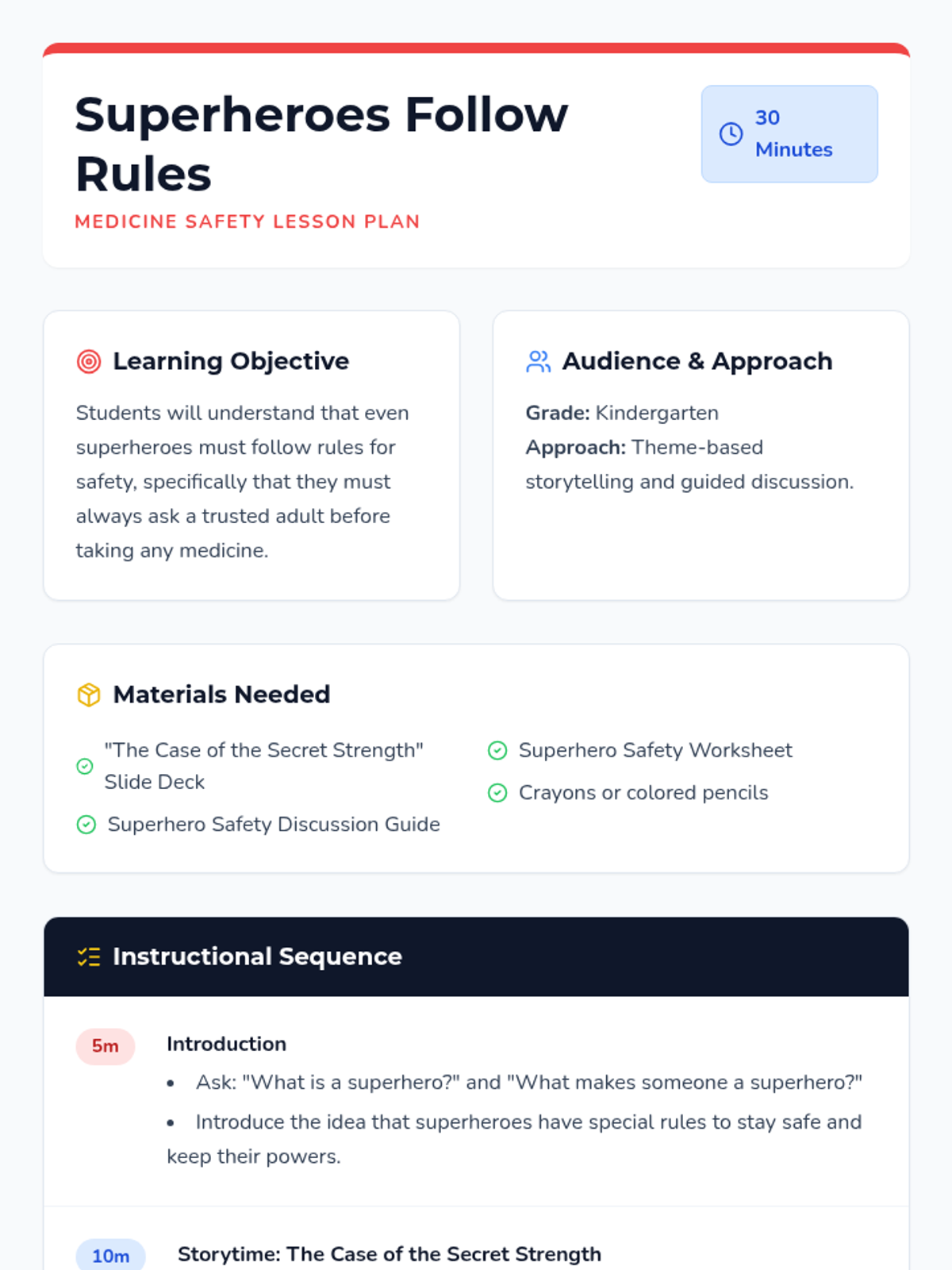 A kindergarten lesson using a superhero theme to teach the critical safety rule of always asking a trusted adult before taking medicine.