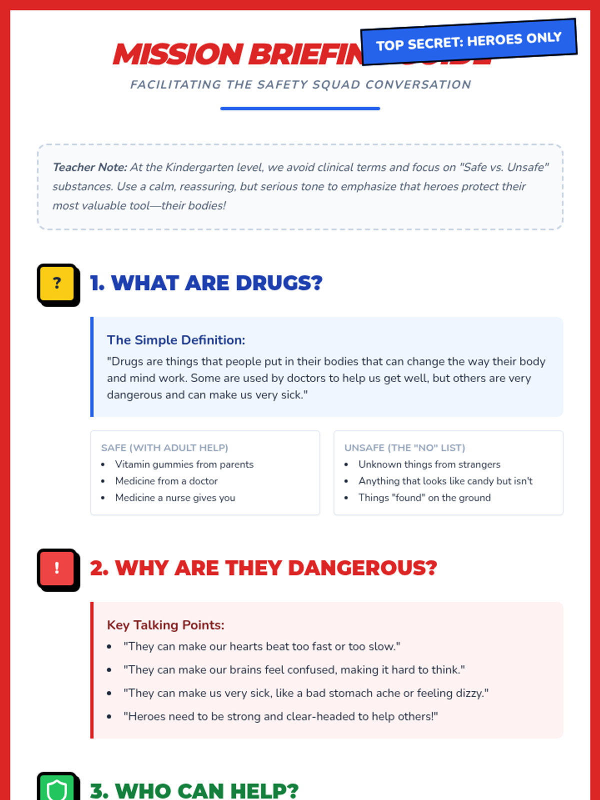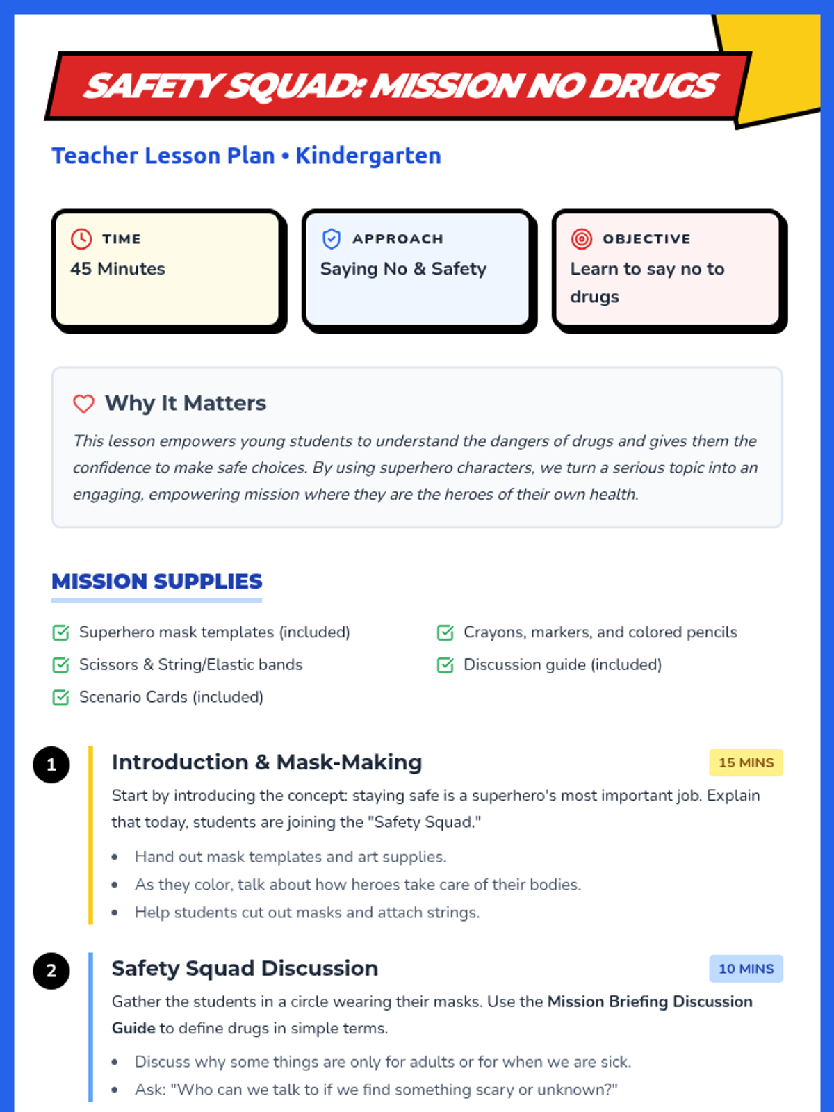 A Kindergarten lesson that uses a superhero theme to teach students about the importance of saying no to drugs and making safe choices. Students create masks, engage in discussions, and practice refusal skills through role-playing.
