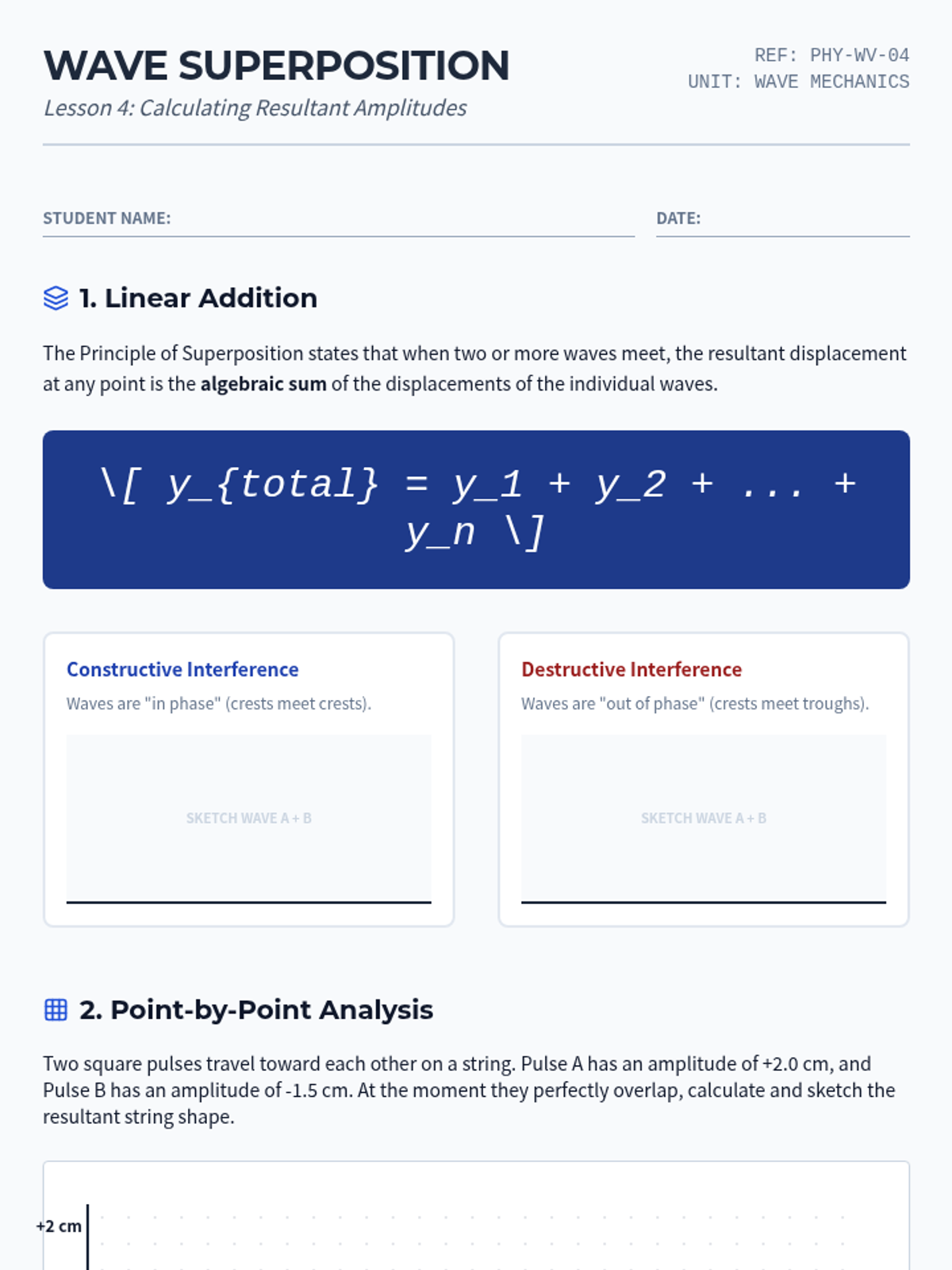 Calculate resultant amplitudes using the principle of superposition and analyze interference patterns.